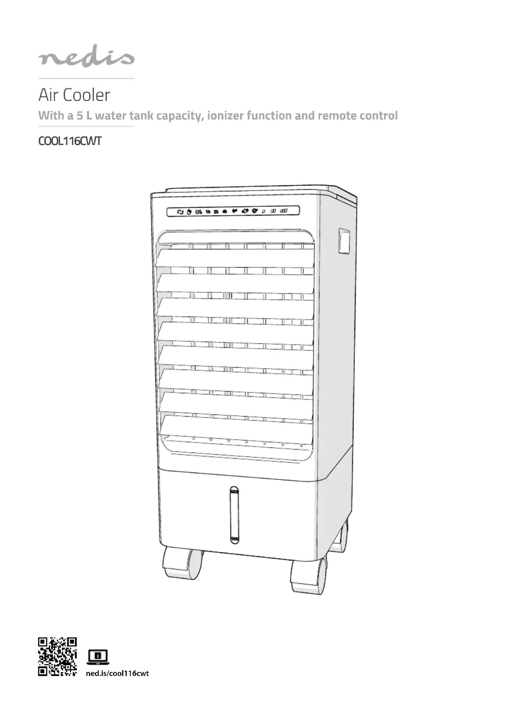 Guide de démarrage rapide Refroidisseur d'air COOL116CWTPour plus d'informations, consultez le manuel détaillé en ligne : ned.is/cool116cwt Utilisation prévue Le COOL116CWT Nedis est un refroidisseur d'air avec un réservoir d'eau d’une capacité de 5 L.Le produit n’est pas destiné à un usage professionnel.Ce produit peut être utilisé par des enfants âgés de 8 ans et plus ainsi que des personnes ayant des capacités physiques, sensorielles ou mentales réduites ou manquant d’expérience et de connaissances s’ils sont supervisés ou ont reçu des instructions sur l’utilisation du produit en toute sécurité et comprennent les dangers impliqués. Les enfants ne doivent pas jouer avec le produit. Le nettoyage et la maintenance ne doivent pas être eectués par des enfants sans surveillance.Toute modication du produit peut avoir des conséquences sur la sécurité, la garantie et le bon fonctionnement. Spécications Produit Refroidisseur d'airArticle numéro COOL116CWTDimensions (L x l x H) 240 x 560 x 260 mmPoids 3800 gAlimentation électrique 220 - 240 VAC ; 50 / 60 HzPuissance 65 WCapacité du réservoir d'eau 5 LVolume d'air 215 m