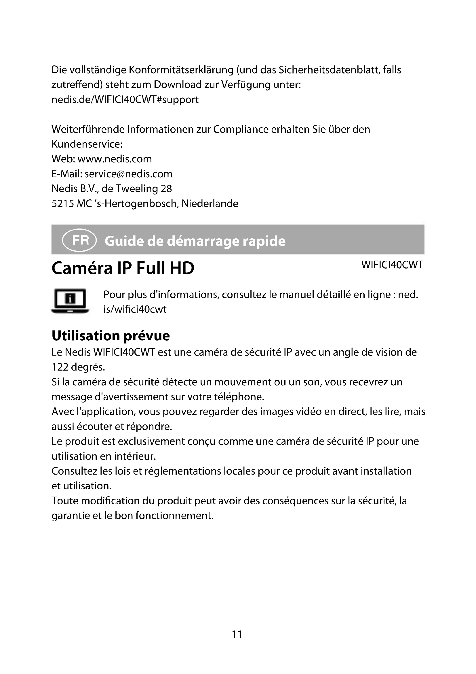 - Gardez la caméra à 1 mètres minimum de tout appareil sans l, y compris des routeurs Wi-Fi et des téléphones, an d’éviter des interférences sans l. Déclaration de conformité Nous, Nedis B.V., déclarons en tant que fabricant que le produit WIFICI40CWT de notre marque Nedis®, produit en Chine, a été testé conformément à toutes les normes et réglementations CE en vigueur et que tous les tests ont été réussis. Cela inclut, sans toutefois s'y limiter, la directive RED 2014/53/UE. La Déclaration de conformité complète (et la che de sécurité le cas échéant) peut être trouvée et téléchargée via: nedis.fr/WIFICI40CWT#support15 Pour plus d'informations sur la conformité, contactez le service client: Site Web: www.nedis.com E-mail: service@nedis.com Nedis B.V., de Tweeling 28 5215 MC ’s-Hertogenbosch, Pays-Bas