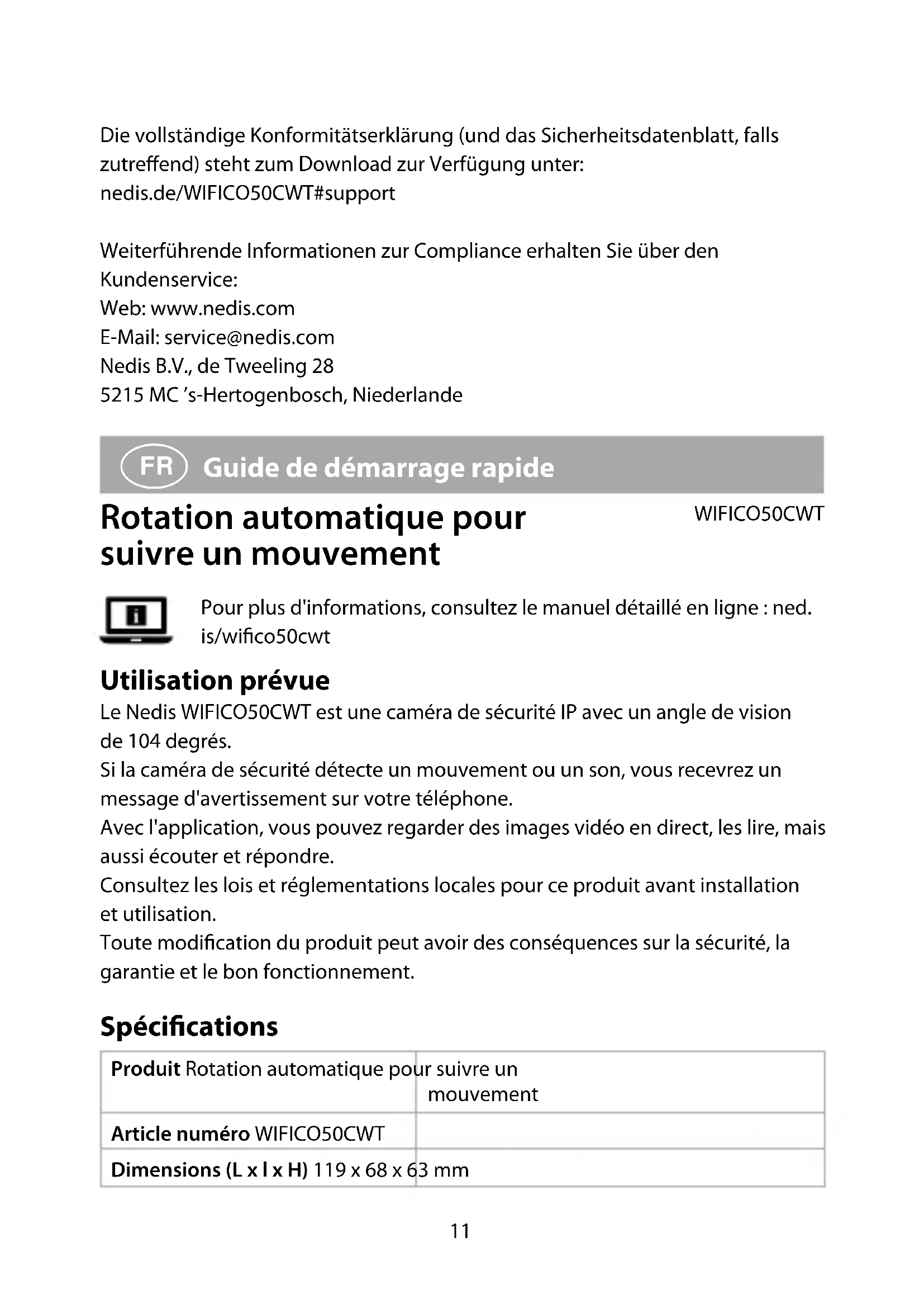 Guide de démarrage rapide Rotation automatique pour suivre un mouvement WIFICO50CWT Pour plus d'informations, consultez le manuel détaillé en ligne : ned. is/wico50cwt Utilisation prévue Le Nedis WIFICO50CWT est une caméra de sécurité IP avec un angle de vision de 104 degrés. Si la caméra de sécurité détecte un mouvement ou un son, vous recevrez un message d'avertissement sur votre téléphone. Avec l'application, vous pouvez regarder des images vidéo en direct, les lire, mais aussi écouter et répondre. Consultez les lois et réglementations locales pour ce produit avant installation et utilisation. Toute modication du produit peut avoir des conséquences sur la sécurité, la garantie et le bon fonctionnement. Spécications Produit Rotation automatique pour suivre un mouvement Article numéro WIFICO50CWT Dimensions (L x l x H) 119 x 68 x 63 mm12 Poids 0,185 kg Températures ambiantes -20 °C – 50 °C Humidité en fonctionnement 10 - 95 % Puissance d'entrée 5 VDC ; 1 A Connexion sans l Wi-Fi 2,4G, AP Mémoire Carte SD (8 - 128 Go) (non incluse) Résolution 1920 x 1080p Vitesse de trame 20 ips Angle de vue 104 degrés Puissance max. de transmission radio 20 dBm Gain de l’antenne 2 dBi Gamme de fréquences 2412 - 2472 MHz Étanche IP65 Pièces principales (image A) 1 Microphone 2 Objectif de la caméra 3 Voyant LED d’état 4 Vis 5 Cache de la carte microSD 6 Haut-parleur 7 Bouton de réinitialisation 8 Emplacement pour carte micro SD 9 Alimentation électrique q Port Ethernet w Adaptateur secteur Consignes de sécurité