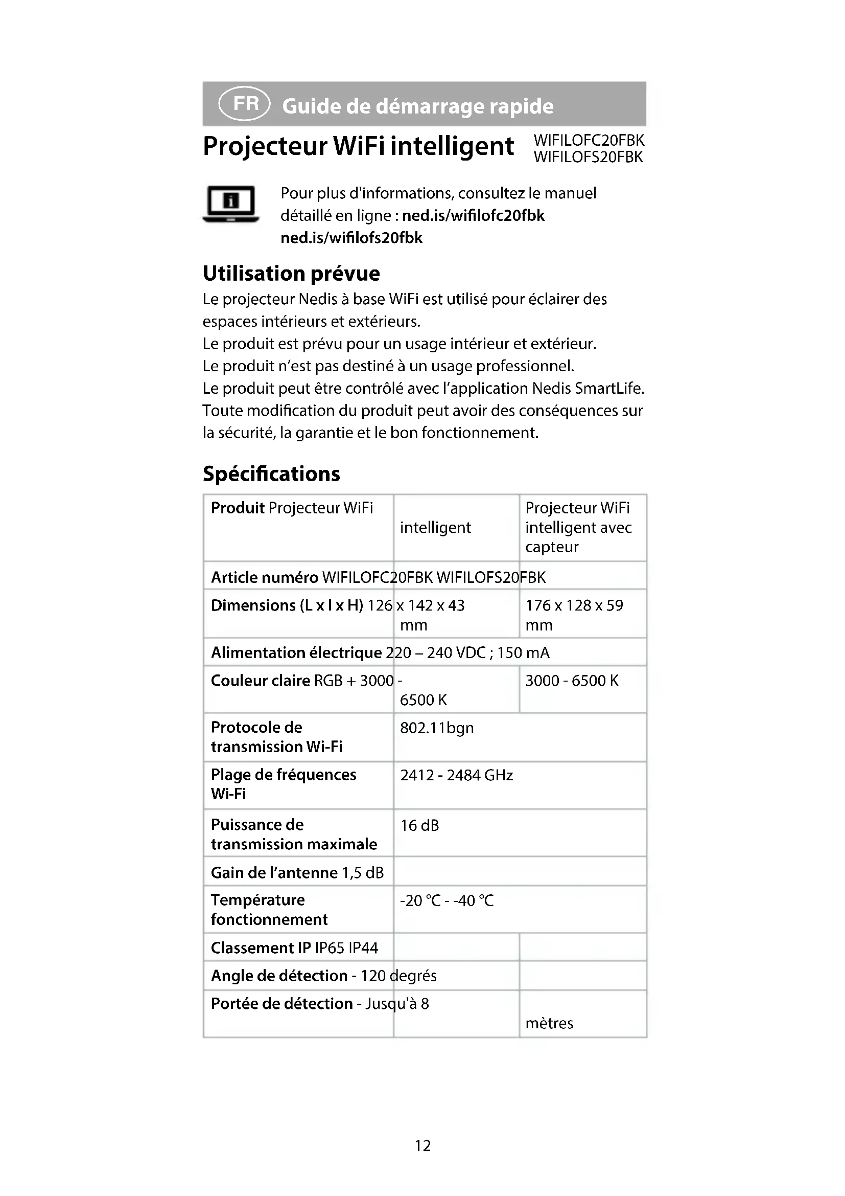 Guide de démarrage rapide Projecteur WiFi intelligent WIFILOFC20FBK WIFILOFS20FBK Pour plus d'informations, consultez le manuel détaillé en ligne : ned.is/wilofc20fbk ned.is/wilofs20fbk Utilisation prévue Le projecteur Nedis à base WiFi est utilisé pour éclairer des espaces intérieurs et extérieurs. Le produit est prévu pour un usage intérieur et extérieur. Le produit n’est pas destiné à un usage professionnel. Le produit peut être contrôlé avec l’application Nedis SmartLife. Toute modication du produit peut avoir des conséquences sur la sécurité, la garantie et le bon fonctionnement. Spécications Produit Projecteur WiFi intelligent Projecteur WiFi intelligent avec capteur Article numéro WIFILOFC20FBK WIFILOFS20FBK Dimensions (L x l x H) 126 x 142 x 43