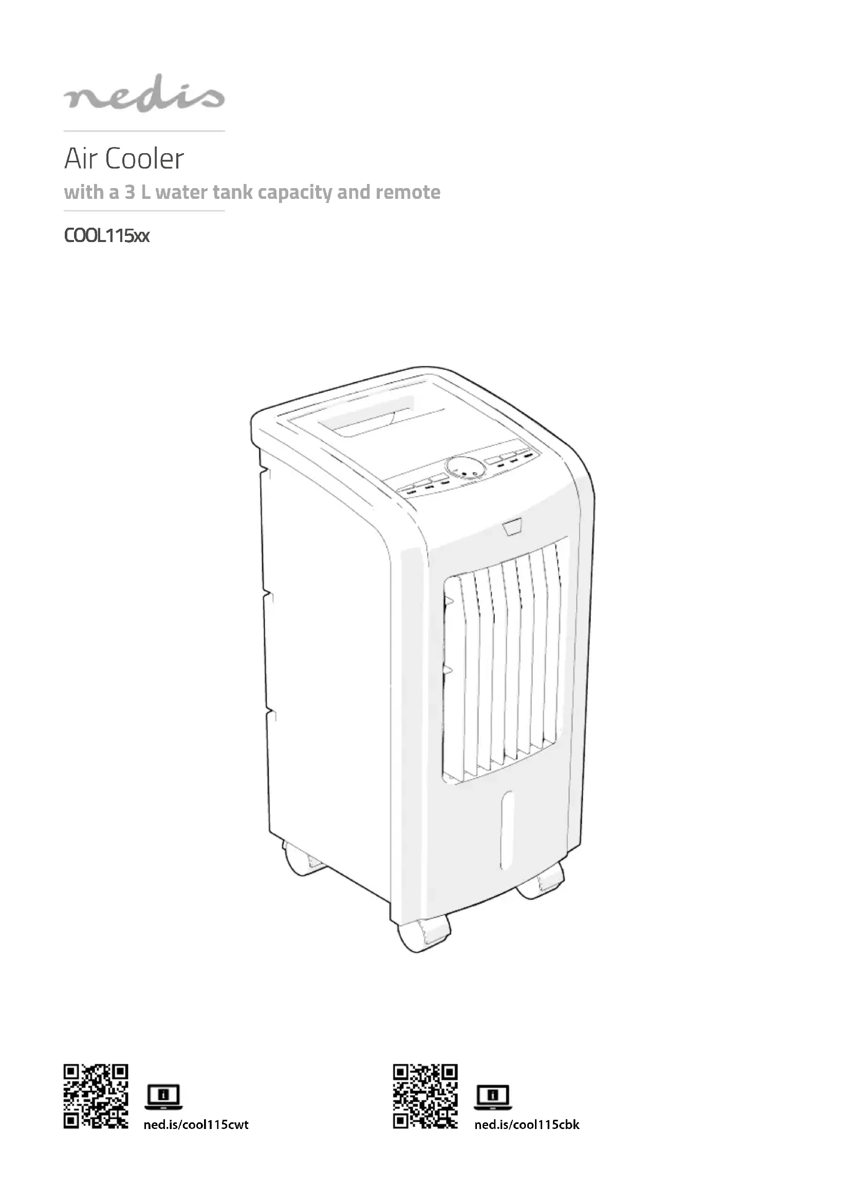 Guide de démarrage rapide Refroidisseur d'air COOL115xxPour plus d'informations, consultez le manuel détaillé en ligne : ned.is/cool115cwt ned.is/cool115cbk Utilisation prévue Le COOL115xx Nedis est un refroidisseur d'air avec un réservoir d'eau d’une capacité de 3 L.Le produit est exclusivement destiné à servir de refroidisseur d'air.Le produit est prévu pour un usage intérieur uniquement.Le produit n’est pas destiné à un usage professionnel.Toute modication du produit peut avoir des conséquences sur la sécurité, la garantie et le bon fonctionnement. Spécications Produit Refroidisseur d'airArticle numéro COOL115xxDimensions (L x l x H) 280 x 250 x 560 mmPoids 4,2 kgAlimentation électrique 220 – 240 VAC 50 – 60 HzPuissance nominale 80 WCapacité du réservoir d'eau 3 LVolume d'air 270 m