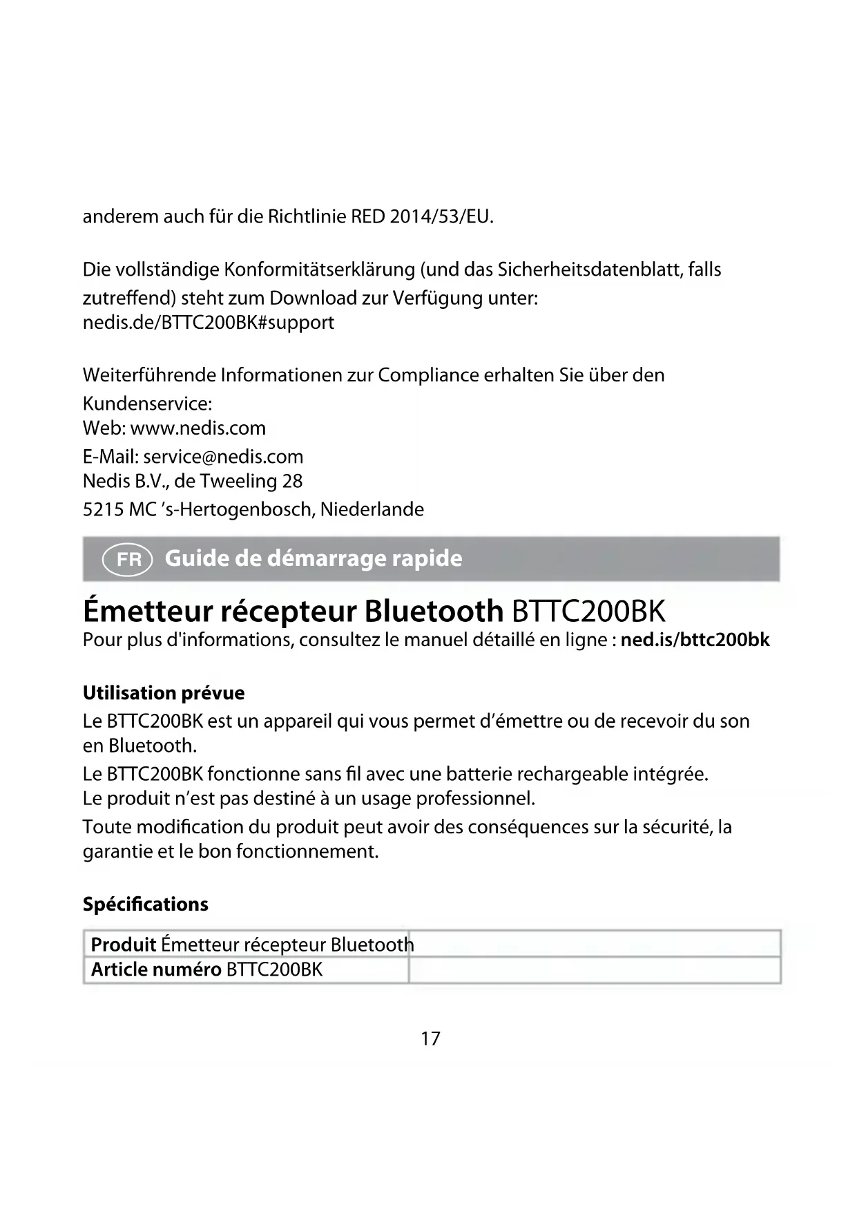 Guide de démarrage rapide Émetteur récepteur Bluetooth BTTC200BK Pour plus d'informations, consultez le manuel détaillé en ligne : ned.is/bttc200bk Utilisation prévue Le BTTC200BK est un appareil qui vous permet d’émettre ou de recevoir du son en Bluetooth. Le BTTC200BK fonctionne sans fil avec une batterie rechargeable intégrée. Le produit n’est pas destiné à un usage professionnel. Toute modification du produit peut avoir des conséquences sur la sécurité, la garantie et le bon fonctionnement. Spécications Produit Émetteur récepteur Bluetooth Article numéro BTTC200BK18 Source d’alimentation 5 VDC / 1 A Batterie Lithium-Polymère Capacité de la batterie 450 mAh Durée de diusion maximale Jusqu'à 22 heures Temps de charge maxi de la batterie Jusqu'à 2 heures Autonomie en veille Jusqu'à 48 heures Version Bluetooth® 5.0 Puissance de transmission maximale 1,31 dBm Gamme de fréquence Bluetooth 2402 - 2480 MHz Plage de signal Bluetooth Jusqu'à 10 mètres Prols Bluetooth A2DP Codecs pris en charge SBC / aptX