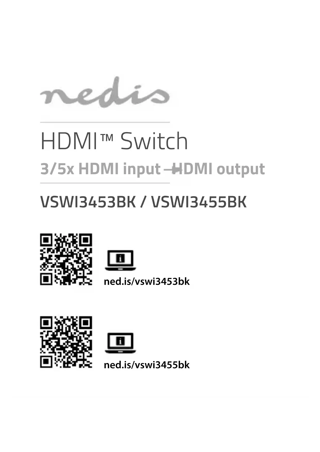 Pour plus d'informations, consultez le manuel détaillé en ligne : ned.is/vswi3453bk | ned.is/vswi3455bk Utilisation prévue Ce produit est exclusivement destiné à la commutation de plusieurs sources HDMI en un seul moniteur ou projecteur HD. Le produit est prévu pour un usage intérieur uniquement.12 Le produit n’est pas destiné à un usage professionnel. Toute modification du produit peut avoir des conséquences sur la sécurité, la garantie et le bon fonctionnement. Spécications Produit Commutateur HDMI™ Article numéro VSWI3453BK / VSWI3455BK Dimensions (l x h x p) 80 x 55 x 18 mm Plage de liaison simple maximale 1920 x 1080 à 60 Hz Entrelacé (60Hz) 1080i, 576i, 480i Progressif (60Hz) 1080p, 720p, 576p, 480p Progressif (30Hz) 2160p Signal DDC entrée 5 V p-p (TTL) Sortie vidéo HDMI Bande passante vidéo 3,4 Gb/s / 340 MHz Température fonctionnement -0 °C – 70 °C Humidité en fonctionnement 10 - 85 % HR (sans condensation) Température de stockage -10 °C – 80 °C Humidité de stockage 5 - 90 % HR (sans condensation) Pièces principales (image A)