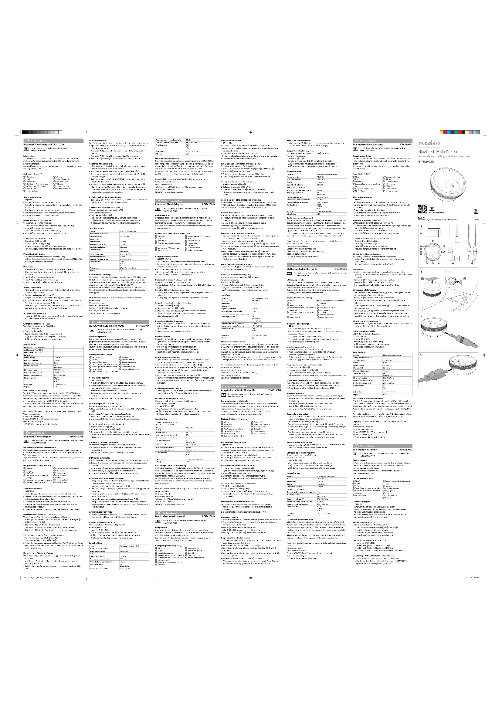 durante 3 segundos.• Para llamar al número anterior, pulse A dos veces. Para hacer una llamada, deberá marcar el número en su teléfono. Una vez establecida la llamada, ya podrá utilizar la función manos libres.Puissance max. de transmission radio 6,5 dBmGamme de fréquences Bluetooth 2402 - 2480 MHzProl Bluetooth A2DPAVRCP HFP Sortie auxiliaire Prise stéréo 3,5 mmAchage LED Déclaration de conformité Nous, Nedis B.V., déclarons en tant que fabricant que le produit BTMA100BK de notre marque Nedis , produit en Chine, a été testé conformément à toutes les normes et réglementations CE en vigueur et que tous les tests ont été réussis. Cela inclut, sans toutefois s'y limiter, la directive RED 2014/53/UE.La Déclaration de conformité complète (et la che de sécurité le cas échéant) peut être trouvée et téléchargée via webshop.nedis.fr/#supportPour plus d'informations sur la conformité, contactez le service client:Site Web: www.nedis.comE-mail: service@nedis.comTéléphone: +31 (0)73-5991055 (pendant les heures de bureau)Nedis B.V., de Tweeling 285215 MC ’s-Hertogenbosch, Pays-Bas