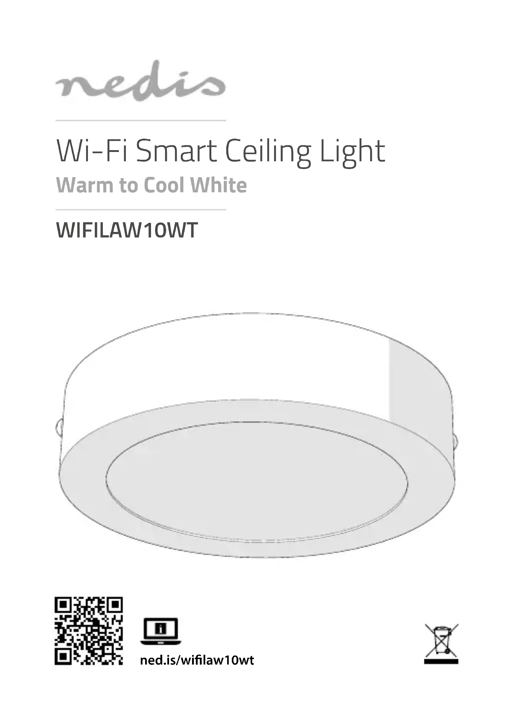 Spécications Produit Plafonnier Wi-Fi Intelligent Article numéro WIFILAW10WT Dimensions Ø 170 x 38 mm Poids 360 g Source d’alimentation 220 – 240 V AC 50 – 60 Hz 12 W Technologie sans l Wi-Fi Température fonctionnement -10 - 40 °C Gamme de fréquences 2412 - 2472 MHz Puissance max. de transmission radio 18 dBm Luminosité 850 lm Plage de température de couleur CCT 2700 - 6500 K Plage d’atténuation 10 % - 100 % Déclaration de conformité Nous, Nedis B.V., déclarons en tant que fabricant que le produit WIFILAW10WT de notre marque Nedis
