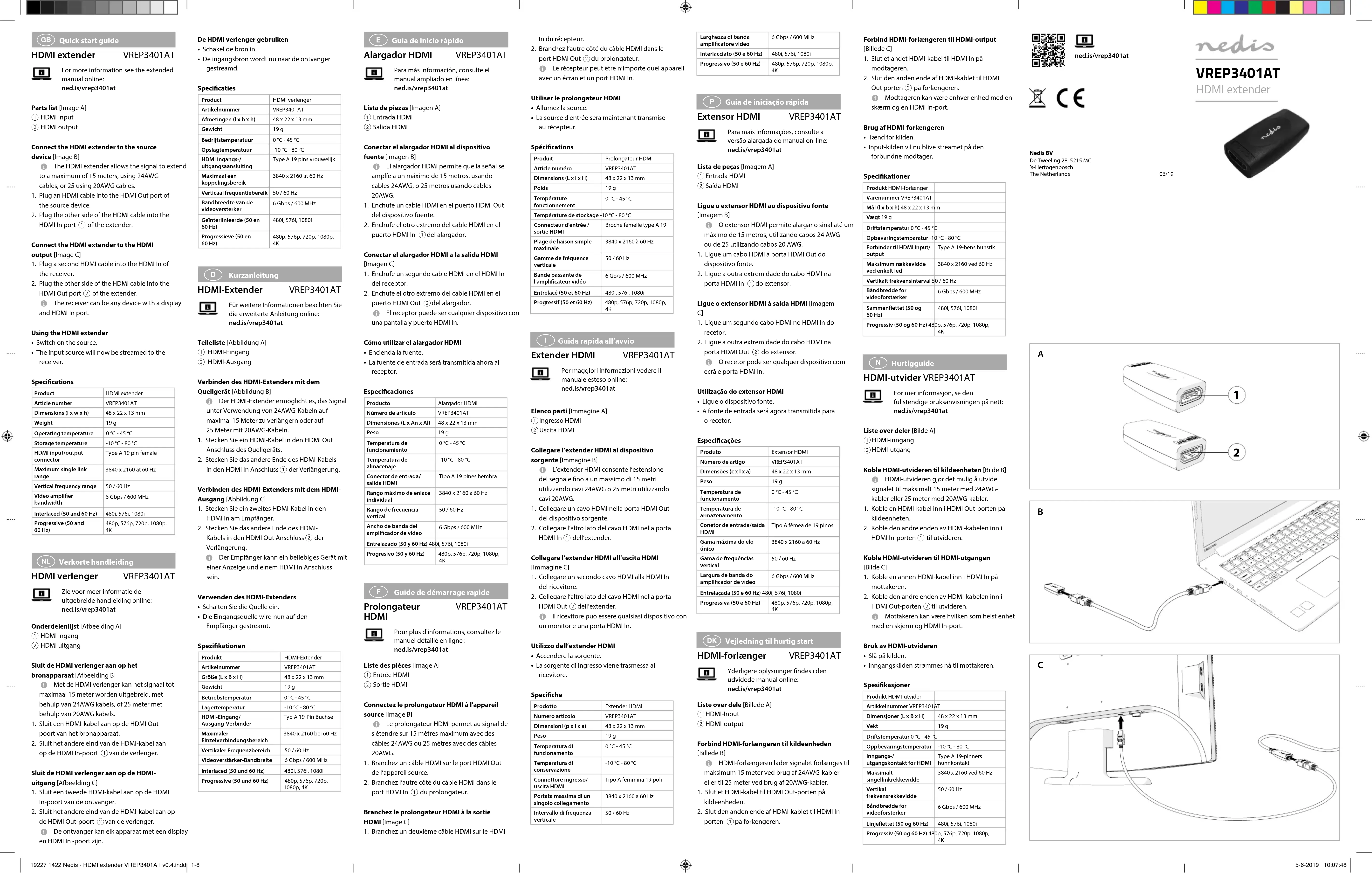 Guide de démarrage rapide Prolongateur HDMI VREP3401AT Pour plus d'informations, consultez le manuel détaillé en ligne : ned.is/vrep3401atListe des pièces [Image A] Entrée HDMI Sortie HDMIConnectez le prolongateur HDMI à l'appareil source [Image B] 4 Le prolongateur HDMI permet au signal de s'étendre sur 15 mètres maximum avec des câbles 24AWG ou 25 mètres avec des câbles 20AWG.1. Branchez un câble HDMI sur le port HDMI Out de l’appareil source.2. Branchez l’autre côté du câble HDMI dans le port HDMI In du prolongateur.Branchez le prolongateur HDMI à la sortie HDMI [Image C]1. Branchez un deuxième câble HDMI sur le HDMI De HDMI verlenger gebruiken• Schakel de bron in.• De ingangsbron wordt nu naar de ontvanger gestreamd.SpecicatiesProduct HDMI verlengerArtikelnummer VREP3401ATAfmetingen (l x b x h) 48 x 22 x 13 mmGewicht 19 gBedrijfstemperatuur 0 °C - 45 °COpslagtemperatuur -10 °C - 80 °CHDMI ingangs-/uitgangsaansluitingType A 19 pins vrouwelijkMaximaal één koppelingsbereik3840 x 2160 at 60 HzVerticaal frequentiebereik 50 / 60 HzBandbreedte van de videoversterker6 Gbps / 600 MHzGeïnterlinieerde (50 en 60 Hz)480i, 576i, 1080iProgressieve (50 en 60 Hz)480p, 576p, 720p, 1080p,