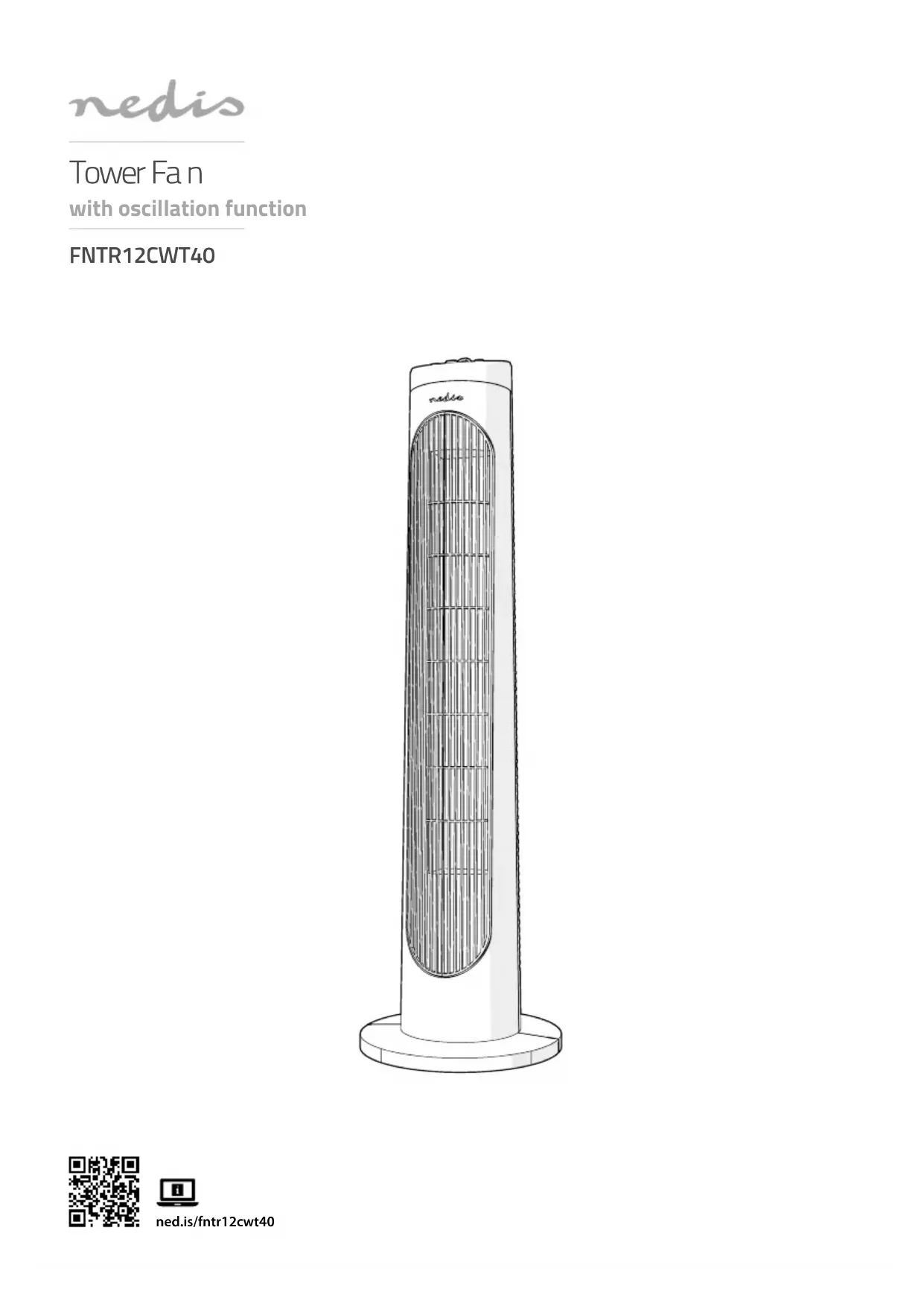 Guide de démarrage rapide Ventilateur tour FNTR12CWT40Pour plus d'informations, consultez le manuel détaillé en ligne : ned.is/fntr12cwt40 Utilisation prévue Le FNTR12CWT40 est un ventilateur avec 3 vitesses diérentes.Ce produit est exclusivement conçu comme un ventilateur pour une utilisation en intérieur seulement.Le produit n’est pas destiné à un usage professionnel.Ce produit peut être utilisé par des enfants âgés de 8 ans et plus ainsi que des personnes ayant des capacités physiques, sensorielles ou mentales réduites ou manquant d’expérience et de connaissances s’ils sont supervisés ou ont reçu des instructions sur l’utilisation du produit en toute sécurité et comprennent les dangers impliqués. Les enfants ne doivent pas jouer avec le produit. Le nettoyage et la maintenance ne doivent pas être eectués par des enfants sans surveillance.Ce produit est destiné à être utilisé dans des environnements domestiques pour des fonctions de ménage typiques qui peuvent également être réalisées par des utilisateurs non experts pour des fonctions de ménage typiques, tels que : des magasins, bureaux, autres environnements de travail similaires, fermes, par des clients dans des hôtels, motels et autres environnements de type résidentiel et/ou dans des environnements de type chambres d'hôtes.Toute modication du produit peut avoir des conséquences sur la sécurité, la garantie et le bon fonctionnement. Spécications Produit Ventilateur tourArticle numéro FNTR12CWT40Dimensions (L x l x H) 24 x 24 x 76 cmPoids 2500gTension d’entrée 220-240V~, 50HzAlimentation électrique 50 W Pièces principales (image A) 1 Unité de ventilateur 2 Partie de base avant 3 Partie de base arrière 4 Écrou de xation de la base 5 Câble d'alimentation 6 Cadran de minuterie 7 Boutons de vitesse du ventilateur 8 Bouton d'oscillation8 Ingangsspanning 220-240V~, 50HzStroomingang 50 W Belangrijkste onderdelen (afbeelding A) 1 Ventilatoreenheid2 Voorzijde basisdeel3 Achterzijde basisdeel4 Basis-bevestigingsmoer5 Stroomkabel6 Timer draaiknop 7 Knoppen voor ventilatorsnelheid8 Oscillatieknop Veiligheidsvoorschriften