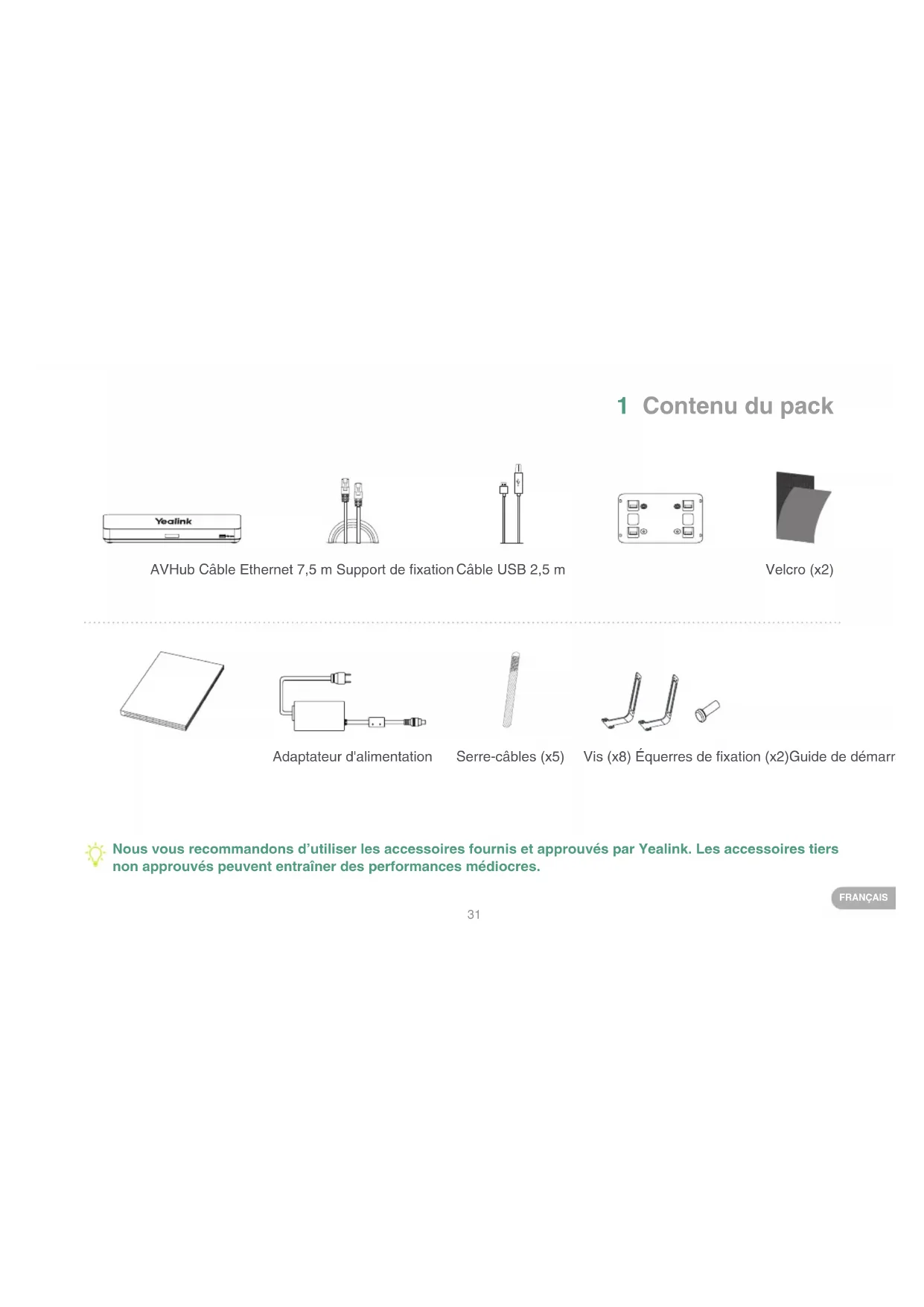 Appareils concernés Pour plus d’informations sur le UVC84, reportez-vous au Guide de démarrage rapide du UVC84. Pour plus d’informations sur le UVC86, reportez-vous au Guide de démarrage rapide du UVC86. Pour plus d’informations sur le MSpeaker II, reportez-vous au Guide de démarrage rapide du MSpeaker II. Pour plus d’informations sur le VCM38, reportez-vous au Guide de démarrage rapide du VCM38. VCM34 UVC86 UVC84 MSpeaker II VCM38 Pour plus d’informations sur le VCM34, reportez-vous au Guide de démarrage rapide du VCM34. Accessoires concernés : VCM34/VCM36/VCM38/UVC84/UVC86/MSpeaker II/VCC22 Point de terminaison concerné : Point de terminaison de la série VCS/Point de terminaison de la série MVC35 FRANÇAIS