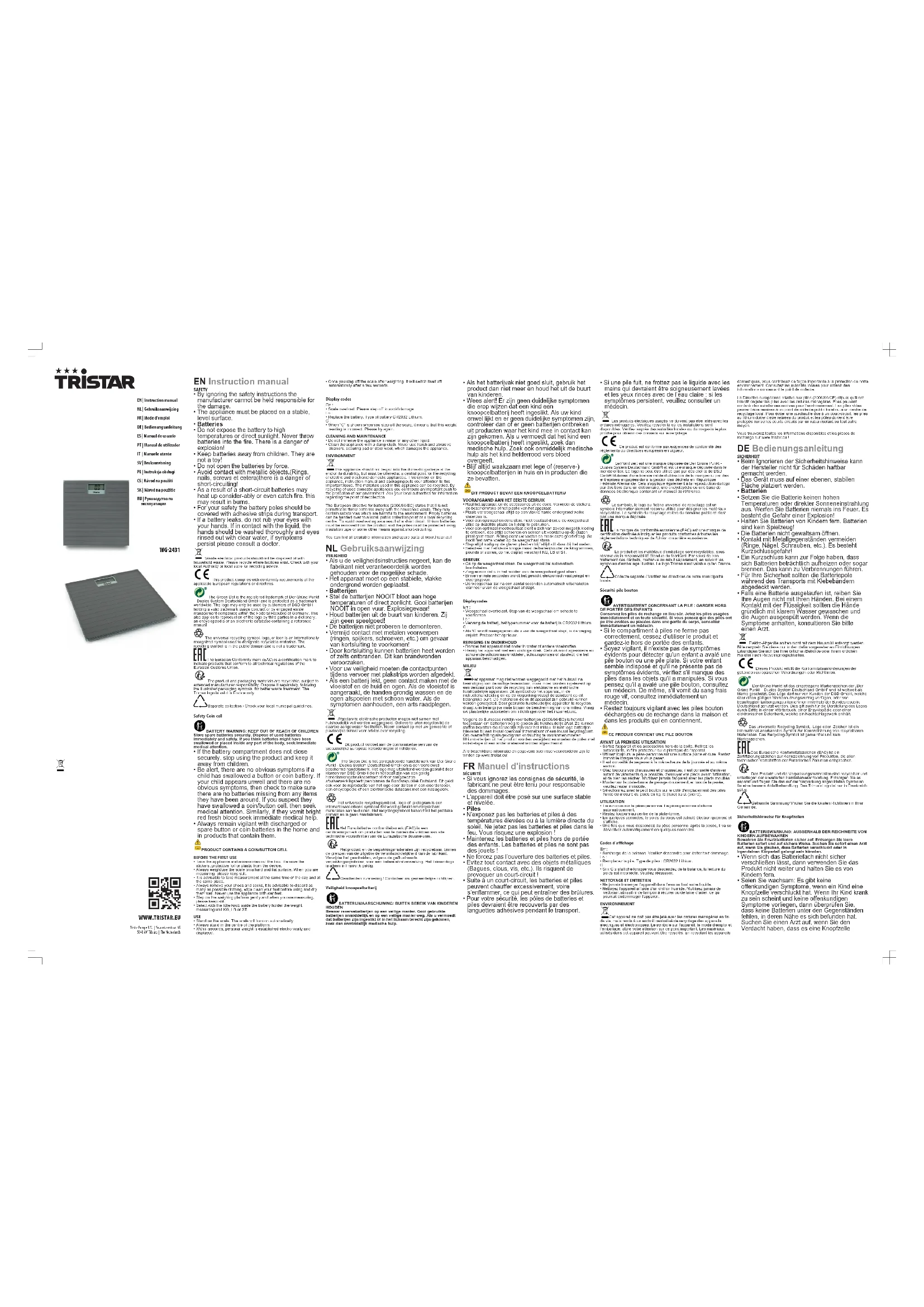 - Si «C» s'affiche lorsque vous descendez de la balance, la lecture dupoids est incorrecte. Veuillez réessayer.NETTOYAGE ET ENTRETIEN• Ne jamais immerger l’appareil dans l’eau ou tout autre liquide.• Nettoyez l'appareil à l'aide d'un chiffon humide. N'utilisez jamais denettoyant abrasif ni de tampon à récurer ou de laine d'acier, ce quipourrait endommager l'appareil.ENVIRONNEMENTCet appareil ne doit pas être jeté avec les ordures ménagères en finde vie, mais remis à un endroit centralisé de recyclage des appareilsélectriques et électroniques. Le symbole sur l'appareil, le mode d’emploi etl'emballage, attire votre attention sur ce point important. Les matériauxutilisés dans cet appareil peuvent être recyclés. En recyclant les appareilsdomestiques, vous contribuez de façon importante à la protection de notreenvironnement. Consultez les autorités locales pour obtenir desinformations concernant le point de collecte.La Directive européenne relative aux piles (2006/66/CE) stipule qu'il estinterdit de jeter les piles avec les ordures ménagères. Elles peuventcontenir des substances nocives pour l'environnement. Les piles videspeuvent être remises à un point de collecte public local ou à un centre derecyclage local. Pour éviter une surchauffe due à un court-circuit, les pilesau lithium doivent être retirées du produit et les pôles doivent êtreprotégés contre les courts-circuits par un ruban isolant ou tout autremoyen.Vous trouverez toutes les informations disponibles et les pièces derechange sur www.tristar.eu! DEBedienungsanleitung SICHERHEIT