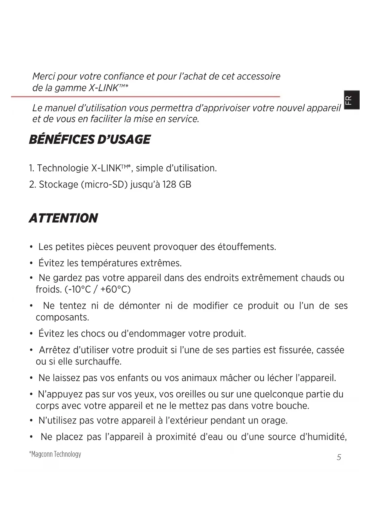 - Ne placez pas l’appareil à proximité d’eau ou d’une source d’humidité, Merci pour votre conance et pour l’achat de cet accessoire de la gamme X-LINK™* Le manuel d’utilisation vous permettra d’apprivoiser votre nouvel appareil et de vous en faciliter la mise en service. *Magconn Technology6