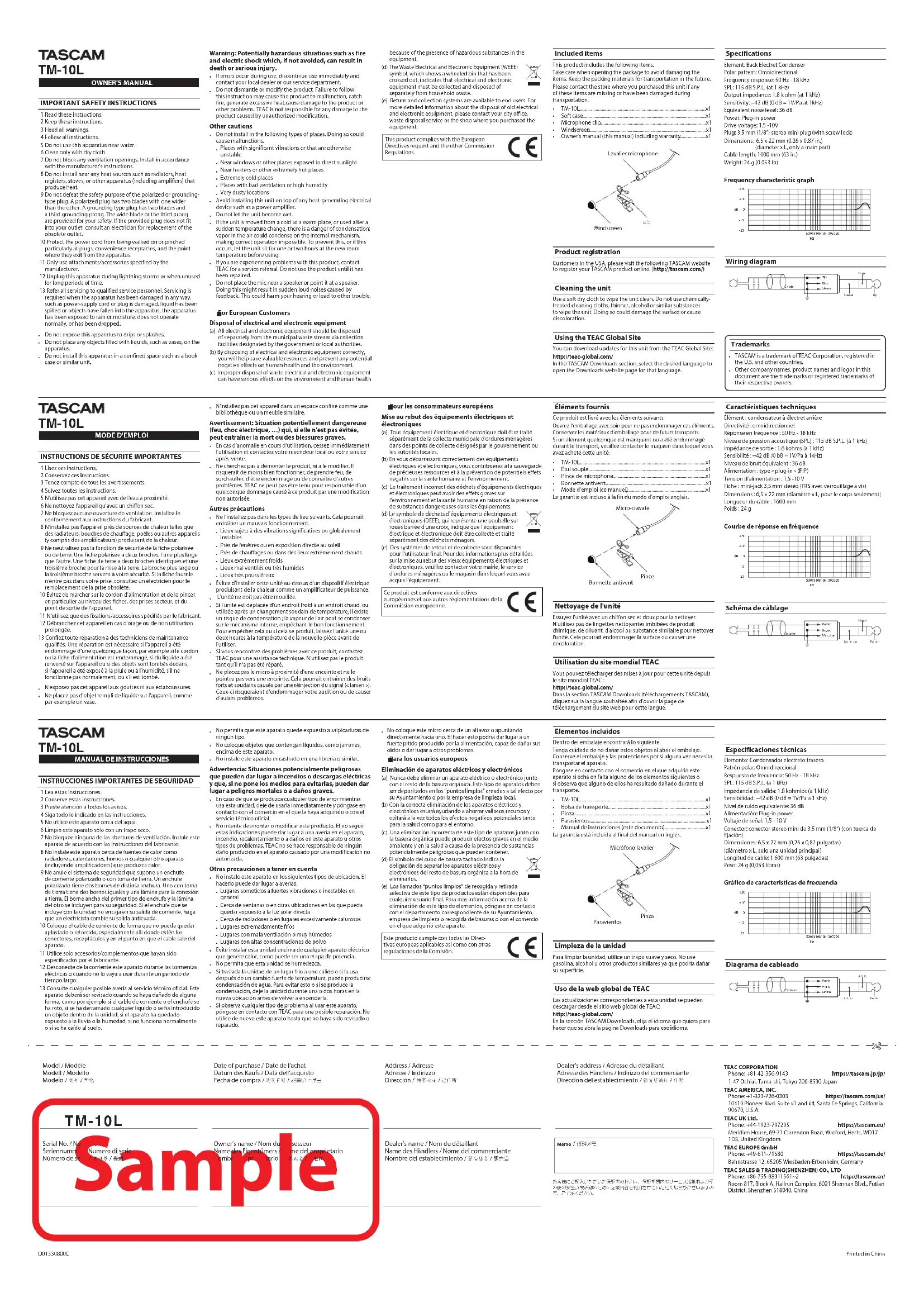 Téléchargez la notice de votre Microphone au format PDF gratuitement ! Retrouvez votre notice TM10L - TASCAM et reprennez votre appareil électronique en main. Sur cette page sont publiés tous les documents nécessaires à l'utilisation de votre appareil TM10L de la marque TASCAM.
