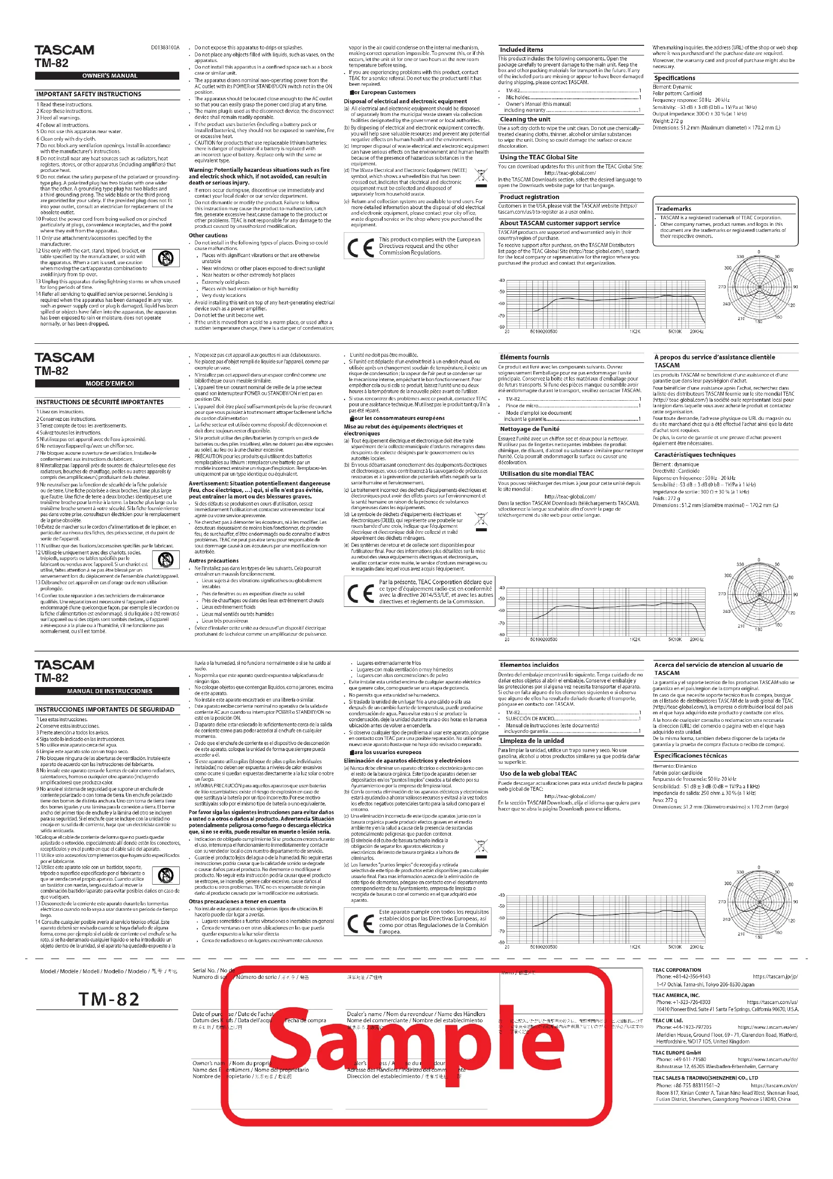 Memo / 修理メモお客様にご記入いただいた保証書の控えは、保証期間内のサービス活動およびその後の安全点検活動のために記載内容を利用させていただく場合がございますので、ご了承ください。 À propos du service d’assistance clientèle TASCAM Les produits TASCAM ne bénéficient d’une assistance et d’une garantie que dans leur pays/région d’achat.Pour bénéficier d’une assistance après l’achat, recherchez dans la liste des distributeurs TASCAM fournie sur le site mondial TEAC (http:// teac-global.com/) la société ou le représentant local pour la région dans laquelle vous avez acheté le produit et contactez cette organisation.Pour toute demande, l’adresse physique ou URL du magasin ou du site marchand chez qui a été effectué l’achat ainsi que la date d’achat sont requises.De plus, la carte de garantie et une preuve d’achat peuvent également être nécessaires. Caractéristiques techniques Élément : dynamiqueDirectivité : CardioïdeRéponse en fréquence : 50 Hz - 20 kHzSensibilité : -53 dB ± 3 dB (0 bB = 1V/Pa à 1 kHz)Impédance de sortie : 300 Ω ± 30 % (à 1 kHz)Poids : 272 gDimensions : 51,2 mm (diamètre maximal) ~ 170,2 mm (L) TM-82 OWNER'S MANUAL