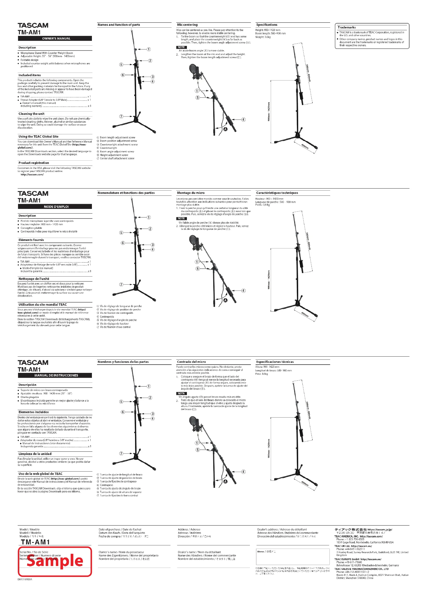 Contrepoids inclus pour équilibrer le micro installé Éléments fournis Ce produit est livré avec les composants suivants. Ouvrez soigneusement l’emballage pour ne pas endommager l’unité principale. Conservez la boîte et les matériaux d’emballage pour de futurs transports. Si l’une des pièces manque ou semble avoir été endommagée durant le transport, veuillez contacter TASCAM. p TM-AM1 .......................................................................................................x 1 p Adaptateur de filetage (femelle 5/8” vers mâle 3/8”) ................. x 1 p Mode d’emploi (ce manuel) incluant la garantie ..................................................................................x 1 Nettoyage de l’unité Essuyez l’unité avec un chiffon sec et doux pour la nettoyer. N’utilisez pas de lingettes nettoyantes imbibées de produit chimique, de diluant, d’alcool ou substance similaire pour nettoyer l’unité. Cela pourrait endommager la surface ou causer une décoloration. Utilisation du site mondial TEAC Vous pouvez télécharger depuis le site mondial TEAC (http:// teac-global.com/) ce mode d’emploi et le manuel de référence nécessaires à cette unité. Dans la section TASCAM Downloads (téléchargements TASCAM), cliquez sur la langue souhaitée afin d’ouvrir la page de téléchargement du site web pour cette langue. Nomenclature et fonctions des parties 1 Vis de réglage de longueur de perche 2 Vis de réglage de position de perche 3 Vis de fixation de contrepoids 4 Contrepoids 5 Vis de réglage d’angle de perche 6 Vis de réglage de hauteur 7 Vis de fixation d’axe central Montage du micro Les micros peuvent être montés comme vous le souhaitez. Faites toutefois attention aux indications suivantes pour permettre un montage plus stable.