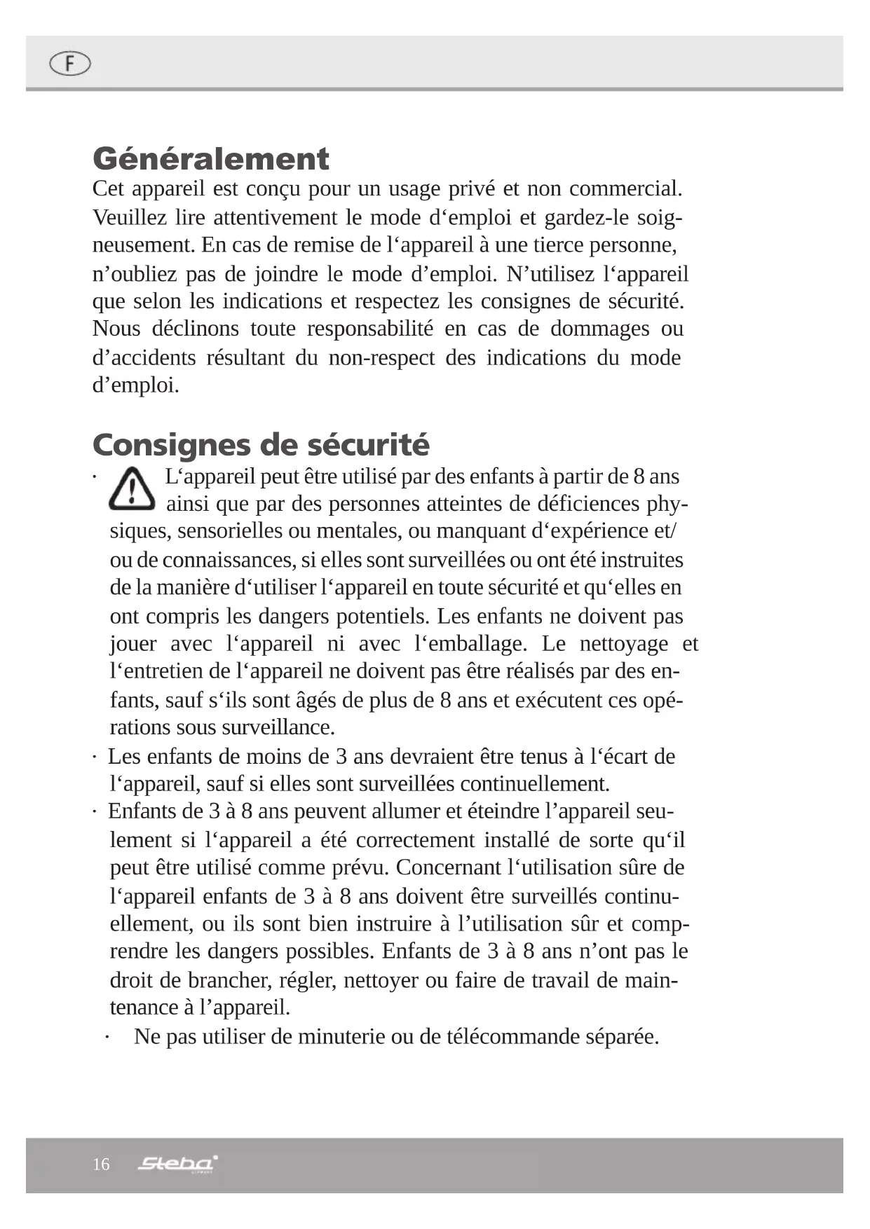 Il est recommandé de ne pas utiliser le STEBA KH 3 dans des environnements humides comme les salles de bain, sauf indication contraire dans le manuel d'utilisation.