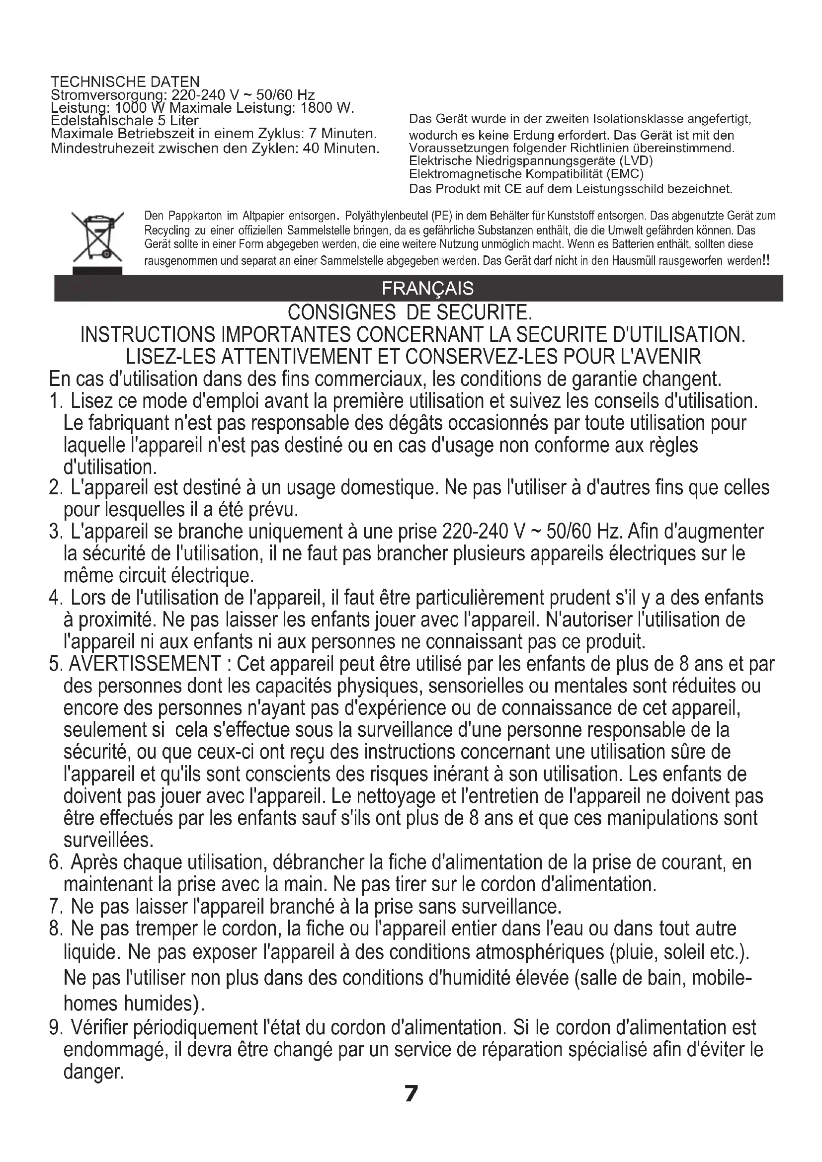 Temps de repos minimum entre les cycles: 40 minutes. Alimentation: 220-240V ~ 50 / 60Hz 5.Ne plongez pas la base dans l'eau ou dans d'autres liquides. Respect de l'environnement. Nous vous prions de bien vouloir trier les emballages en carton ainsi que les sachets plastiques (en polyéthylène). L'appareil usagé ne doit pas être jeté à la poubelle mais remis au point de collecte prévu à cet effet car il contient des éléments pouvant être nocifs pour l'environnement. L'appareil électrique doit être remis de manière à limiter au maximum une éventuelle utilisation ultérieure. Si l'appareil contient des piles, il faut les retirer et les remettre à un autre point de collecte. Ne pas jeter l'appareil dans une poubelle de déchets ménagers !!! L'appareil de IIe classe d'isolation électrique ne demande pas de prise à la terre. Produit marqué CE sur la plaquette signalétique. Appareil électrique basse tension (LVD) L'appareil est conforme aux exigences des directives: Compatibilité électromagnétique (EMC) ESPAÑOL
