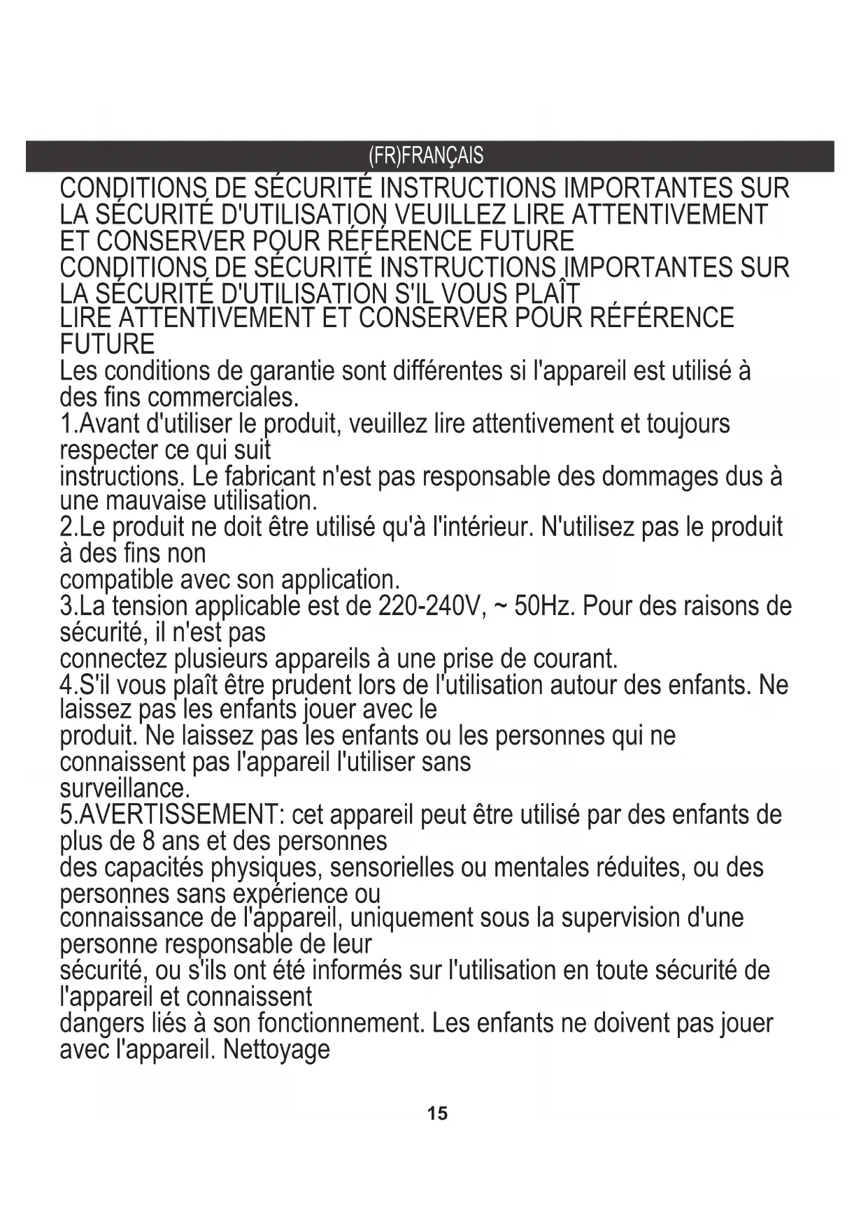 CONDITIONS DE SÉCURITÉ INSTRUCTIONS IMPORTANTES SUR LA SÉCURITÉ D'UTILISATION VEUILLEZ LIRE ATTENTIVEMENT ET CONSERVER POUR RÉFÉRENCE FUTURE CONDITIONS DE SÉCURITÉ INSTRUCTIONS IMPORTANTES SUR LA SÉCURITÉ D'UTILISATION S'IL VOUS PLAÎT LIRE ATTENTIVEMENT ET CONSERVER POUR RÉFÉRENCE FUTURE Les conditions de garantie sont différentes si l'appareil est utilisé à des fins commerciales. 1.Avant d'utiliser le produit, veuillez lire attentivement et toujours respecter ce qui suit instructions. Le fabricant n'est pas responsable des dommages dus à une mauvaise utilisation. 2.Le produit ne doit être utilisé qu'à l'intérieur. N'utilisez pas le produit à des fins non compatible avec son application. 3.La tension applicable est de 220-240V, ~ 50Hz. Pour des raisons de sécurité, il n'est pas connectez plusieurs appareils à une prise de courant. 4.S'il vous plaît être prudent lors de l'utilisation autour des enfants. Ne laissez pas les enfants jouer avec le produit. Ne laissez pas les enfants ou les personnes qui ne connaissent pas l'appareil l'utiliser sans surveillance. 5.AVERTISSEMENT: cet appareil peut être utilisé par des enfants de plus de 8 ans et des personnes des capacités physiques, sensorielles ou mentales réduites, ou des personnes sans expérience ou connaissance de l'appareil, uniquement sous la supervision d'une personne responsable de leur sécurité, ou s'ils ont été informés sur l'utilisation en toute sécurité de l'appareil et connaissent dangers liés à son fonctionnement. Les enfants ne doivent pas jouer avec l'appareil. Nettoyage16 et l'entretien de l'appareil ne doit pas être effectué par des enfants à moins qu'ils ne soient 8 ans et ces activités sont effectuées sous surveillance. 6.Une fois que vous avez fini d'utiliser le produit, n'oubliez pas de retirer délicatement la fiche de la prise de courant tenant la prise avec votre main. Ne tirez jamais sur le câble d'alimentation !!! 7.Ne mettez jamais le câble d'alimentation, la fiche ou l'ensemble de l'appareil dans l'eau. N'exposez jamais le produit aux conditions atmosphériques telles que la lumière directe du soleil ou la pluie, etc. produit dans des conditions humides.