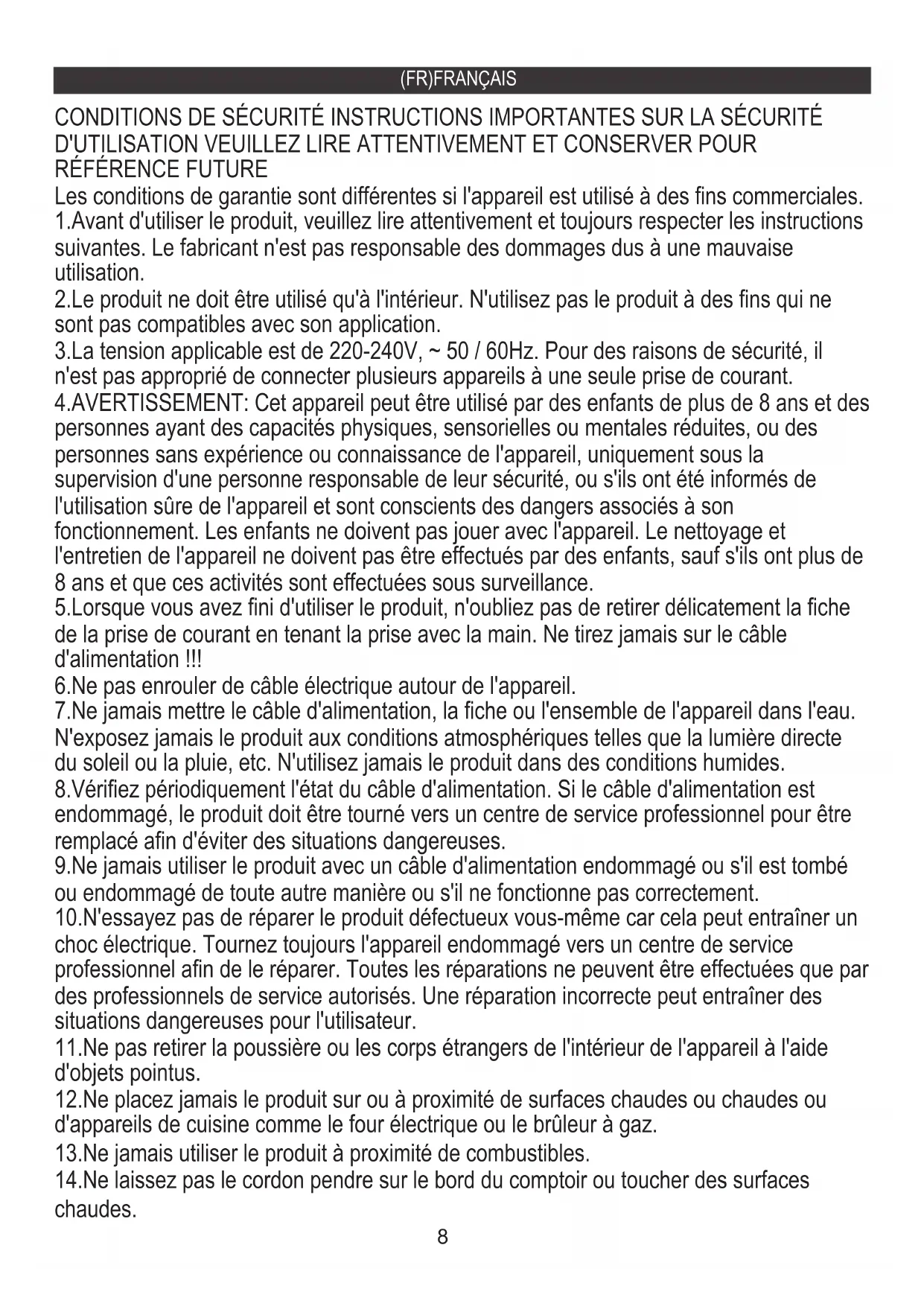 14.Ne laissez pas le cordon pendre sur le bord du comptoir ou toucher des surfaces chaudes. 13.Ne jamais utiliser le produit à proximité de combustibles. 12.Ne placez jamais le produit sur ou à proximité de surfaces chaudes ou chaudes ou d'appareils de cuisine comme le four électrique ou le brûleur à gaz. 11.Ne pas retirer la poussière ou les corps étrangers de l'intérieur de l'appareil à l'aide d'objets pointus. 10.N'essayez pas de réparer le produit défectueux vous-même car cela peut entraîner un choc électrique. Tournez toujours l'appareil endommagé vers un centre de service professionnel afin de le réparer. Toutes les réparations ne peuvent être effectuées que par des professionnels de service autorisés. Une réparation incorrecte peut entraîner des situations dangereuses pour l'utilisateur. 9.Ne jamais utiliser le produit avec un câble d'alimentation endommagé ou s'il est tombé ou endommagé de toute autre manière ou s'il ne fonctionne pas correctement. 8.Vérifiez périodiquement l'état du câble d'alimentation. Si le câble d'alimentation est endommagé, le produit doit être tourné vers un centre de service professionnel pour être remplacé afin d'éviter des situations dangereuses. 7.Ne jamais mettre le câble d'alimentation, la fiche ou l'ensemble de l'appareil dans l'eau. N'exposez jamais le produit aux conditions atmosphériques telles que la lumière directe du soleil ou la pluie, etc. N'utilisez jamais le produit dans des conditions humides. 6.Ne pas enrouler de câble électrique autour de l'appareil. 5.Lorsque vous avez fini d'utiliser le produit, n'oubliez pas de retirer délicatement la fiche de la prise de courant en tenant la prise avec la main. Ne tirez jamais sur le câble d'alimentation !!! 4.AVERTISSEMENT: Cet appareil peut être utilisé par des enfants de plus de 8 ans et des personnes ayant des capacités physiques, sensorielles ou mentales réduites, ou des personnes sans expérience ou connaissance de l'appareil, uniquement sous la supervision d'une personne responsable de leur sécurité, ou s'ils ont été informés de l'utilisation sûre de l'appareil et sont conscients des dangers associés à son fonctionnement. Les enfants ne doivent pas jouer avec l'appareil. Le nettoyage et l'entretien de l'appareil ne doivent pas être effectués par des enfants, sauf s'ils ont plus de 8 ans et que ces activités sont effectuées sous surveillance. 3.La tension applicable est de 220-240V, ~ 50 / 60Hz. Pour des raisons de sécurité, il n'est pas approprié de connecter plusieurs appareils à une seule prise de courant. 2.Le produit ne doit être utilisé qu'à l'intérieur. N'utilisez pas le produit à des fins qui ne sont pas compatibles avec son application. 1.Avant d'utiliser le produit, veuillez lire attentivement et toujours respecter les instructions suivantes. Le fabricant n'est pas responsable des dommages dus à une mauvaise utilisation. Les conditions de garantie sont différentes si l'appareil est utilisé à des fins commerciales. CONDITIONS DE SÉCURITÉ INSTRUCTIONS IMPORTANTES SUR LA SÉCURITÉ D'UTILISATION VEUILLEZ LIRE ATTENTIVEMENT ET CONSERVER POUR