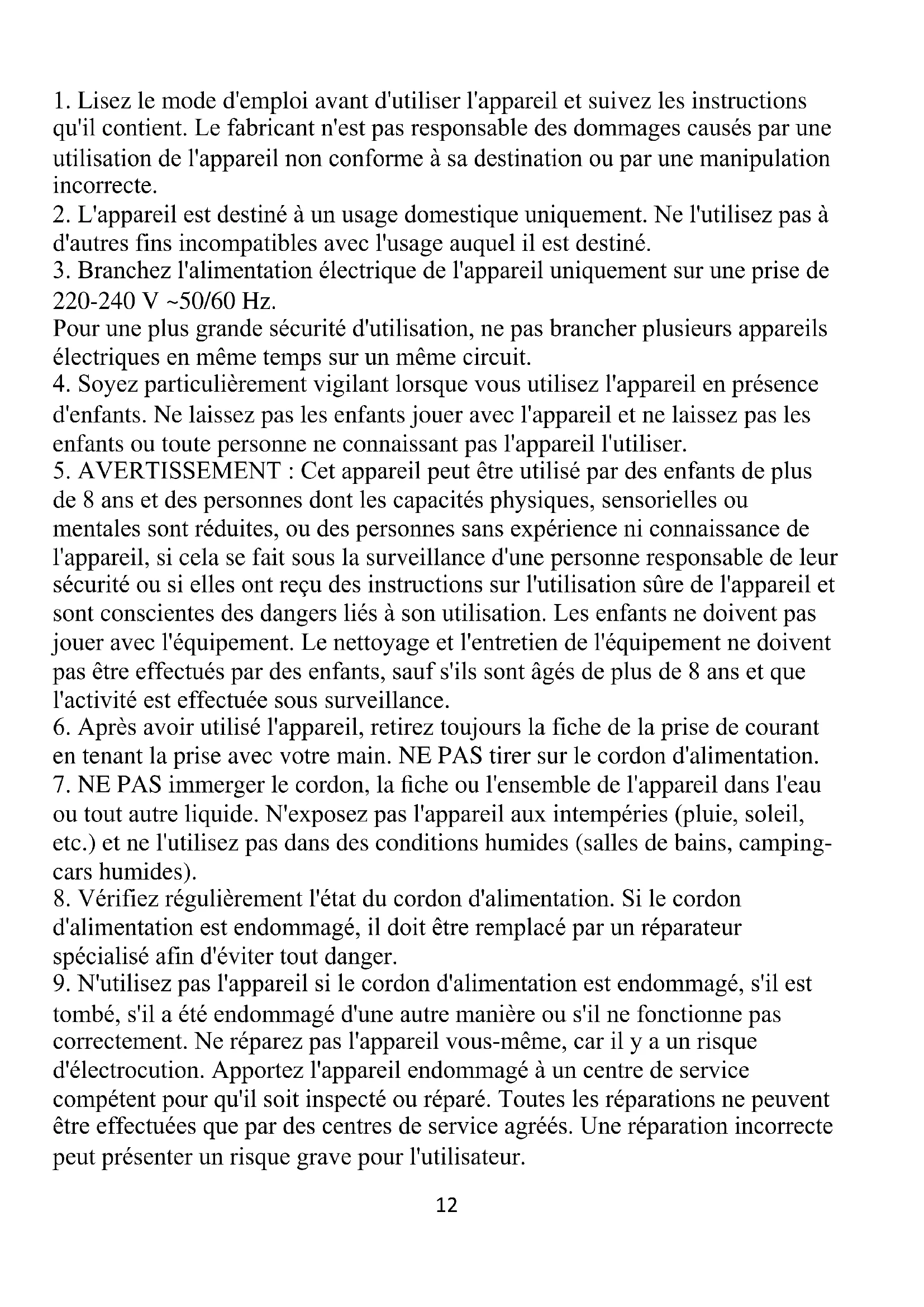 9. N'utilisez pas l'appareil si le cordon d'alimentation est endommagé, s'il est