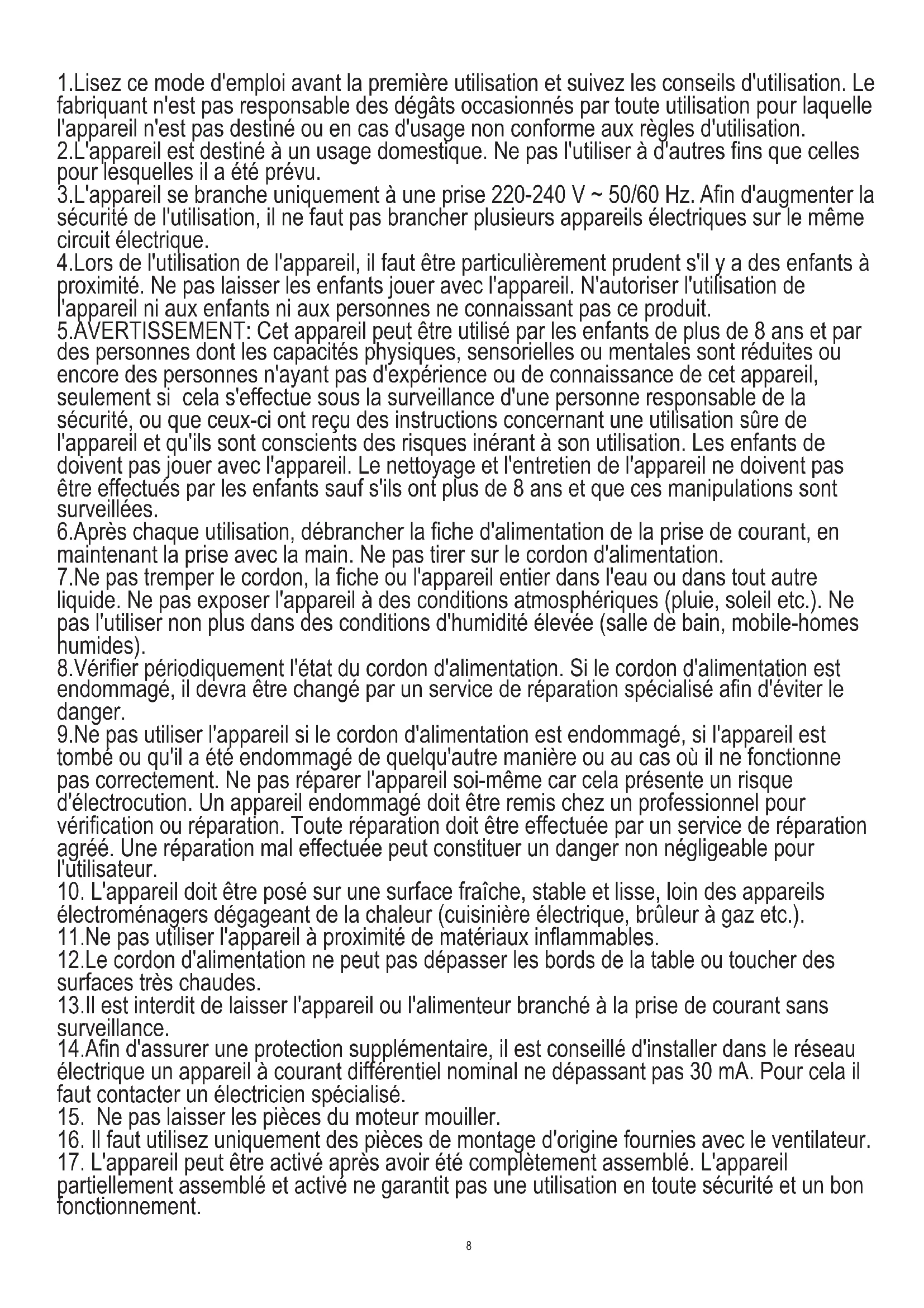19. Ne placez pas aucun objet dans la couverture du ventilateur. Cela peut endommager le