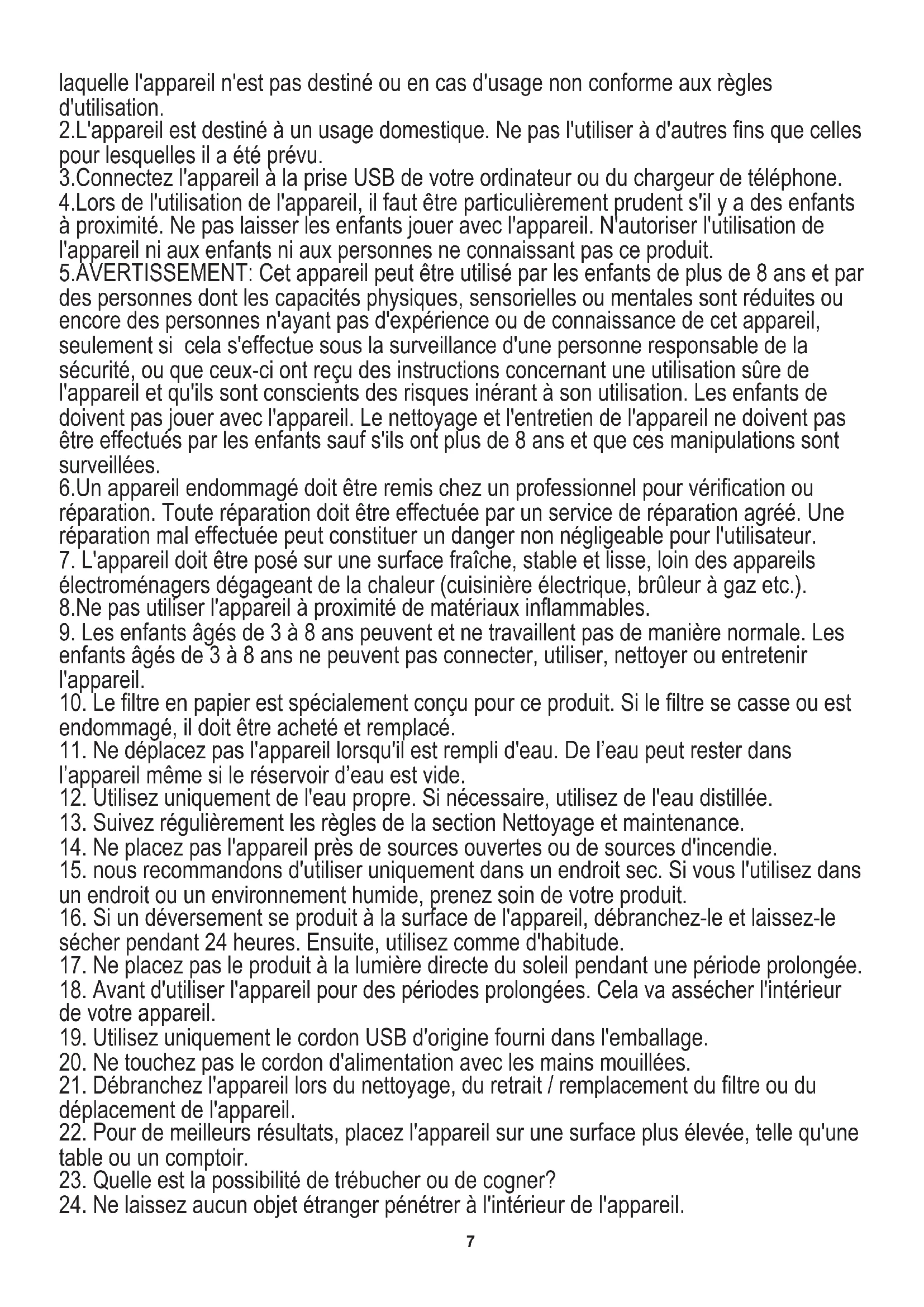 En cas d'utilisation dans des fins commerciaux, les conditions de garantie changent." 1.Lisez ce mode d'emploi avant la première utilisation et suivez les conseils d'utilisation. Le fabriquant n'est pas responsable des dégâts occasionnés par toute utilisation pour Den Pappkarton im Altpapier entsorgen. Polyäthylenbeutel (PE) in dem Behälter für Kunststoff entsorgen. Das abgenutzte Gerät zum Recycling zu einer offiziellen Sammelstelle bringen, da es gefährliche Substanzen enthält, die die Umwelt gefährden können. Das Gerät sollte in einer Form abgegeben werden, die eine weitere Nutzung unmöglich macht. Wenn es Batterien enthält, sollten diese rausgenommen und separat an einer Sammelstelle abgegeben werden. Das Gerät darf nicht in den Hausmüll rausgeworfen werden!! FRANÇAIS7 laquelle l'appareil n'est pas destiné ou en cas d'usage non conforme aux règles d'utilisation. 2.L'appareil est destiné à un usage domestique. Ne pas l'utiliser à d'autres fins que celles pour lesquelles il a été prévu. 3.Connectez l'appareil à la prise USB de votre ordinateur ou du chargeur de téléphone. 4.Lors de l'utilisation de l'appareil, il faut être particulièrement prudent s'il y a des enfants à proximité. Ne pas laisser les enfants jouer avec l'appareil. N'autoriser l'utilisation de l'appareil ni aux enfants ni aux personnes ne connaissant pas ce produit. 5.AVERTISSEMENT: Cet appareil peut être utilisé par les enfants de plus de 8 ans et par des personnes dont les capacités physiques, sensorielles ou mentales sont réduites ou encore des personnes n'ayant pas d'expérience ou de connaissance de cet appareil, seulement si cela s'effectue sous la surveillance d'une personne responsable de la sécurité, ou que ceux-ci ont reçu des instructions concernant une utilisation sûre de l'appareil et qu'ils sont conscients des risques inérant à son utilisation. Les enfants de doivent pas jouer avec l'appareil. Le nettoyage et l'entretien de l'appareil ne doivent pas être effectués par les enfants sauf s'ils ont plus de 8 ans et que ces manipulations sont surveillées. 6.Un appareil endommagé doit être remis chez un professionnel pour vérification ou réparation. Toute réparation doit être effectuée par un service de réparation agréé. Une réparation mal effectuée peut constituer un danger non négligeable pour l'utilisateur.