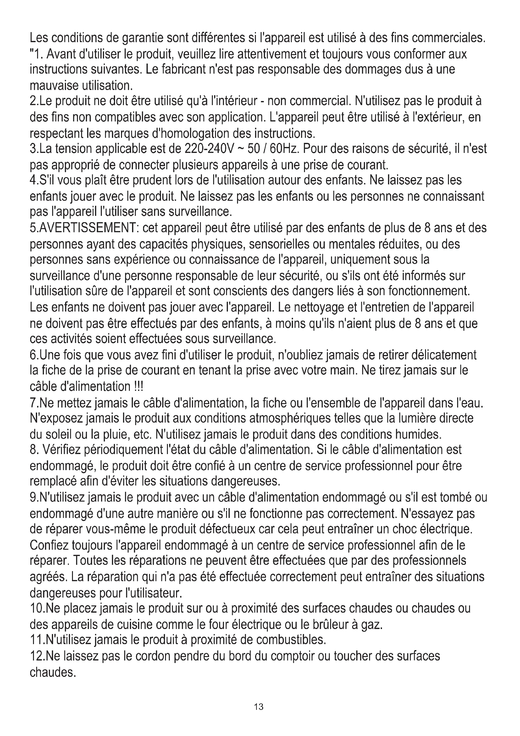 endommagé, le produit doit être confié à un centre de service professionnel pour être remplacé afin d'éviter les situations dangereuses. 7.Ne mettez jamais le câble d'alimentation, la fiche ou l'ensemble de l'appareil dans l'eau. N'exposez jamais le produit aux conditions atmosphériques telles que la lumière directe du soleil ou la pluie, etc. N'utilisez jamais le produit dans des conditions humides. 5.AVERTISSEMENT: cet appareil peut être utilisé par des enfants de plus de 8 ans et des personnes ayant des capacités physiques, sensorielles ou mentales réduites, ou des personnes sans expérience ou connaissance de l'appareil, uniquement sous la surveillance d'une personne responsable de leur sécurité, ou s'ils ont été informés sur l'utilisation sûre de l'appareil et sont conscients des dangers liés à son fonctionnement. Les enfants ne doivent pas jouer avec l'appareil. Le nettoyage et l'entretien de l'appareil ne doivent pas être effectués par des enfants, à moins qu'ils n'aient plus de 8 ans et que ces activités soient effectuées sous surveillance. Les conditions de garantie sont différentes si l'appareil est utilisé à des fins commerciales. "1. Avant d'utiliser le produit, veuillez lire attentivement et toujours vous conformer aux instructions suivantes. Le fabricant n'est pas responsable des dommages dus à une mauvaise utilisation. 10.Ne placez jamais le produit sur ou à proximité des surfaces chaudes ou chaudes ou des appareils de cuisine comme le four électrique ou le brûleur à gaz. 6.Une fois que vous avez fini d'utiliser le produit, n'oubliez jamais de retirer délicatement la fiche de la prise de courant en tenant la prise avec votre main. Ne tirez jamais sur le câble d'alimentation !!! 11.N'utilisez jamais le produit à proximité de combustibles. 4.S'il vous plaît être prudent lors de l'utilisation autour des enfants. Ne laissez pas les enfants jouer avec le produit. Ne laissez pas les enfants ou les personnes ne connaissant pas l'appareil l'utiliser sans surveillance. 12.Ne laissez pas le cordon pendre du bord du comptoir ou toucher des surfaces chaudes.14 23.Ne touchez jamais les surfaces chaudes de l'appareil 17.Pour une circulation d'air adéquate, une distance minimale de 30 cm de tous les côtés de l'appareil est nécessaire.