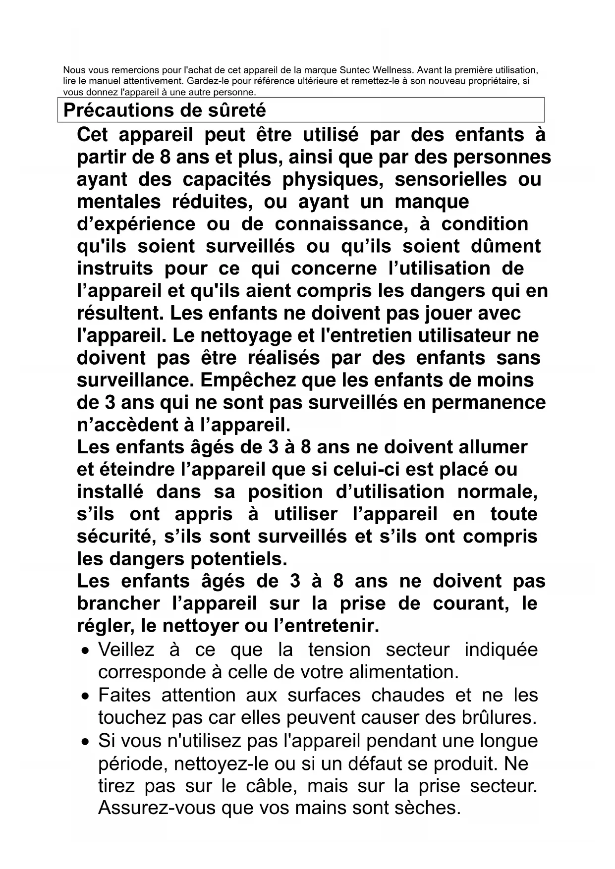 Bouilloire en acier inoxydable WAK-8557 temperature Mode d‘emploiNous vous remercions pour l'achat de cet appareil de la marque Suntec Wellness. Avant la première utilisation, lire le manuel attentivement. Gardez-le pour référence ultérieure et remettez-le à son nouveau propriétaire, si vous donnez l'appareil à une autre personne. Précautions de sûreté Cet appareil peut être utilisé par des enfants à partir de 8 ans et plus, ainsi que par des personnes ayant des capacités physiques, sensorielles ou mentales réduites, ou ayant un manque d’expérience ou de connaissance, à condition qu'ils soient surveillés ou qu’ils soient dûment instruits pour ce qui concerne l’utilisation de l’appareil et qu'ils aient compris les dangers qui en résultent. Les enfants ne doivent pas jouer avec l'appareil. Le nettoyage et l'entretien utilisateur ne doivent pas être réalisés par des enfants sans surveillance. Empêchez que les enfants de moins de 3 ans qui ne sont pas surveillés en permanence n’accèdent à l’appareil. Les enfants âgés de 3 à 8 ans ne doivent allumer et éteindre l’appareil que si celui-ci est placé ou installé dans sa position d’utilisation normale, s’ils ont appris à utiliser l’appareil en toute sécurité, s’ils sont surveillés et s’ils ont compris les dangers potentiels. Les enfants âgés de 3 à 8 ans ne doivent pas brancher l’appareil sur la prise de courant, le régler, le nettoyer ou l’entretenir.