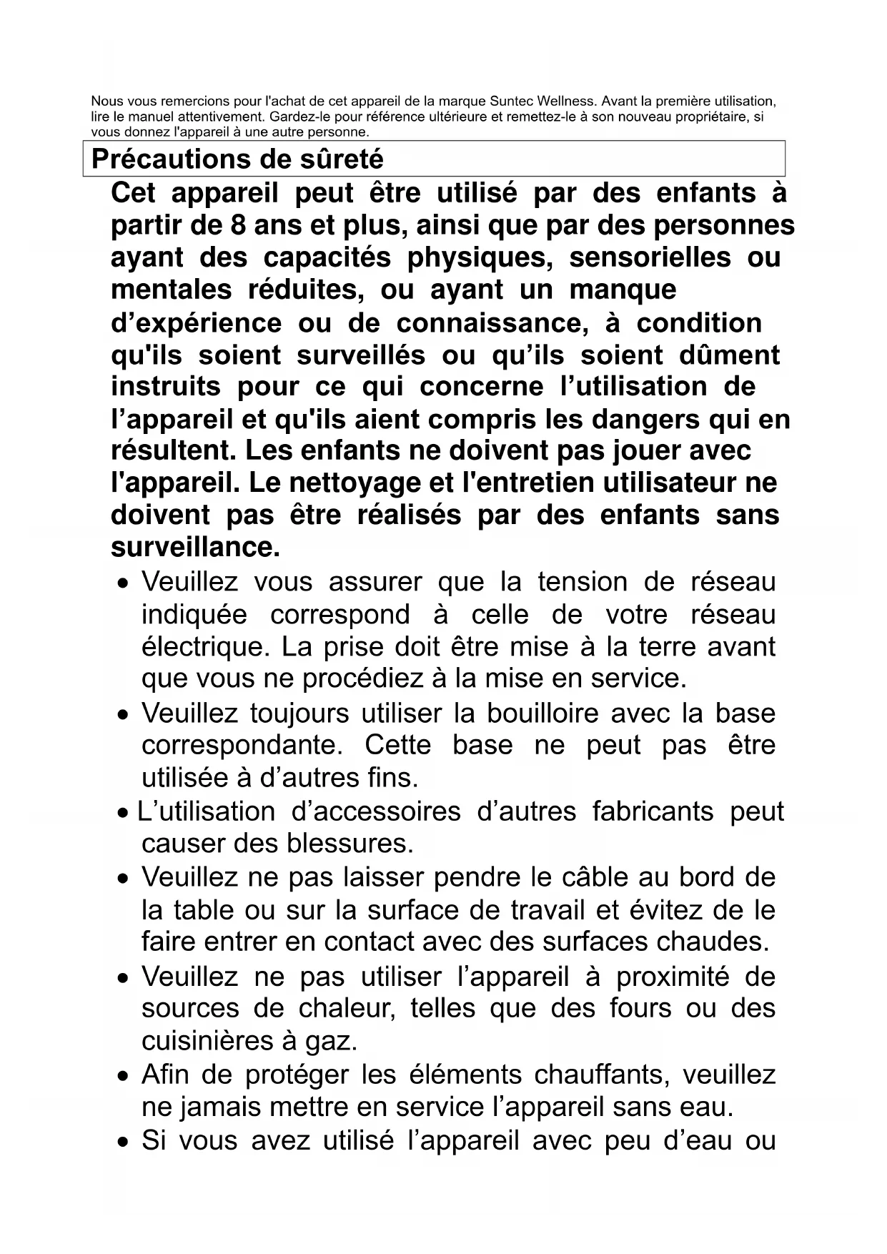 Bouilloire WAK-8489 thermo Mode d‘emploiNous vous remercions pour l'achat de cet appareil de la marque Suntec Wellness. Avant la première utilisation, lire le manuel attentivement. Gardez-le pour référence ultérieure et remettez-le à son nouveau propriétaire, si vous donnez l'appareil à une autre personne. Précautions de sûreté Cet appareil peut être utilisé par des enfants à partir de 8 ans et plus, ainsi que par des personnes ayant des capacités physiques, sensorielles ou mentales réduites, ou ayant un manque d’expérience ou de connaissance, à condition qu'ils soient surveillés ou qu’ils soient dûment instruits pour ce qui concerne l’utilisation de l’appareil et qu'ils aient compris les dangers qui en résultent. Les enfants ne doivent pas jouer avec l'appareil. Le nettoyage et l'entretien utilisateur ne doivent pas être réalisés par des enfants sans surveillance.