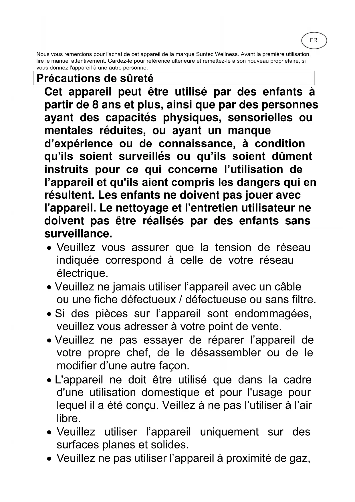 Nous vous remercions pour l'achat de cet appareil de la marque Suntec Wellness. Avant la première utilisation, lire le manuel attentivement. Gardez-le pour référence ultérieure et remettez-le à son nouveau propriétaire, si vous donnez l'appareil à une autre personne. Précautions de sûreté Cet appareil peut être utilisé par des enfants à partir de 8 ans et plus, ainsi que par des personnes ayant des capacités physiques, sensorielles ou mentales réduites, ou ayant un manque d’expérience ou de connaissance, à condition qu'ils soient surveillés ou qu’ils soient dûment instruits pour ce qui concerne l’utilisation de l’appareil et qu'ils aient compris les dangers qui en résultent. Les enfants ne doivent pas jouer avec l'appareil. Le nettoyage et l'entretien utilisateur ne doivent pas être réalisés par des enfants sans surveillance.