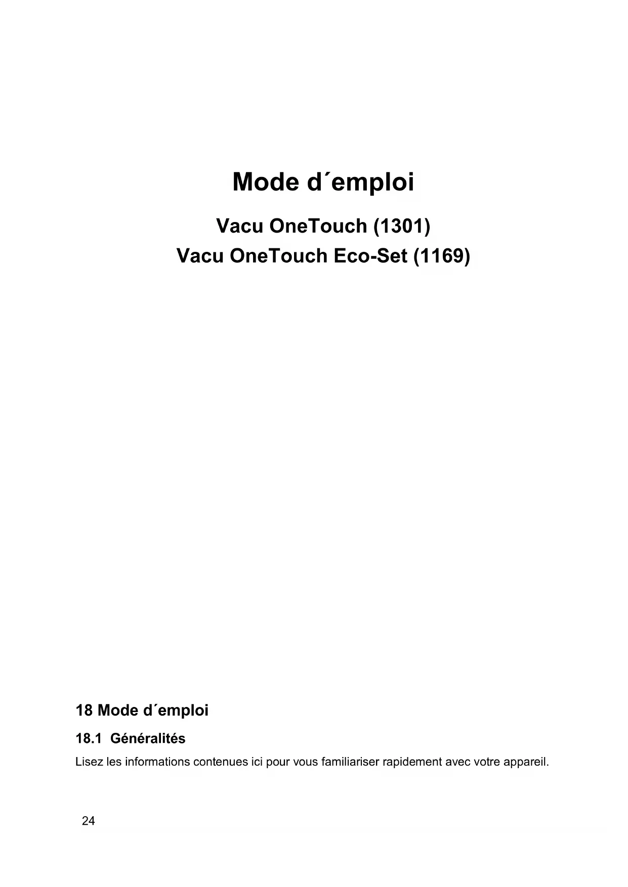 Lisez les informations contenues ici pour vous familiariser rapidement avec votre appareil. Mode d´emploi Vacu OneTouch (1301) Vacu OneTouch Eco-Set (1169)25