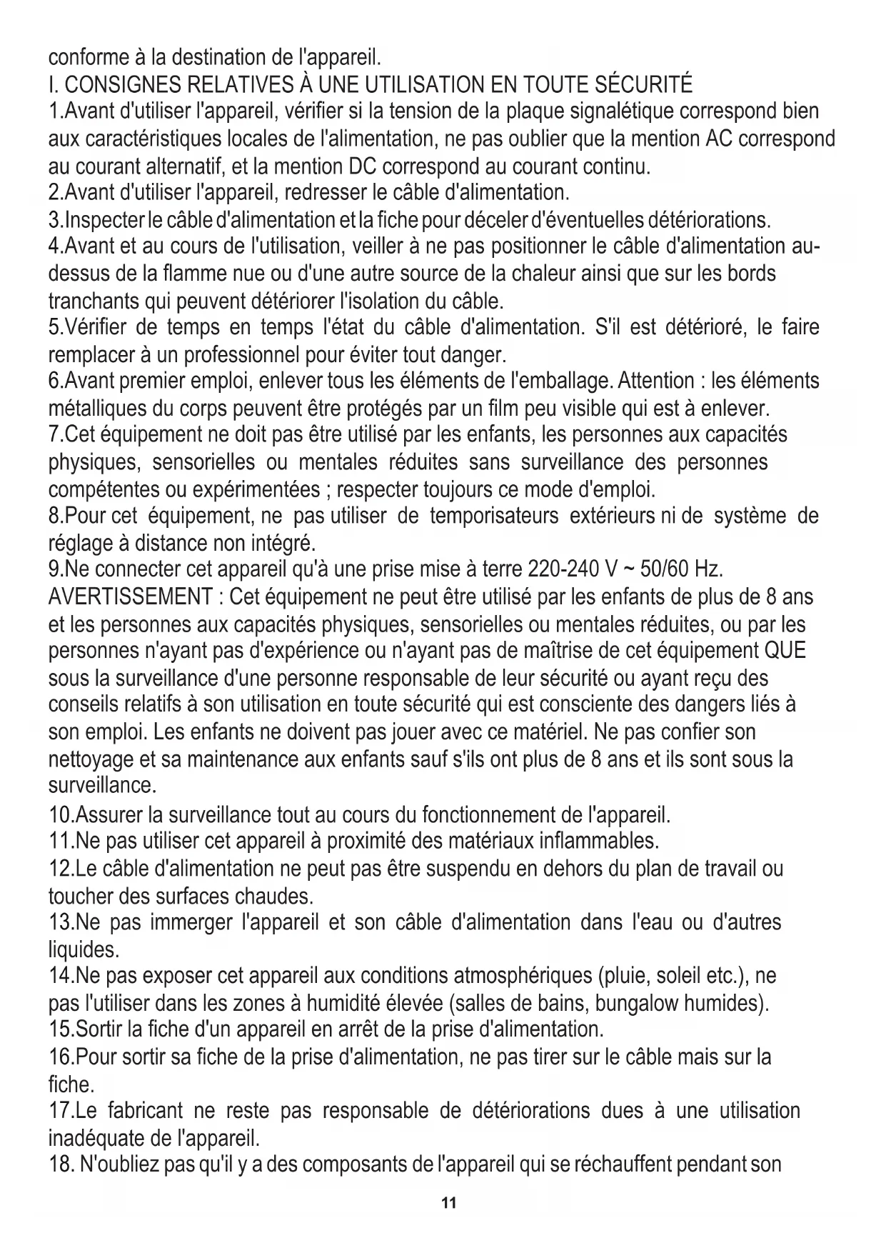 3.Inspecter le câble d'alimentation et la fiche pour déceler d'éventuelles détériorations. 6.Avant premier emploi, enlever tous les éléments de l'emballage. Attention : les éléments métalliques du corps peuvent être protégés par un film peu visible qui est à enlever. 7.Cet équipement ne doit pas être utilisé par les enfants, les personnes aux capacités physiques, sensorielles ou mentales réduites sans surveillance des personnes compétentes ou expérimentées ; respecter toujours ce mode d'emploi. 8.Pour cet équipement, ne pas utiliser de temporisateurs extérieurs ni de système de réglage à distance non intégré. 9.Ne connecter cet appareil qu'à une prise mise à terre 220-240 V ~ 50/60 Hz. 1.Avant d'utiliser l'appareil, vérifier si la tension de la plaque signalétique correspond bien aux caractéristiques locales de l'alimentation, ne pas oublier que la mention AC correspond au courant alternatif, et la mention DC correspond au courant continu. 17.Le fabricant ne reste pas responsable de détériorations dues à une utilisation inadéquate de l'appareil. 12.Le câble d'alimentation ne peut pas être suspendu en dehors du plan de travail ou toucher des surfaces chaudes. 13.Ne pas immerger l'appareil et son câble d'alimentation dans l'eau ou d'autres liquides.