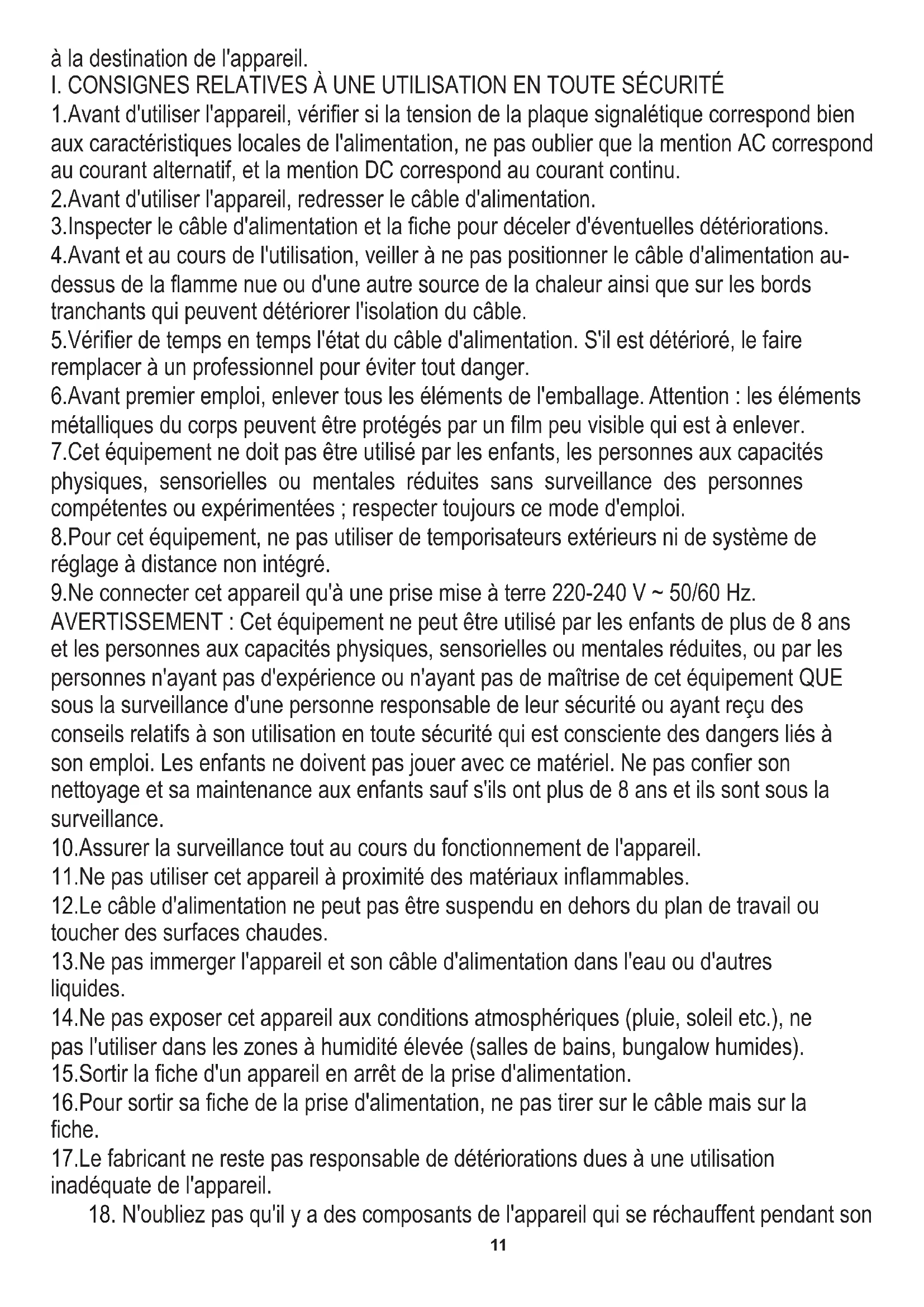 et les personnes aux capacités physiques, sensorielles ou mentales réduites, ou par les personnes n'ayant pas d'expérience ou n'ayant pas de maîtrise de cet équipement QUE sous la surveillance d'une personne responsable de leur sécurité ou ayant reçu des conseils relatifs à son utilisation en toute sécurité qui est consciente des dangers liés à son emploi. Les enfants ne doivent pas jouer avec ce matériel. Ne pas confier son nettoyage et sa maintenance aux enfants sauf s'ils ont plus de 8 ans et ils sont sous la surveillance. 10.Assurer la surveillance tout au cours du fonctionnement de l'appareil. 8.Pour cet équipement, ne pas utiliser de temporisateurs extérieurs ni de système de réglage à distance non intégré. 15.Sortir la fiche d'un appareil en arrêt de la prise d'alimentation. 16.Pour sortir sa fiche de la prise d'alimentation, ne pas tirer sur le câble mais sur la fiche. à la destination de l'appareil. 1.Avant d'utiliser l'appareil, vérifier si la tension de la plaque signalétique correspond bien aux caractéristiques locales de l'alimentation, ne pas oublier que la mention AC correspond au courant alternatif, et la mention DC correspond au courant continu. 6.Avant premier emploi, enlever tous les éléments de l'emballage. Attention : les éléments métalliques du corps peuvent être protégés par un film peu visible qui est à enlever.