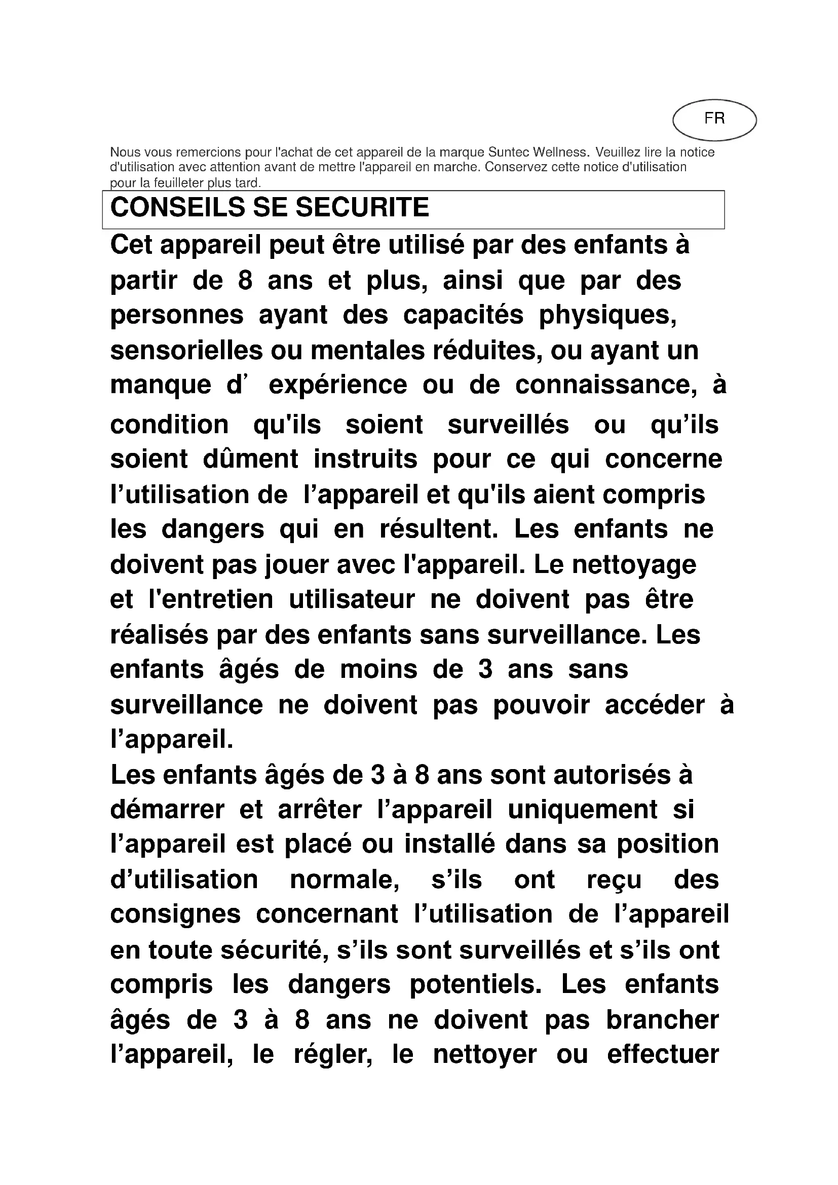 Cet appareil peut être utilisé par des enfants à partir de 8 ans et plus, ainsi que par des personnes ayant des capacités physiques, sensorielles ou mentales réduites, ou ayant un manque d’expérience ou de connaissance, à condition qu'ils soient surveillés ou qu’ils soient dûment instruits pour ce qui concerne l’utilisation de l’appareil et qu'ils aient compris les dangers qui en résultent. Les enfants ne doivent pas jouer avec l'appareil. Le nettoyage et l'entretien utilisateur ne doivent pas être réalisés par des enfants sans surveillance. Les enfants âgés de moins de 3 ans sans surveillance ne doivent pas pouvoir accéder à l’appareil. Les enfants âgés de 3 à 8 ans sont autorisés à démarrer et arrêter l’appareil uniquement si l’appareil est placé ou installé dans sa position d’utilisation normale, s’ils ont reçu des consignes concernant l’utilisation de l’appareil en toute sécurité, s’ils sont surveillés et s’ils ont compris les dangers potentiels. Les enfants âgés de 3 à 8 ans ne doivent pas brancher l’appareil, le régler, le nettoyer ou effectuer FRl’entretien.