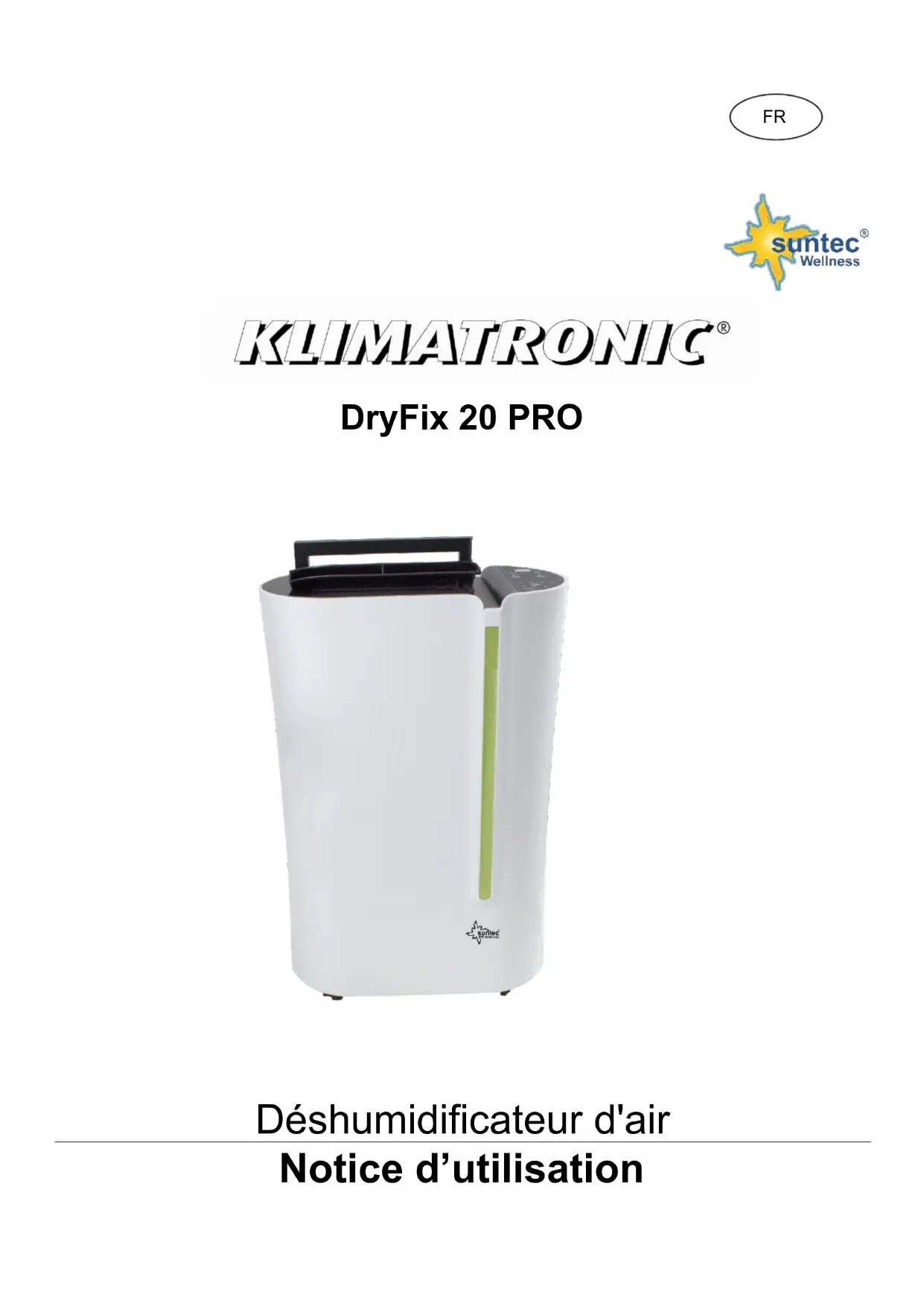 retirez la prise et placez-le dans un endroit sec, frais et sûr.Traitement des problèmes Problème Cause Solution La capacité de déshumidification de l'appareil est très faible en cas de basses températures. Cela est tout à fait normal. Le compresseur déshumidifie l'air de manière optimale lorsque la température ambiante est >15 °C. Si la température est inférieure à 15 °C et que le degré d'humidité de l'air est inférieur à celui réglé, l'appareil ne peut absorber aucune humidité de l'air. De l'air froid et/ou chaud sort de la sortie d'air. Cela est tout à fait normal. Pendant la mise en service, l'humidité de l'air est absorbée et gelée afin de réduire le degré d'humidité dans la pièce. Le voyant de réservoir d'eau plein est activé. Le réservoir est plein ou n'est pas installé correctement dans l'appareil. Videz l'eau du réservoir et assurez-vous que le réservoir est bien mis en place. L'appareil ne fonctionne pas. L'appareil n'est pas raccordé à une source de courant. Branchez l'appareil sur une prise et appuyez sur la touche Power. Les lamelles ne s'ouvrent pas. Le moteur des lamelles est bloqué. Veuillez regarder ce qui bloque les lamelles. Essayez de bouger avec précaution les lamelles vers le haut et le bas pendant que l'appareil est à l'arrêt. Si cela ne fonctionne pas, rapportez l'appareil à votre revendeur. L'appareil ne déshumidifie pas. L'humidité de l'air dans la pièce est- elle inférieure à celle réglée ? Veuillez contrôler les réglages de l'appareil. La température de la pièce est-elle trop faible ? Veuillez essayer d'augmenter la température de la pièce ou déplacez l'appareil dans une autre pièce. La sortie d'air est- elle bloquée ? La distance entre l'appareil et le mur est-elle trop petite ? L'appareil doit être installé à une distance minimale de 20 cm du mur ou d'autres obstacles. La circulation de l'air est très faible. Le filtre à air est-il sale ou obstrué ? Veuillez nettoyer le filtre régulièrement comme indiqué dans la notice d'utilisation. Bruits forts pendant la mise en service. L'appareil est-il posé sur une surface penchée ou instable ? Veuillez placer l'appareil sur une surface plane et de niveau. Le filtre à air est-il sale ? Nettoyez le filtre à air comme indiqué dans la notice d'utilisation. E3 ou E4 Erreur du capteur d'humidité Débranchez la prise et laissez refroidir l'appareil pendant min. 10 minutes. Celui-ci peut ensuite être remis en service. Si le même problème se produit à nouveau, veuillez contacter votre revendeur. E1 ou E2 Erreur du capteur de température Débranchez la prise et laissez refroidir l'appareil pendant min. 10 minutes. Celui-ci peut ensuite être remis en service. Si le même problème se produit à nouveau, veuillez contacter votre revendeur. E5 ou E6 Dysfonctionnement du capteur interne Débranchez la prise et laissez refroidir l'appareil pendant min. 10 minutes. Celui-ci peut ensuite être remis en service. Si le même problème se produit à nouveau, veuillez contacter votre revendeur.Le voyant « Defrost » est activé, le fonctionnement est constamment interrompu. La fonction de protection contre le gel est activée. Veuillez patienter jusqu'à ce que la fonction de protection contre le gel soit désactivée automatiquement. Augmentez la température dans la pièce si ce problème se produit régulièrement. Caractéristiques techniques MODÈLE CARACTÉRISTIQUES TECH. DryFix 20 PRO Capacité de déshumidification (litre/jour à 30 °C et humidité de l'air de 80 %) 20 l Courant absorbé 365W Puissance absorbée 220 V-240 V/50 Hz Dimensions du boîtier 380 x 580 x 195 mm Poids 14,3 kg Agent réfrigérant R290 Intensité du courant 1,2A Degré de déshumidification 35 % – 80 % Agent réfrigérant (CE) N 842/2006 : Ce déshumidificateur d'air contient l'agent réfrigérant R290. La quantité d'agents réfrigérants est cependant inférieure à 1 kg et se trouve dans un circuit de réfrigération fermé. Certes, l'agent réfrigérant ne présente pas de potentiel de destruction de l'ozone mais est, selon le protocole de Kyoto, un gaz dit à effet de serre et peut ainsi contribuer au réchauffement terrestre, si toutefois libéré dans l'atmosphère. C'est pourquoi seuls des techniciens formés et disposant d'un certificat de qualification professionnel de technicien en froid peuvent procéder au remplissage ou à la vidange. Dans le cadre d'une utilisation en bonne et due forme et un circuit d'agent réfrigérant en bon état, il ne faut pas rajouter d'agent réfrigérant à votre déshumidificateur d'air Suntec. R290, GWP: 3, 75g = 0.000225t CO2e Déclaration de conformité CE L'appareil est conforme aux principales exigences relatives à la sécurité et à la santé de l'Union européenne. La déclaration de conformité CE est la base du marquage CE de cet appareil. Par la parution de la présente notice d'utilisation, toutes celles précédemment émises perdent leur validité. SUNTEC, SUNTEC Wellness, KLIMATRONIC et le logo sous forme de soleil sont des marques déposées. © 2020/01 SUNTEC WELLNESS GMBH. Informations relatives à la protection de l'environnement Ce symbole indique que le produit ne doit pas être éliminé comme des déchets ménagers au sein de l'UE. Pour éviter d'éventuels dommages pour l'environnement et la santé des personnes, éliminez l'appareil de manière responsable afin de promouvoir la réutilisation durable des ressources matérielles. Veuillez ramener votre produit usagé dans les points de collecte ou adressez-vous au magasin où vous avez acheté l'appareil. Le produit peut ainsi être recyclé de manière écologique et sûre. Aucune responsabilité n'est prise pour des erreurs d’impression et en cas d'erreurs.