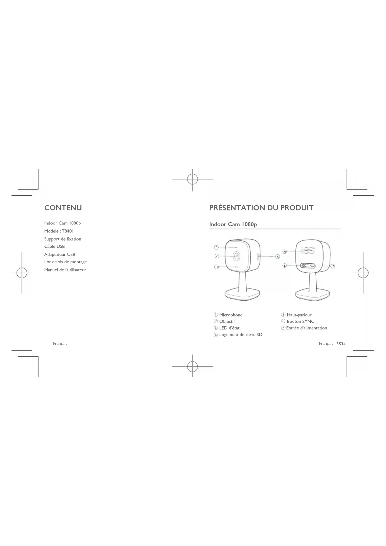 Entrée d'alimentation CONTENU Indoor Cam 1080p Modèle : T8401 Support de xation Câble USB Adaptateur USB Lot de vis de montage Manuel de l'utilisateurFrançais