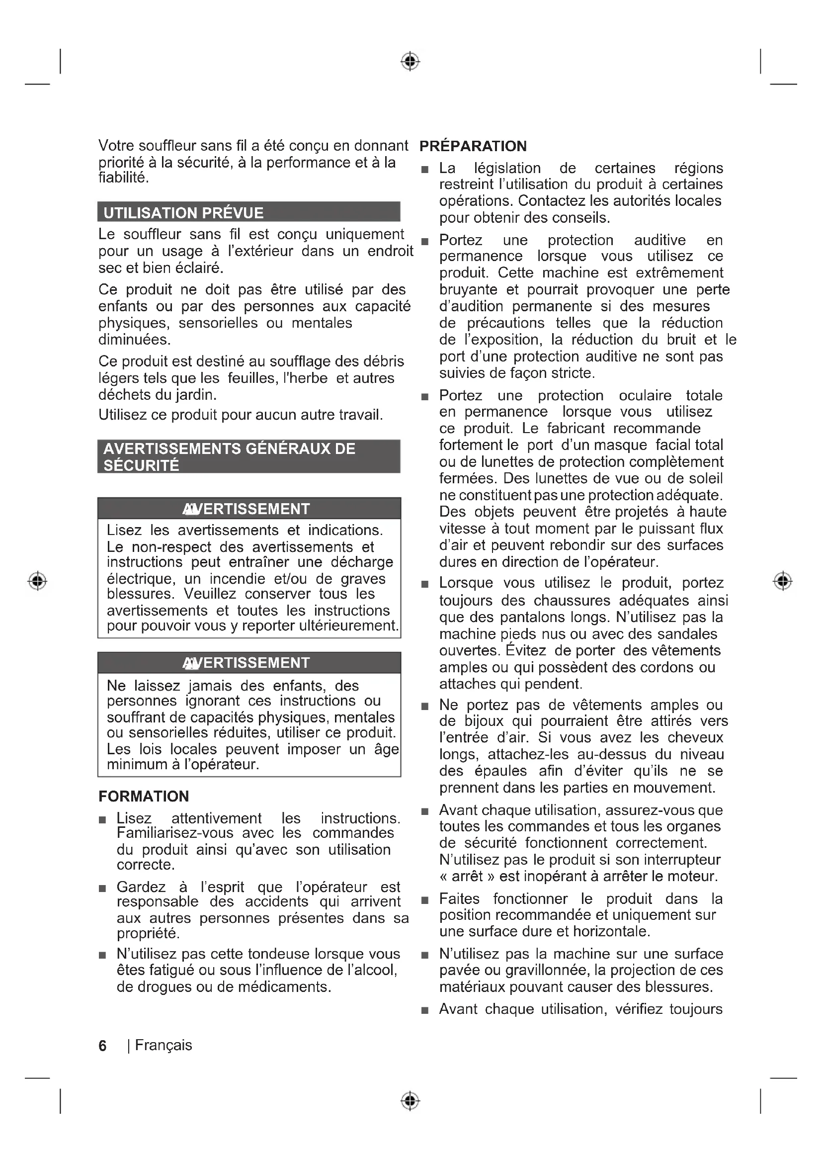 SÉCURITÉ AVERTISSEMENT Lisez les avertissements et indications. Le non-respect des avertissements et instructions peut entraîner une décharge électrique, un incendie et/ou de graves blessures. Veuillez conserver tous les avertissements et toutes les instructions pour pouvoir vous y reporter ultérieurement. AVERTISSEMENT Ne laissez jamais des enfants, des personnes ignorant ces instructions ou souffrant de capacités physiques, mentales ou sensorielles réduites, utiliser ce produit. Les lois locales peuvent imposer un âge minimum à l’opérateur. FORMATION ■ Lisez attentivement les instructions. Familiarisez-vous avec les commandes du produit ainsi qu’avec son utilisation correcte. ■ Gardez à l’esprit que l’opérateur est responsable des accidents qui arrivent aux autres personnes présentes dans sa propriété. ■ N’utilisez pas cette tondeuse lorsque vous êtes fatigué ou sous l’influence de l’alcool, de drogues ou de médicaments. PRÉPARATION ■ La législation de certaines régions restreint l’utilisation du produit à certaines opérations. Contactez les autorités locales pour obtenir des conseils. ■ Portez une protection auditive en permanence lorsque vous utilisez ce produit. Cette machine est extrêmement bruyante et pourrait provoquer une perte d’audition permanente si des mesures de précautions telles que la réduction de l’exposition, la réduction du bruit et le port d’une protection auditive ne sont pas suivies de façon stricte. ■ Portez une protection oculaire totale en permanence lorsque vous utilisez ce produit. Le fabricant recommande fortement le port d’un masque facial total ou de lunettes de protection complètement fermées. Des lunettes de vue ou de soleil ne constituent pas une protection adéquate. Des objets peuvent être projetés à haute vitesse à tout moment par le puissant flux d’air et peuvent rebondir sur des surfaces dures en direction de l’opérateur. ■ Lorsque vous utilisez le produit, portez toujours des chaussures adéquates ainsi que des pantalons longs. N’utilisez pas la machine pieds nus ou avec des sandales ouvertes. Évitez de porter des vêtements amples ou qui possèdent des cordons ou attaches qui pendent. ■ Ne portez pas de vêtements amples ou de bijoux qui pourraient être attirés vers l’entrée d’air. Si vous avez les cheveux longs, attachez-les au-dessus du niveau des épaules afin d’éviter qu’ils ne se prennent dans les parties en mouvement. ■ Avant chaque utilisation, assurez-vous que toutes les commandes et tous les organes de sécurité fonctionnent correctement. N’utilisez pas le produit si son interrupteur « arrêt » est inopérant à arrêter le moteur. ■ Faites fonctionner le produit dans la position recommandée et uniquement sur une surface dure et horizontale. ■ N’utilisez pas la machine sur une surface pavée ou gravillonnée, la projection de ces matériaux pouvant causer des blessures. ■ Avant chaque utilisation, vérifiez toujours7 Français |