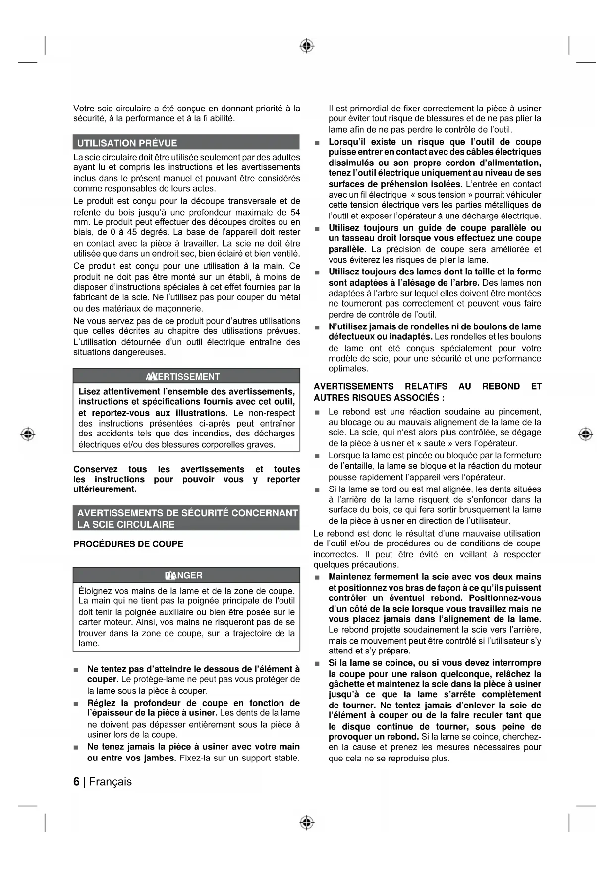 La scie circulaire doit être utilisée seulement par des adultes ayant lu et compris les instructions et les avertissements inclus dans le présent manuel et pouvant être considérés comme responsables de leurs actes. Le produit est conçu pour la découpe transversale et de refente du bois jusqu’à une profondeur maximale de 54 mm. Le produit peut effectuer des découpes droites ou en biais, de 0 à 45 degrés. La base de l’appareil doit rester en contact avec la pièce à travailler. La scie ne doit être utilisée que dans un endroit sec, bien éclairé et bien ventilé. Ce produit est conçu pour une utilisation à la main. Ce produit ne doit pas être monté sur un établi, à moins de disposer d’instructions spéciales à cet effet fournies par la fabricant de la scie. Ne l’utilisez pas pour couper du métal ou des matériaux de maçonnerie. Ne vous servez pas de ce produit pour d’autres utilisations que celles décrites au chapitre des utilisations prévues. L’utilisation détournée d’un outil électrique entraîne des situations dangereuses. AVERTISSEMENT Lisez attentivement l’ensemble des avertissements, instructions et spécifications fournis avec cet outil, et reportez-vous aux illustrations. Le non-respect des instructions présentées ci-après peut entraîner des accidents tels que des incendies, des décharges électriques et/ou des blessures corporelles graves. Conservez tous les avertissements et toutes les instructions pour pouvoir vous y reporter ultérieurement.