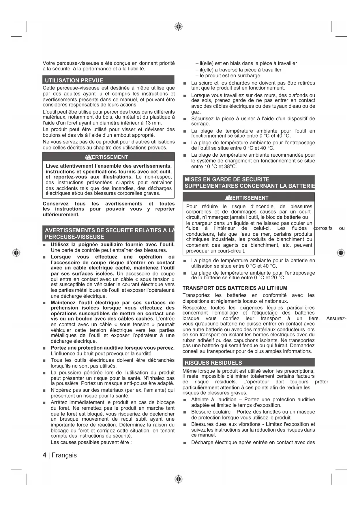 PERCEUSE-VISSEUSE Ŷ Utilisez la poignée auxiliaire fournie avec l’outil. Une perte de contrôle peut entraîner des blessures. Ŷ Lorsque vous effectuez une opération où l’accessoire de coupe risque d’entrer en contact avec un câble électrique caché, maintenez l’outil par ses surfaces isolées. Un accessoire de coupe qui entre en contact avec un câble « sous tension » est susceptible de véhiculer le courant électrique vers les parties métalliques de l’outil et exposer l’opérateur à une décharge électrique. Ŷ Maintenez l’outil électrique par ses surfaces de préhension isolées lorsque vous effectuez des opérations susceptibles de mettre en contact une vis ou un boulon avec des câbles cachés. L’entrée en contact avec un câble « sous tension » pourrait véhiculer cette tension électrique vers les parties métalliques de l’outil et exposer l’opérateur à une décharge électrique. Ŷ Portez une protection auditive lorsque vous percez. L’influence du bruit peut provoquer la surdité. Ŷ Tous les outils électriques doivent être débranchés lorsqu’ils ne sont pas utilisés. Ŷ La poussière générée lors de l’utilisation du produit peut présenter un risque pour la santé. N’inhalez pas la poussière. Portez un masque anti-poussière adapté. Ŷ N’opérez pas sur des matériaux (par ex. l’amiante) qui présentent un risque pour la santé. Ŷ Arrêtez immédiatement le produit en cas de blocage du foret. Ne remettez pas le produit en marche tant que le foret est bloqué, vous risqueriez de déclencher un brusque mouvement de recul subit ayant une importante force de réaction. Déterminez la raison du blocage du foret et corrigez cette situation, en tenant compte des instructions de sécurité. Les causes possibles peuvent être : – il(elle) est en biais dans la pièce à travailler – il(elle) a traversé la pièce à travailler – le produit est en surcharge Ŷ La sciure et les échardes ne doivent pas être retirées tant que le produit est en fonctionnement. Ŷ Lorsque vous travaillez sur des murs, des plafonds ou des sols, prenez garde de ne pas entrer en contact avec des câbles électriques ou des tuyaux d'eau ou de gaz. Ŷ Sécurisez la pièce à usiner à l'aide d'un dispositif de serrage. Ŷ La plage de température ambiante pour l'outil en IRQFWLRQQHPHQWVHVLWXHHQWUH&HW& Ŷ La plage de température ambiante pour l'entreposage GHORXWLOVHVLWXHHQWUH&HW& Ŷ La plage de température ambiante recommandée pour le système de chargement en fonctionnement se situe entre 10 °C et 38°C.