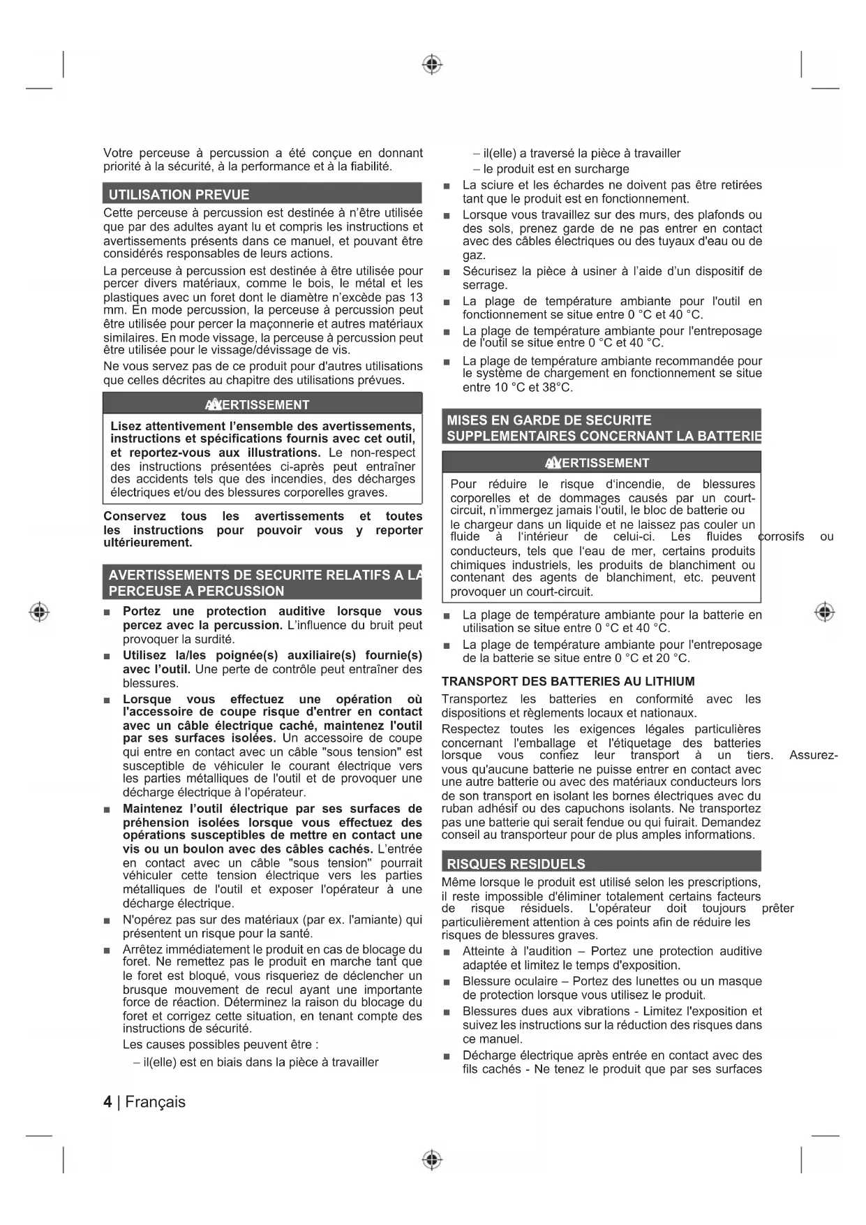 Ŷ Portez une protection auditive lorsque vous percez avec la percussion. L’influence du bruit peut provoquer la surdité. Ŷ Utilisez la/les poignée(s) auxiliaire(s) fournie(s) avec l’outil. Une perte de contrôle peut entraîner des blessures. Ŷ Lorsque vous effectuez une opération où l'accessoire de coupe risque d'entrer en contact avec un câble électrique caché, maintenez l'outil par ses surfaces isolées. Un accessoire de coupe qui entre en contact avec un câble "sous tension" est susceptible de véhiculer le courant électrique vers les parties métalliques de l'outil et de provoquer une décharge électrique à l’opérateur. Ŷ Maintenez l’outil électrique par ses surfaces de préhension isolées lorsque vous effectuez des opérations susceptibles de mettre en contact une vis ou un boulon avec des câbles cachés. L’entrée en contact avec un câble "sous tension" pourrait véhiculer cette tension électrique vers les parties métalliques de l'outil et exposer l'opérateur à une décharge électrique. Ŷ N'opérez pas sur des matériaux (par ex. l'amiante) qui présentent un risque pour la santé. Ŷ Arrêtez immédiatement le produit en cas de blocage du foret. Ne remettez pas le produit en marche tant que le foret est bloqué, vous risqueriez de déclencher un brusque mouvement de recul ayant une importante force de réaction. Déterminez la raison du blocage du foret et corrigez cette situation, en tenant compte des instructions de sécurité. Les causes possibles peuvent être : – il(elle) est en biais dans la pièce à travailler – il(elle) a traversé la pièce à travailler – le produit est en surcharge Ŷ La sciure et les échardes ne doivent pas être retirées tant que le produit est en fonctionnement. Ŷ Lorsque vous travaillez sur des murs, des plafonds ou des sols, prenez garde de ne pas entrer en contact avec des câbles électriques ou des tuyaux d'eau ou de gaz. Ŷ Sécurisez la pièce à usiner à l’aide d’un dispositif de serrage. Ŷ La plage de température ambiante pour l'outil en IRQFWLRQQHPHQWVHVLWXHHQWUH&HW& Ŷ La plage de température ambiante pour l'entreposage GHORXWLOVHVLWXHHQWUH&HW& Ŷ La plage de température ambiante recommandée pour le système de chargement en fonctionnement se situe entre 10 °C et 38°C.