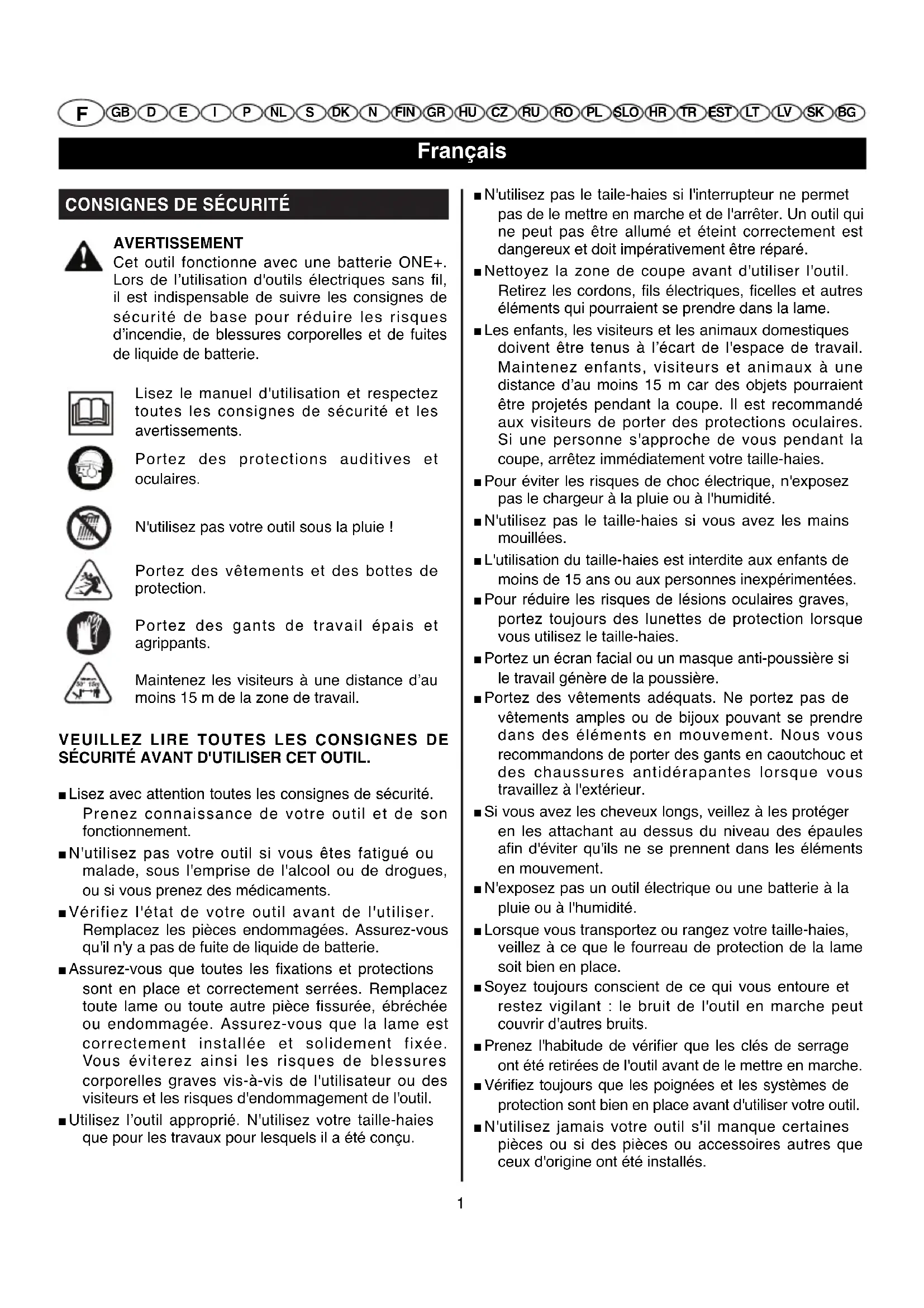 SÉCURITÉ AVANT D'UTILISER CET OUTIL. ■ Lisez avec attention toutes les consignes de sécurité. Prenez connaissance de votre outil et de son fonctionnement. ■ N'utilisez pas votre outil si vous êtes fatigué ou malade, sous l'emprise de l'alcool ou de drogues, ou si vous prenez des médicaments. ■ Vérifiez l'état de votre outil avant de l'utiliser. Remplacez les pièces endommagées. Assurez-vous qu'il n'y a pas de fuite de liquide de batterie. ■ Assurez-vous que toutes les fixations et protections sont en place et correctement serrées. Remplacez toute lame ou toute autre pièce fissurée, ébréchée ou endommagée. Assurez-vous que la lame est correctement installée et solidement fixée. Vous éviterez ainsi les risques de blessures corporelles graves vis-à-vis de l'utilisateur ou des visiteurs et les risques d'endommagement de l'outil. ■ Utilisez l’outil approprié. N'utilisez votre taille-haies que pour les travaux pour lesquels il a été conçu. ■ N'utilisez pas le taile-haies si l'interrupteur ne permet pas de le mettre en marche et de l'arrêter. Un outil qui ne peut pas être allumé et éteint correctement est dangereux et doit impérativement être réparé. ■ Nettoyez la zone de coupe avant d'utiliser l'outil. Retirez les cordons, fils électriques, ficelles et autres éléments qui pourraient se prendre dans la lame. ■ Les enfants, les visiteurs et les animaux domestiques doivent être tenus à l’écart de l'espace de travail. Maintenez enfants, visiteurs et animaux à une distance d’au moins 15 m car des objets pourraient être projetés pendant la coupe. Il est recommandé aux visiteurs de porter des protections oculaires. Si une personne s'approche de vous pendant la coupe, arrêtez immédiatement votre taille-haies. ■ Pour éviter les risques de choc électrique, n'exposez pas le chargeur à la pluie ou à l'humidité. ■ N'utilisez pas le taille-haies si vous avez les mains mouillées. ■ L'utilisation du taille-haies est interdite aux enfants de moins de 15 ans ou aux personnes inexpérimentées. ■ Pour réduire les risques de lésions oculaires graves, portez toujours des lunettes de protection lorsque vous utilisez le taille-haies. ■ Portez un écran facial ou un masque anti-poussière si le travail génère de la poussière. ■ Portez des vêtements adéquats. Ne portez pas de vêtements amples ou de bijoux pouvant se prendre dans des éléments en mouvement. Nous vous recommandons de porter des gants en caoutchouc et des chaussures antidérapantes lorsque vous travaillez à l'extérieur. ■ Si vous avez les cheveux longs, veillez à les protéger en les attachant au dessus du niveau des épaules afin d'éviter qu'ils ne se prennent dans les éléments en mouvement. ■ N'exposez pas un outil électrique ou une batterie à la pluie ou à l'humidité. ■ Lorsque vous transportez ou rangez votre taille-haies, veillez à ce que le fourreau de protection de la lame soit bien en place. ■ Soyez toujours conscient de ce qui vous entoure et restez vigilant : le bruit de l'outil en marche peut couvrir d'autres bruits. ■ Prenez l'habitude de vérifier que les clés de serrage ont été retirées de l'outil avant de le mettre en marche. ■ Vérifiez toujours que les poignées et les systèmes de protection sont bien en place avant d'utiliser votre outil. ■ N'utilisez jamais votre outil s'il manque certaines pièces ou si des pièces ou accessoires autres que ceux d'origine ont été installés. Lisez le manuel d'utilisation et respectez toutes les consignes de sécurité et les avertissements. Portez des protections auditives et oculaires. N'utilisez pas votre outil sous la pluie ! Portez des vêtements et des bottes de protection. Portez des gants de travail épais et agrippants. Maintenez les visiteurs à une distance d’au moins 15 m de la zone de travail.