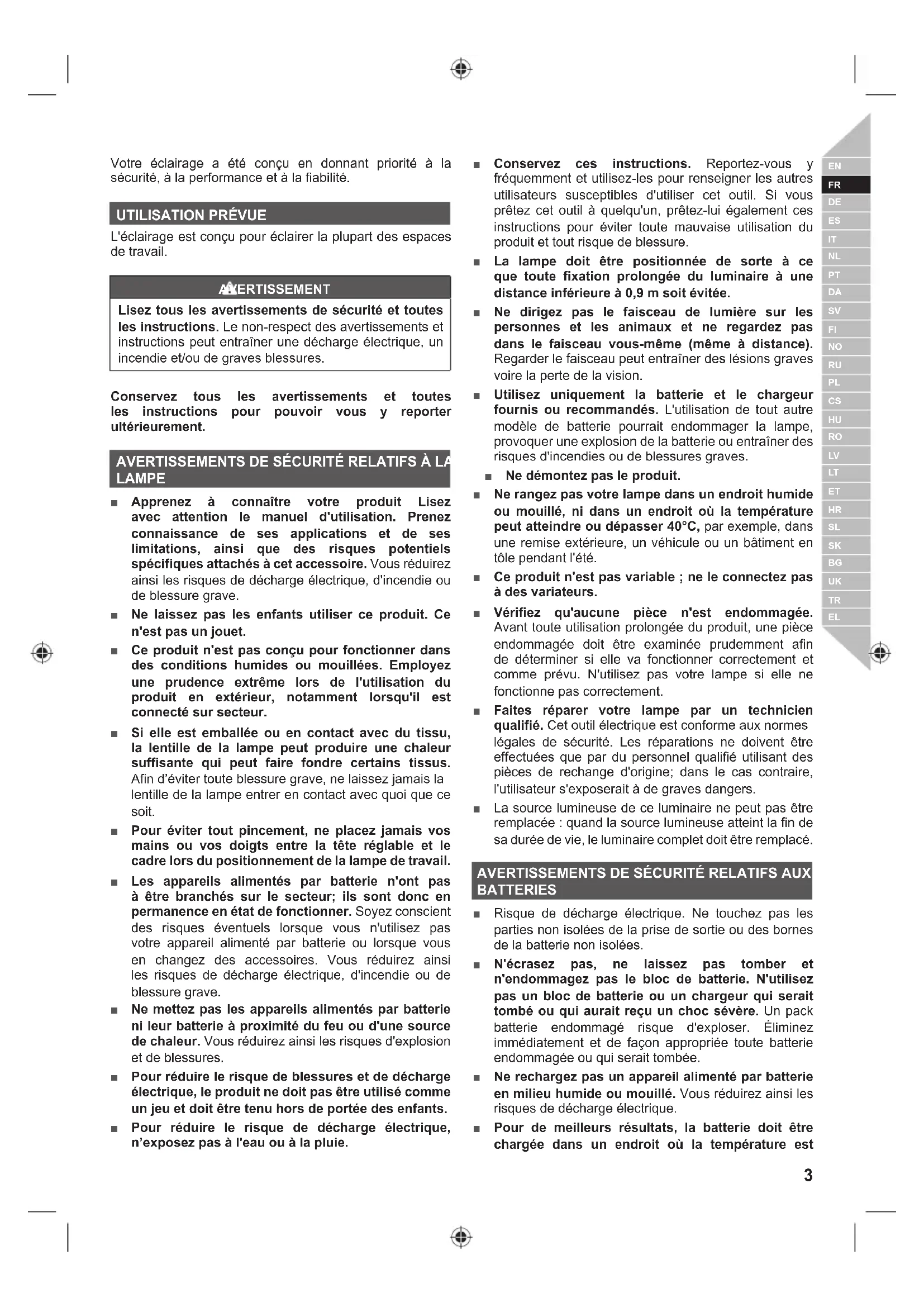 LAMPE Ŷ Apprenez à connaître votre produit Lisez avec attention le manuel d'utilisation. Prenez connaissance de ses applications et de ses limitations, ainsi que des risques potentiels spécifiques attachés à cet accessoire. Vous réduirez ainsi les risques de décharge électrique, d'incendie ou de blessure grave. Ŷ Ne laissez pas les enfants utiliser ce produit. Ce n'est pas un jouet. Ŷ Ce produit n'est pas conçu pour fonctionner dans des conditions humides ou mouillées. Employez une prudence extrême lors de l'utilisation du produit en extérieur, notamment lorsqu'il est connecté sur secteur. Ŷ Si elle est emballée ou en contact avec du tissu, la lentille de la lampe peut produire une chaleur suffisante qui peut faire fondre certains tissus. $ILQG¶pYLWHUWRXWHEOHVVXUHJUDYHQHODLVVH]MDPDLVOD lentille de la lampe entrer en contact avec quoi que ce soit. Ŷ Pour éviter tout pincement, ne placez jamais vos mains ou vos doigts entre la tête réglable et le cadre lors du positionnement de la lampe de travail. Ŷ Les appareils alimentés par batterie n'ont pas à être branchés sur le secteur; ils sont donc en permanence en état de fonctionner. Soyez conscient des risques éventuels lorsque vous n'utilisez pas votre appareil alimenté par batterie ou lorsque vous en changez des accessoires. Vous réduirez ainsi les risques de décharge électrique, d'incendie ou de blessure grave. Ŷ Ne mettez pas les appareils alimentés par batterie ni leur batterie à proximité du feu ou d'une source de chaleur. Vous réduirez ainsi les risques d'explosion et de blessures. Ŷ Pour réduire le risque de blessures et de décharge électrique, le produit ne doit pas être utilisé comme un jeu et doit être tenu hors de portée des enfants. Ŷ Pour réduire le risque de décharge électrique, n’exposez pas à l'eau ou à la pluie. Ŷ Conservez ces instructions. Reportez-vous y fréquemment et utilisez-les pour renseigner les autres utilisateurs susceptibles d'utiliser cet outil. Si vous prêtez cet outil à quelqu'un, prêtez-lui également ces instructions pour éviter toute mauvaise utilisation du produit et tout risque de blessure. Ŷ La lampe doit être positionnée de sorte à ce que toute fixation prolongée du luminaire à une distance inférieure à 0,9 m soit évitée. Ŷ Ne dirigez pas le faisceau de lumière sur les personnes et les animaux et ne regardez pas dans le faisceau vous-même (même à distance). Regarder le faisceau peut entraîner des lésions graves voire la perte de la vision. Ŷ Utilisez uniquement la batterie et le chargeur fournis ou recommandés. L'utilisation de tout autre modèle de batterie pourrait endommager la lampe, provoquer une explosion de la batterie ou entraîner des risques d'incendies ou de blessures graves. Ŷ Ne démontez pas le produit. Ŷ Ne rangez pas votre lampe dans un endroit humide ou mouillé, ni dans un endroit où la température peut atteindre ou dépasser 40°C, par exemple, dans une remise extérieure, un véhicule ou un bâtiment en tôle pendant l'été. Ŷ Ce produit n'est pas variable ; ne le connectez pas à des variateurs. Ŷ Vérifiez qu'aucune pièce n'est endommagée. Avant toute utilisation prolongée du produit, une pièce endommagée doit être examinée prudemment afin de déterminer si elle va fonctionner correctement et comme prévu. N'utilisez pas votre lampe si elle ne fonctionne pas correctement. Ŷ Faites réparer votre lampe par un technicien qualifié.&HWRXWLOpOHFWULTXHHVWFRQIRUPHDX[QRUPHV légales de sécurité. Les réparations ne doivent être effectuées que par du personnel qualifié utilisant des pièces de rechange d'origine; dans le cas contraire, l'utilisateur s'exposerait à de graves dangers. Ŷ La source lumineuse de ce luminaire ne peut pas être remplacée : quand la source lumineuse atteint la fin de sa durée de vie, le luminaire complet doit être remplacé.