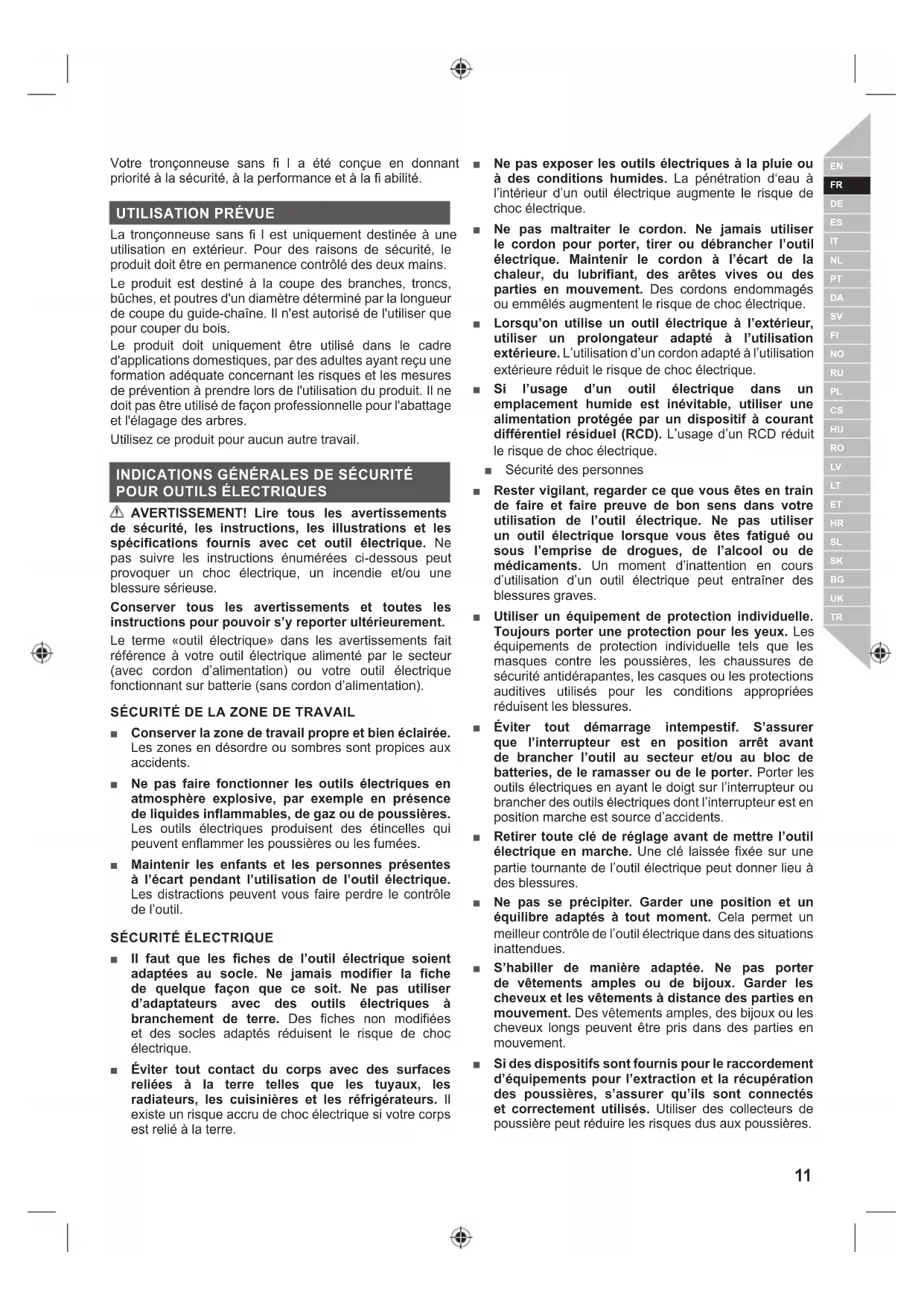 La tronçonneuse sans fi l est uniquement destinée à une utilisation en extérieur. Pour des raisons de sécurité, le produit doit être en permanence contrôlé des deux mains. Le produit est destiné à la coupe des branches, troncs, bûches, et poutres d'un diamètre déterminé par la longueur de coupe du guide-chaîne. Il n'est autorisé de l'utiliser que pour couper du bois. Le produit doit uniquement être utilisé dans le cadre d'applications domestiques, par des adultes ayant reçu une formation adéquate concernant les risques et les mesures de prévention à prendre lors de l'utilisation du produit. Il ne doit pas être utilisé de façon professionnelle pour l'abattage et l'élagage des arbres. Utilisez ce produit pour aucun autre travail. INDICATIONS GÉNÉRALES DE SÉCURITÉ