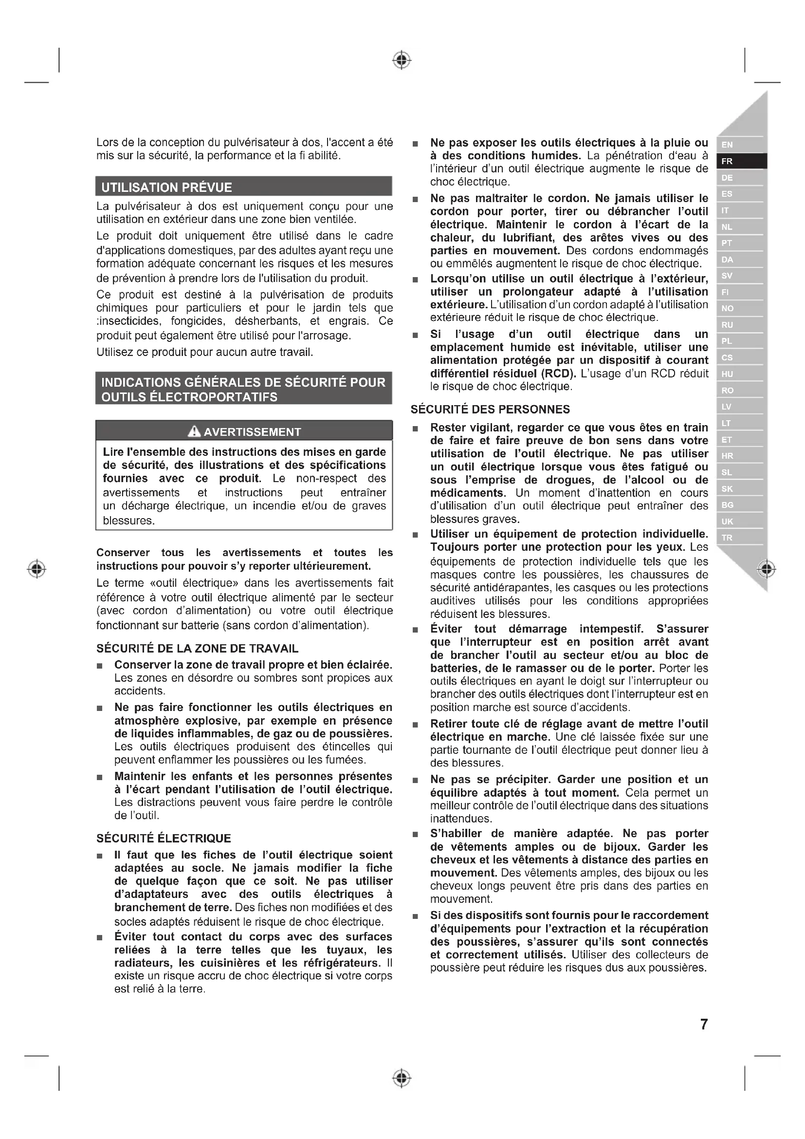La pulvérisateur à dos est uniquement conçu pour une utilisation en extérieur dans une zone bien ventilée. Le produit doit uniquement être utilisé dans le cadre d'applications domestiques, par des adultes ayant reçu une formation adéquate concernant les risques et les mesures de prévention à prendre lors de l'utilisation du produit. Ce produit est destiné à la pulvérisation de produits chimiques pour particuliers et pour le jardin tels que :insecticides, fongicides, désherbants, et engrais. Ce produit peut également être utilisé pour l'arrosage. Utilisez ce produit pour aucun autre travail. INDICATIONS GÉNÉRALES DE SÉCURITÉ POUR OUTILS ÉLECTROPORTATIFS AVERTISSEMENT Lire l'ensemble des instructions des mises en garde de sécurité, des illustrations et des spécifications fournies avec ce produit. Le non-respect des avertissements et instructions peut entraîner un décharge électrique, un incendie et/ou de graves blessures. Conserver tous les avertissements et toutes les instructions pour pouvoir s’y reporter ultérieurement. Le terme «outil électrique» dans les avertissements fait référence à votre outil électrique alimenté par le secteur (avec cordon d’alimentation) ou votre outil électrique fonctionnant sur batterie (sans cordon d’alimentation). SÉCURITÉ DE LA ZONE DE TRAVAIL ■ Conserver la zone de travail propre et bien éclairée. Les zones en désordre ou sombres sont propices aux accidents. ■ Ne pas faire fonctionner les outils électriques en atmosphère explosive, par exemple en présence de liquides inflammables, de gaz ou de poussières. Les outils électriques produisent des étincelles qui peuvent enflammer les poussières ou les fumées. ■ Maintenir les enfants et les personnes présentes à l’écart pendant l’utilisation de l’outil électrique. Les distractions peuvent vous faire perdre le contrôle de l’outil.