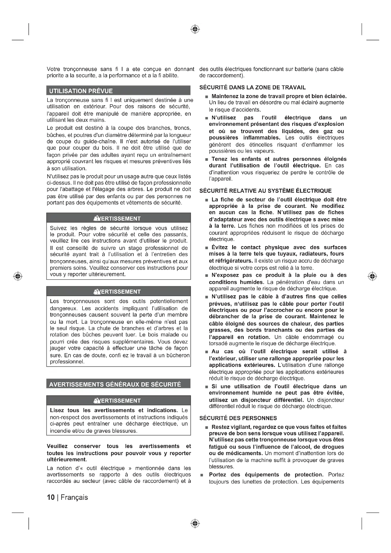 La tronçonneuse sans fi l est uniquement destinée à une utilisation en extérieur. Pour des raisons de sécurité, l'appareil doit être manipulé de manière appropriée, en utilisant les deux mains. Le produit est destiné à la coupe des branches, troncs, bûches, et poutres d'un diamètre déterminé par la longueur de coupe du guide-chaîne. Il n'est autorisé de l'utiliser que pour couper du bois. Il ne doit être utilisé que de façon privée par des adultes ayant reçu un entraînement approprié couvrant les risques et mesures préventives liés à son utilisation. N'utilisez pas le produit pour un usage autre que ceux listés ci-dessus. Il ne doit pas être utilisé de façon professionnelle pour l'abattage et l'élagage des arbres. Le produit ne doit pas être utilisé par des enfants ou par des personnes ne portant pas des équipements et vêtements de sécurité. AVERTISSEMENT Suivez les règles de sécurité lorsque vous utilisez le produit. Pour votre sécurité et celle des passants, veuillez lire ces instructions avant d’utiliser le produit. Il est conseillé de suivre un stage professionnel de sécurité ayant trait à l’utilisation et à l’entretien des tronçonneuses, ainsi qu’aux mesures préventives et aux premiers soins. Veuillez conserver ces instructions pour vous y reporter ultérieurement. AVERTISSEMENT Les tronçonneuses sont des outils potentiellement dangereux. Les accidents impliquant l’utilisation de tronçonneuses causent souvent la perte d’un membre ou la mort. La tronçonneuse en elle-même n’est pas le seul risque. La chute de branches et d’arbres et la rotation des bûches peuvent tuer. Le bois malade ou pourri crée des risques supplémentaires. Vous devez jauger votre capacité à effectuer une tâche de façon sure. En cas de doute, confi ez le travail à un bûcheron professionnel. AVERTISSEMENTS GÉNÉRAUX DE SÉCURITÉ AVERTISSEMENT Lisez tous les avertissements et indications. Le non-respect des avertissements et instructions indiqués ci-après peut entraîner une décharge électrique, un incendie et/ou de graves blessures. Veuillez conserver tous les avertissements et toutes les instructions pour pouvoir vous y reporter ultérieurement. La notion d’« outil électrique » mentionnée dans les avertissements se rapporte à des outils électriques raccordés au secteur (avec câble de raccordement) et à des outils électriques fonctionnant sur batterie (sans câble de raccordement). SÉCURITÉ DANS LA ZONE DE TRAVAIL ■ Maintenez la zone de travail propre et bien éclairée. Un lieu de travail en désordre ou mal éclairé augmente le risque d’accidents. ■ N’utilisez pas l’outil électrique dans un environnement présentant des risques d’explosion et où se trouvent des liquides, des gaz ou poussières inflammables. Les outils électriques génèrent des étincelles risquant d’enflammer les poussières ou les vapeurs. ■ Tenez les enfants et autres personnes éloignés durant l’utilisation de l’outil électrique. En cas d’inattention vous risqueriez de perdre le contrôle de l’appareil. SÉCURITÉ RELATIVE AU SYSTÈME ÉLECTRIQUE ■ La fiche de secteur de l’outil électrique doit être appropriée à la prise de courant. Ne modifiez en aucun cas la fiche. N’utilisez pas de fiches d’adaptateur avec des outils électrique s avec mise à la terre. Les fiches non modifiées et les prises de courant appropriées réduisent le risque de décharge électrique. ■ Évitez le contact physique avec des surfaces mises à la terre tels que tuyaux, radiateurs, fours et réfrigérateurs. Il existe un risque accru de décharge électrique si votre corps est relié à la terre. ■ N'exposez pas ce produit à la pluie ou à des conditions humides. La pénétration d'eau dans un appareil augmente le risque de décharge électrique. ■ N’utilisez pas le câble à d’autres fins que celles prévues, n‘utilisez pas le câble pour porter l’outil électriques ou pour l’accrocher ou encore pour le débrancher de la prise de courant. Maintenez le câble éloigné des sources de chaleur, des parties grasses, des bords tranchants ou des parties de l’appareil en rotation. Un câble endommagé ou torsadé augmente le risque de décharge électrique. ■ Au cas où l’outil électrique serait utilisé à l’extérieur, utiliser une rallonge appropriée pour les applications extérieures. L’utilisation d’une rallonge électrique appropriée pour les applications extérieures réduit le risque de décharge électrique. ■ Si une utilisation de l’outil électrique dans un environnement humide ne peut pas être évitée, utilisez un disjoncteur différentiel. Un disjoncteur différentiel réduit le risque de décharge électrique.
