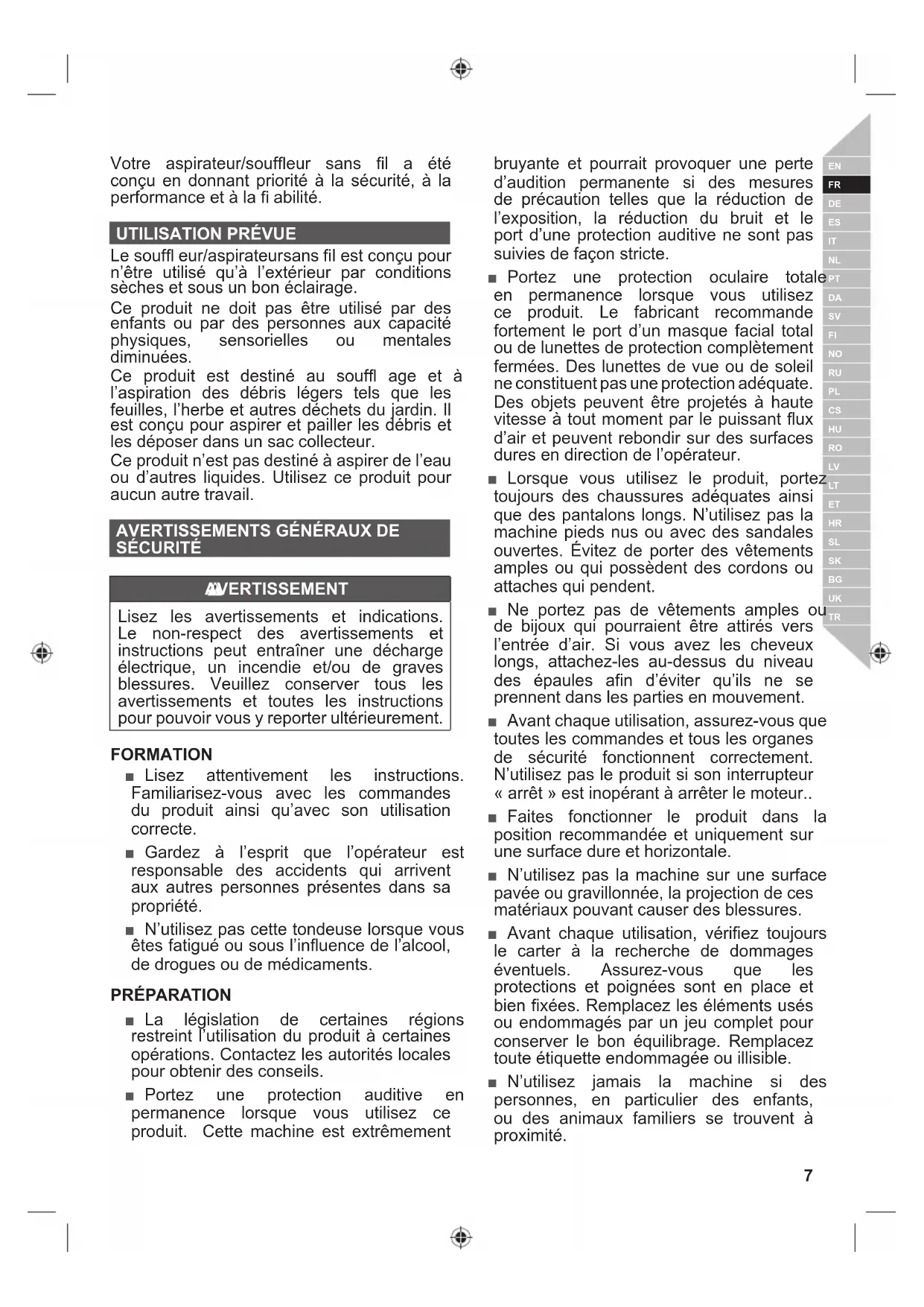 SÉCURITÉ AVERTISSEMENT Lisez les avertissements et indications. Le non-respect des avertissements et instructions peut entraîner une décharge électrique, un incendie et/ou de graves blessures. Veuillez conserver tous les avertissements et toutes les instructions pour pouvoir vous y reporter ultérieurement. FORMATION ■ Lisez attentivement les instructions. Familiarisez-vous avec les commandes du produit ainsi qu’avec son utilisation correcte. ■ Gardez à l’esprit que l’opérateur est responsable des accidents qui arrivent aux autres personnes présentes dans sa propriété. ■ N’utilisez pas cette tondeuse lorsque vous êtes fatigué ou sous l’influence de l’alcool, de drogues ou de médicaments. PRÉP ARA TION ■ La législation de certaines régions restreint l’utilisation du produit à certaines opérations. Contactez les autorités locales pour obtenir des conseils. ■ Portez une protection auditive en permanence lorsque vous utilisez ce produit. Cette machine est extrêmement bruyante et pourrait provoquer une perte d’audition permanente si des mesures de précaution telles que la réduction de l’exposition, la réduction du bruit et le port d’une protection auditive ne sont pas suivies de façon stricte. ■ Portez une protection oculaire totale en permanence lorsque vous utilisez ce produit. Le fabricant recommande fortement le port d’un masque facial total ou de lunettes de protection complètement fermées. Des lunettes de vue ou de soleil ne constituent pas une protection adéquate. Des objets peuvent être projetés à haute vitesse à tout moment par le puissant flux d’air et peuvent rebondir sur des surfaces dures en direction de l’opérateur. ■ Lorsque vous utilisez le produit, portez toujours des chaussures adéquates ainsi que des pantalons longs. N’utilisez pas la machine pieds nus ou avec des sandales ouvertes. Évitez de porter des vêtements amples ou qui possèdent des cordons ou attaches qui pendent. ■ Ne portez pas de vêtements amples ou de bijoux qui pourraient être attirés vers l’entrée d’air. Si vous avez les cheveux longs, attachez-les au-dessus du niveau des épaules afin d’éviter qu’ils ne se prennent dans les parties en mouvement. ■ Avant chaque utilisation, assurez-vous que toutes les commandes et tous les organes de sécurité fonctionnent correctement. N’utilisez pas le produit si son interrupteur « arrêt » est inopérant à arrêter le moteur.. ■ Faites fonctionner le produit dans la position recommandée et uniquement sur une surface dure et horizontale. ■ N’utilisez pas la machine sur une surface pavée ou gravillonnée, la projection de ces matériaux pouvant causer des blessures. ■ Avant chaque utilisation, vérifiez toujours le carter à la recherche de dommages éventuels. Assurez-vous que les protections et poignées sont en place et bien fixées. Remplacez les éléments usés ou endommagés par un jeu complet pour conserver le bon équilibrage. Remplacez toute étiquette endommagée ou illisible. ■ N’utilisez jamais la machine si des personnes, en particulier des enfants, ou des animaux familiers se trouvent à proximité.8 | Français ■ Gardez toutes les entrées d’air de refroidissement exemptes de débris. ■ Utilisez un râteau et un balai pour détacher les débris avant d’utiliser le souffleur. ■ Dégagez la zone de travail avant chaque utilisation. Retirez tous les objets tels que des pierres, du verre brisé, des clous, des câbles ou de la ficelle qui pourraient se voir projeter à une distance considérable par la haute vitesse de l’air. AVERTISSEMENT Avant d’utiliser le produit en mode d’aspiration, vous devez assembler les tubes d’aspiration supérieur et inférieur . Il s’agit d’une opération à ef fectuer une seule fois. N’utilisez jamais l’aspirateur avec uniquement le tube supérieur en place. Le risque de blessure augmente de façon signifi cative si vous ne tenez pas compte de cet avertissement.