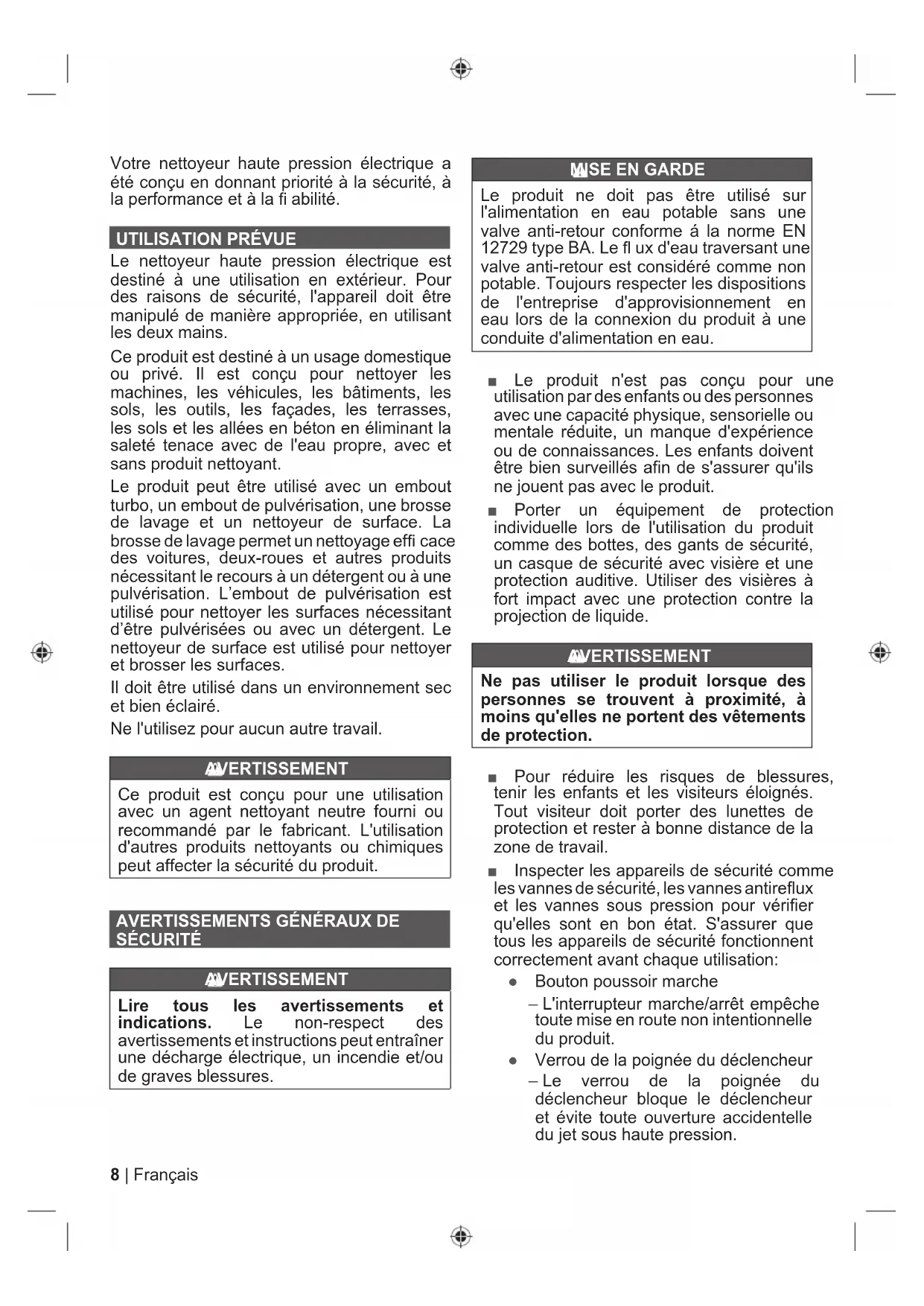 Le produit ne doit pas être utilisé sur l'alimentation en eau potable sans une valve anti-retour conforme á la norme EN 12729 type BA. Le fl ux d'eau traversant une valve anti-retour est considéré comme non potable. Toujours respecter les dispositions de l'entreprise d'approvisionnement en eau lors de la connexion du produit à une conduite d'alimentation en eau. ■ Le produit n'est pas conçu pour une utilisation par des enfants ou des personnes avec une capacité physique, sensorielle ou mentale réduite, un manque d'expérience ou de connaissances. Les enfants doivent être bien surveillés afin de s'assurer qu'ils ne jouent pas avec le produit. ■ Porter un équipement de protection individuelle lors de l'utilisation du produit comme des bottes, des gants de sécurité, un casque de sécurité avec visière et une protection auditive. Utiliser des visières à fort impact avec une protection contre la projection de liquide. AVERTISSEMENT Ne pas utiliser le produit lorsque des personnes se trouvent à proximité, à moins qu'elles ne portent des vêtements de protection. ■ Pour réduire les risques de blessures, tenir les enfants et les visiteurs éloignés. Tout visiteur doit porter des lunettes de protection et rester à bonne distance de la zone de travail. ■ Inspecter les appareils de sécurité comme les vannes de sécurité, les vannes antireflux et les vannes sous pression pour vérifier qu'elles sont en bon état. S'assurer que tous les appareils de sécurité fonctionnent correctement avant chaque utilisation: ● Bouton poussoir marche – L'interrupteur marche/arrêt empêche toute mise en route non intentionnelle du produit. ● Verrou de la poignée du déclencheur – Le verrou de la poignée du déclencheur bloque le déclencheur et évite toute ouverture accidentelle du jet sous haute pression.9 Français |