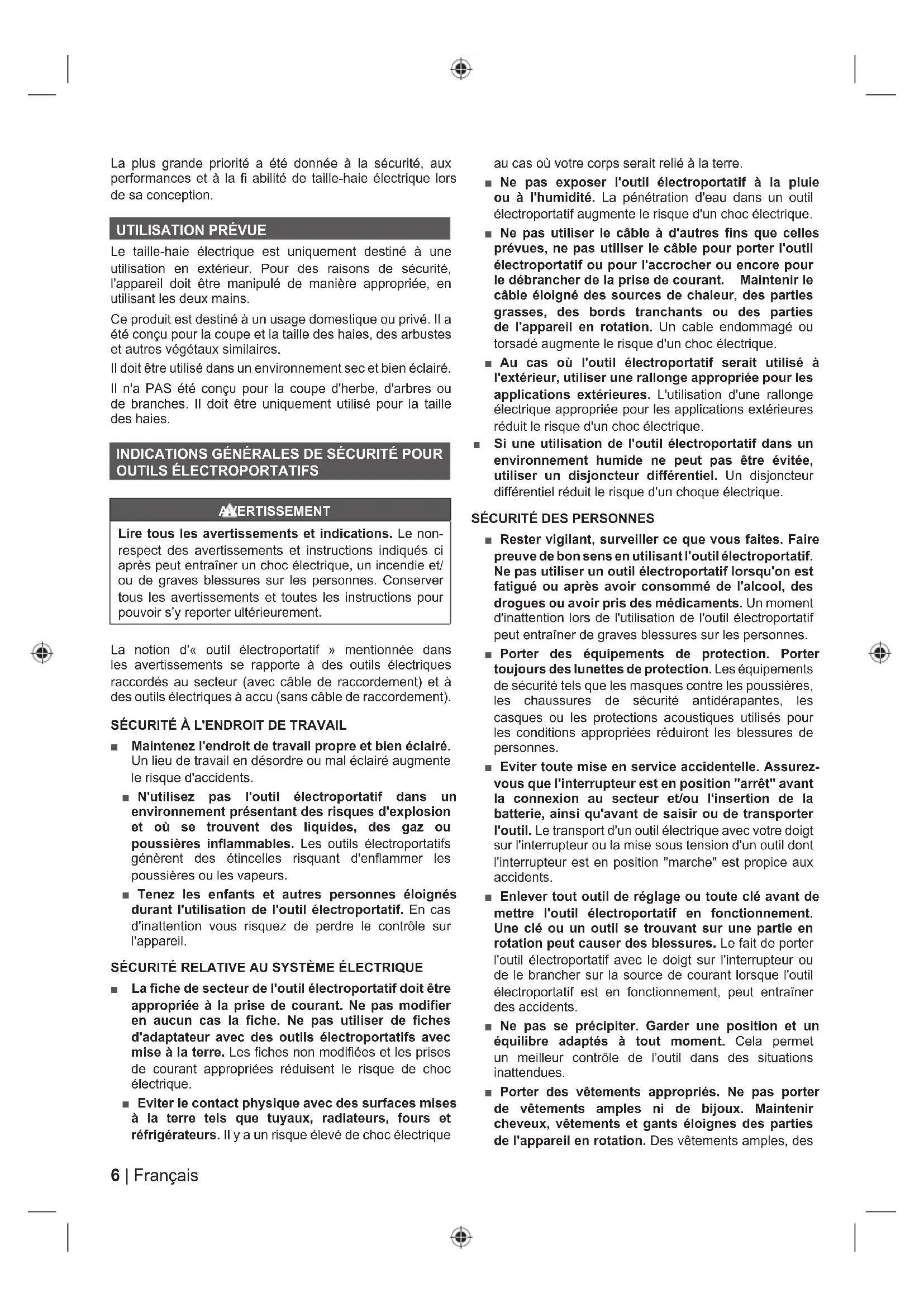 Le taille-haie électrique est uniquement destiné à une utilisation en extérieur. Pour des raisons de sécurité, l'appareil doit être manipulé de manière appropriée, en utilisant les deux mains. Ce produit est destiné à un usage domestique ou privé. Il a été conçu pour la coupe et la taille des haies, des arbustes et autres végétaux similaires. Il doit être utilisé dans un environnement sec et bien éclairé. Il n'a PAS été conçu pour la coupe d'herbe, d'arbres ou de branches. Il doit être uniquement utilisé pour la taille des haies. INDICATIONS GÉNÉRALES DE SÉCURITÉ POUR OUTILS ÉLECTROPORTATIFS AVERTISSEMENT Lire tous les avertissements et indications. Le non- respect des avertissements et instructions indiqués ci après peut entraîner un choc électrique, un incendie et/ ou de graves blessures sur les personnes. Conserver tous les avertissements et toutes les instructions pour pouvoir s’y reporter ultérieurement. La notion d'« outil électroportatif » mentionnée dans les avertissements se rapporte à des outils électriques raccordés au secteur (avec câble de raccordement) et à des outils électriques à accu (sans câble de raccordement).