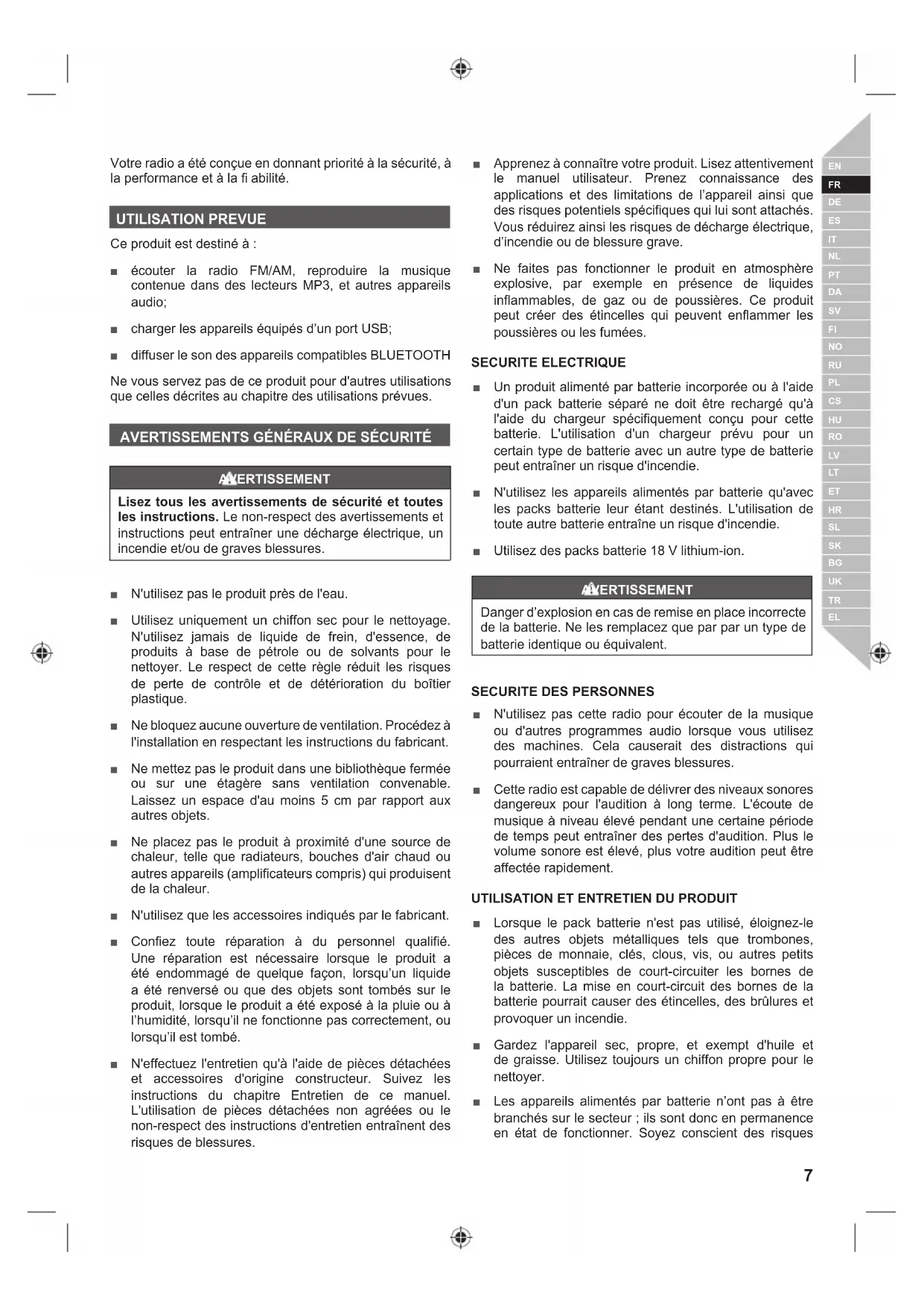 Votre radio a été conçue en donnant priorité à la sécurité, à la performance et à la fi abilité. UTILISATION PREVUE Ce produit est destiné à : ■ écouter la radio FM/AM, reproduire la musique contenue dans des lecteurs MP3, et autres appareils audio; ■ charger les appareils équipés d’un port USB; ■ diffuser le son des appareils compatibles BLUETOOTH Ne vous servez pas de ce produit pour d'autres utilisations que celles décrites au chapitre des utilisations prévues. AVERTISSEMENTS GÉNÉRAUX DE SÉCURITÉ AVERTISSEMENT Lisez tous les avertissements de sécurité et toutes les instructions. Le non-respect des avertissements et instructions peut entraîner une décharge électrique, un incendie et/ou de graves blessures. ■ N'utilisez pas le produit près de l'eau. ■ Utilisez uniquement un chiffon sec pour le nettoyage. N'utilisez jamais de liquide de frein, d'essence, de produits à base de pétrole ou de solvants pour le nettoyer. Le respect de cette règle réduit les risques de perte de contrôle et de détérioration du boîtier plastique. ■ Ne bloquez aucune ouverture de ventilation. Procédez à l'installation en respectant les instructions du fabricant. ■ Ne mettez pas le produit dans une bibliothèque fermée ou sur une étagère sans ventilation convenable. Laissez un espace d'au moins 5 cm par rapport aux autres objets. ■ Ne placez pas le produit à proximité d'une source de chaleur, telle que radiateurs, bouches d'air chaud ou autres appareils (amplificateurs compris) qui produisent de la chaleur. ■ N'utilisez que les accessoires indiqués par le fabricant. ■ Confiez toute réparation à du personnel qualifié. Une réparation est nécessaire lorsque le produit a été endommagé de quelque façon, lorsqu’un liquide a été renversé ou que des objets sont tombés sur le produit, lorsque le produit a été exposé à la pluie ou à l’humidité, lorsqu’il ne fonctionne pas correctement, ou lorsqu’il est tombé. ■ N'effectuez l'entretien qu'à l'aide de pièces détachées et accessoires d'origine constructeur. Suivez les instructions du chapitre Entretien de ce manuel. L'utilisation de pièces détachées non agréées ou le non-respect des instructions d'entretien entraînent des risques de blessures. ■ Apprenez à connaître votre produit. Lisez attentivement le manuel utilisateur. Prenez connaissance des applications et des limitations de l’appareil ainsi que des risques potentiels spécifiques qui lui sont attachés. Vous réduirez ainsi les risques de décharge électrique, d’incendie ou de blessure grave. ■ Ne faites pas fonctionner le produit en atmosphère explosive, par exemple en présence de liquides inflammables, de gaz ou de poussières. Ce produit peut créer des étincelles qui peuvent enflammer les poussières ou les fumées. SECURITE ELECTRIQUE ■ Un produit alimenté par batterie incorporée ou à l'aide d'un pack batterie séparé ne doit être rechargé qu'à l'aide du chargeur spécifiquement conçu pour cette batterie. L'utilisation d'un chargeur prévu pour un certain type de batterie avec un autre type de batterie peut entraîner un risque d'incendie. ■ N'utilisez les appareils alimentés par batterie qu'avec les packs batterie leur étant destinés. L'utilisation de toute autre batterie entraîne un risque d'incendie. ■ Utilisez des packs batterie 18 V lithium-ion. AVERTISSEMENT Danger d’explosion en cas de remise en place incorrecte de la batterie. Ne les remplacez que par par un type de batterie identique ou équivalent.