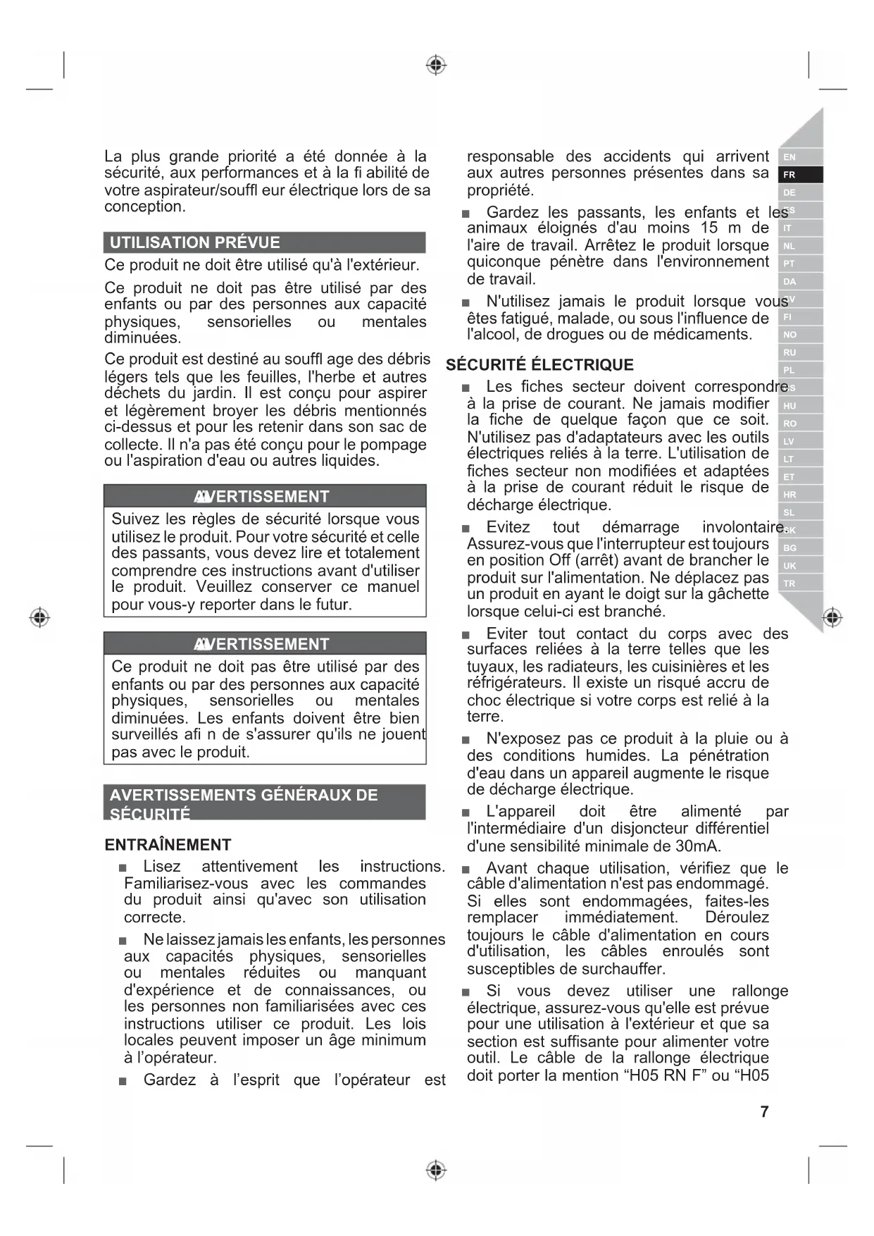 Ce produit ne doit être utilisé qu'à l'extérieur. Ce produit ne doit pas être utilisé par des enfants ou par des personnes aux capacité physiques, sensorielles ou mentales diminuées. Ce produit est destiné au souffl age des débris légers tels que les feuilles, l'herbe et autres déchets du jardin. Il est conçu pour aspirer et légèrement broyer les débris mentionnés ci-dessus et pour les retenir dans son sac de collecte. Il n'a pas été conçu pour le pompage ou l'aspiration d'eau ou autres liquides. AVERTISSEMENT Suivez les règles de sécurité lorsque vous utilisez le produit. Pour votre sécurité et celle des passants, vous devez lire et totalement comprendre ces instructions avant d'utiliser le produit. Veuillez conserver ce manuel pour vous-y reporter dans le futur. AVERTISSEMENT Ce produit ne doit pas être utilisé par des enfants ou par des personnes aux capacité physiques, sensorielles ou mentales diminuées. Les enfants doivent être bien surveillés afi n de s'assurer qu'ils ne jouent pas avec le produit.