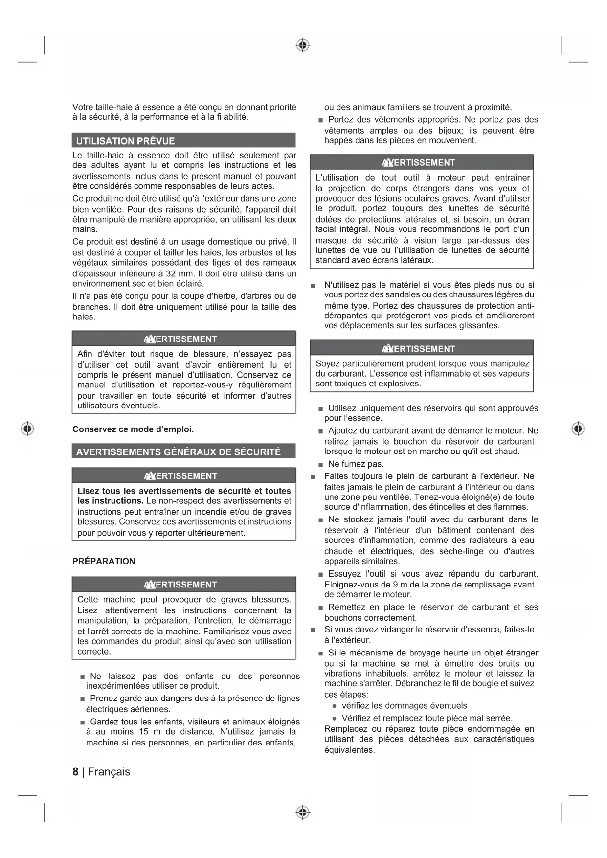 Le taille-haie à essence doit être utilisé seulement par des adultes ayant lu et compris les instructions et les avertissements inclus dans le présent manuel et pouvant être considérés comme responsables de leurs actes. Ce produit ne doit être utilisé qu'à l'extérieur dans une zone bien ventilée. Pour des raisons de sécurité, l'appareil doit être manipulé de manière appropriée, en utilisant les deux mains. Ce produit est destiné à un usage domestique ou privé. Il est destiné à couper et tailler les haies, les arbustes et les végétaux similaires possédant des tiges et des rameaux d'épaisseur inférieure à 32 mm. Il doit être utilisé dans un environnement sec et bien éclairé. Il n'a pas été conçu pour la coupe d'herbe, d'arbres ou de branches. Il doit être uniquement utilisé pour la taille des haies. AVERTISSEMENT Afin d'éviter tout risque de blessure, n’essayez pas d’utiliser cet outil avant d’avoir entièrement lu et compris le présent manuel d’utilisation. Conservez ce manuel d’utilisation et reportez-vous-y régulièrement pour travailler en toute sécurité et informer d’autres utilisateurs éventuels. Conservez ce mode d’emploi. AVERTISSEMENTS GÉNÉRAUX DE SÉCURITÉ AVERTISSEMENT Lisez tous les avertissements de sécurité et toutes les instructions. Le non-respect des avertissements et instructions peut entraîner un incendie et/ou de graves blessures. Conservez ces avertissements et instructions pour pouvoir vous y reporter ultérieurement. PRÉPARATION AVERTISSEMENT Cette machine peut provoquer de graves blessures. Lisez attentivement les instructions concernant la manipulation, la préparation, l'entretien, le démarrage et l'arrêt corrects de la machine. Familiarisez-vous avec les commandes du produit ainsi qu'avec son utilisation correcte. ■ Ne laissez pas des enfants ou des personnes inexpérimentées utiliser ce produit. ■ Prenez garde aux dangers dus à la présence de lignes électriques aériennes. ■ Gardez tous les enfants, visiteurs et animaux éloignés à au moins 15 m de distance. N'utilisez jamais la machine si des personnes, en particulier des enfants, ou des animaux familiers se trouvent à proximité. ■ Portez des vêtements appropriés. Ne portez pas des vêtements amples ou des bijoux; ils peuvent être happés dans les pièces en mouvement. AVERTISSEMENT L’utilisation de tout outil à moteur peut entraîner la projection de corps étrangers dans vos yeux et provoquer des lésions oculaires graves. Avant d'utiliser le produit, portez toujours des lunettes de sécurité dotées de protections latérales et, si besoin, un écran facial intégral. Nous vous recommandons le port d’un masque de sécurité à vision large par-dessus des lunettes de vue ou l’utilisation de lunettes de sécurité standard avec écrans latéraux. ■ N'utilisez pas le matériel si vous êtes pieds nus ou si vous portez des sandales ou des chaussures légères du même type. Portez des chaussures de protection anti- dérapantes qui protégeront vos pieds et amélioreront vos déplacements sur les surfaces glissantes. AVERTISSEMENT Soyez particulièrement prudent lorsque vous manipulez du carburant. L'essence est inflammable et ses vapeurs sont toxiques et explosives. ■ Utilisez uniquement des réservoirs qui sont approuvés pour l’essence. ■ Ajoutez du carburant avant de démarrer le moteur. Ne retirez jamais le bouchon du réservoir de carburant lorsque le moteur est en marche ou qu'il est chaud. ■ Ne fumez pas. ■ Faites toujours le plein de carburant à l'extérieur. Ne faites jamais le plein de carburant à l’intérieur ou dans une zone peu ventilée. Tenez-vous éloigné(e) de toute source d'inflammation, des étincelles et des flammes. ■ Ne stockez jamais l'outil avec du carburant dans le réservoir à l'intérieur d'un bâtiment contenant des sources d'inflammation, comme des radiateurs à eau chaude et électriques, des sèche-linge ou d'autres appareils similaires. ■ Essuyez l'outil si vous avez répandu du carburant. Eloignez-vous de 9 m de la zone de remplissage avant de démarrer le moteur. ■ Remettez en place le réservoir de carburant et ses bouchons correctement. ■ Si vous devez vidanger le réservoir d'essence, faites-le à l'extérieur. ■ Si le mécanisme de broyage heurte un objet étranger ou si la machine se met à émettre des bruits ou vibrations inhabituels, arrêtez le moteur et laissez la machine s'arrêter. Débranchez le fil de bougie et suivez ces étapes: ● vérifiez les dommages éventuels ● Vérifiez et remplacez toute pièce mal serrée. Remplacez ou réparez toute pièce endommagée en utilisant des pièces détachées aux caractéristiques équivalentes.9 Français |