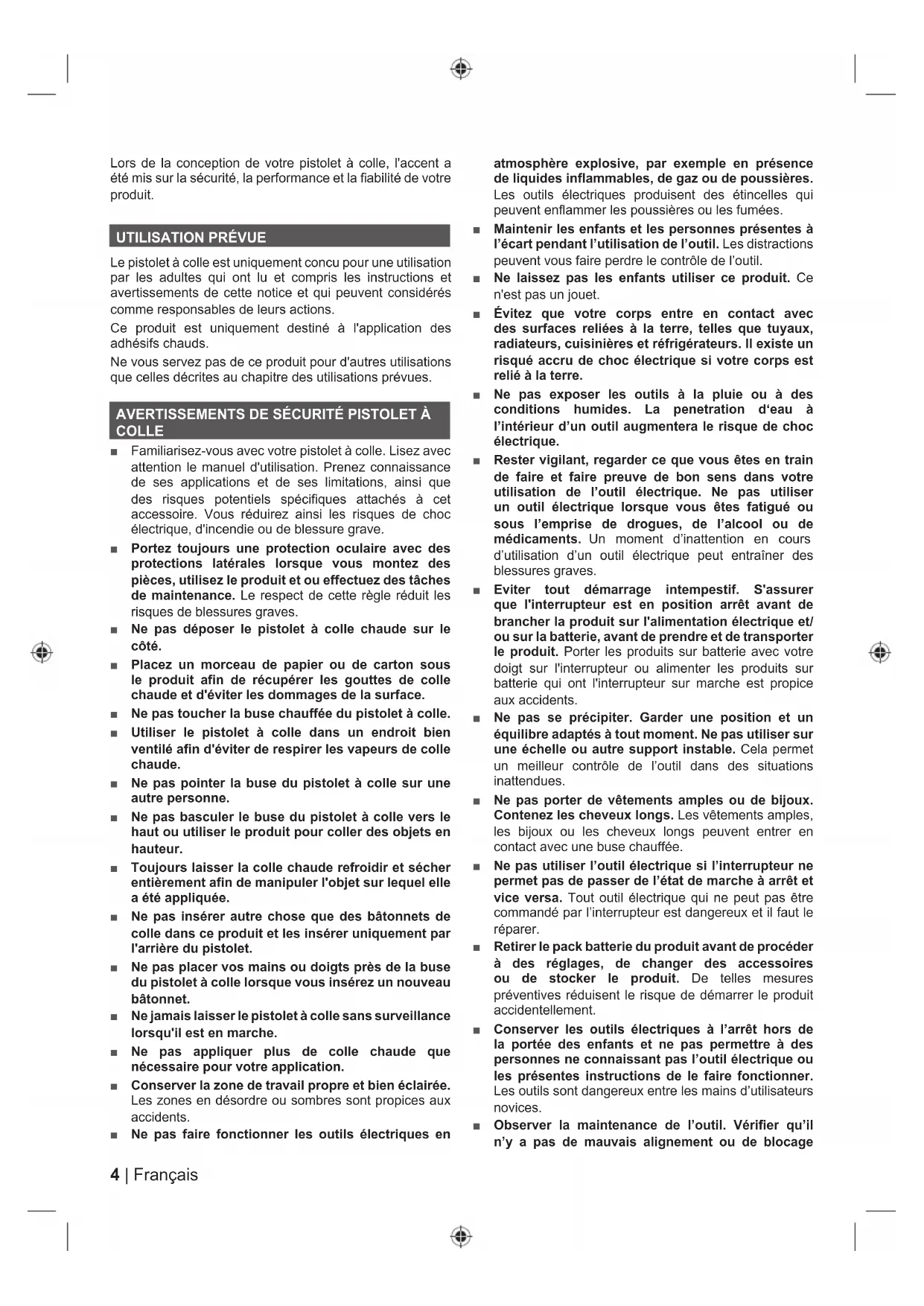 Le pistolet à colle est uniquement concu pour une utilisation par les adultes qui ont lu et compris les instructions et avertissements de cette notice et qui peuvent considérés comme responsables de leurs actions. Ce produit est uniquement destiné à l'application des adhésifs chauds. Ne vous servez pas de ce produit pour d'autres utilisations que celles décrites au chapitre des utilisations prévues.